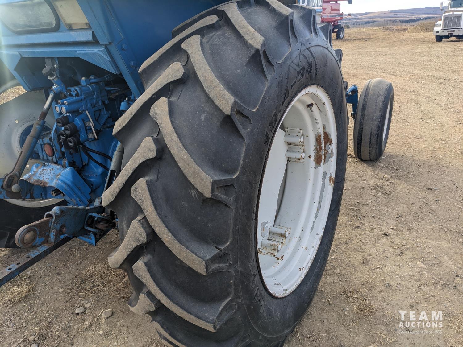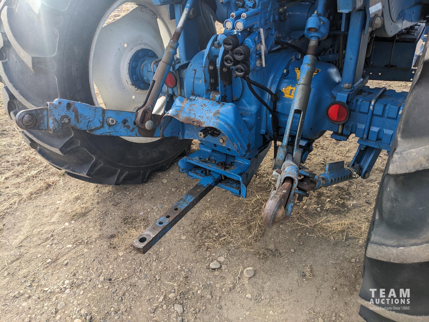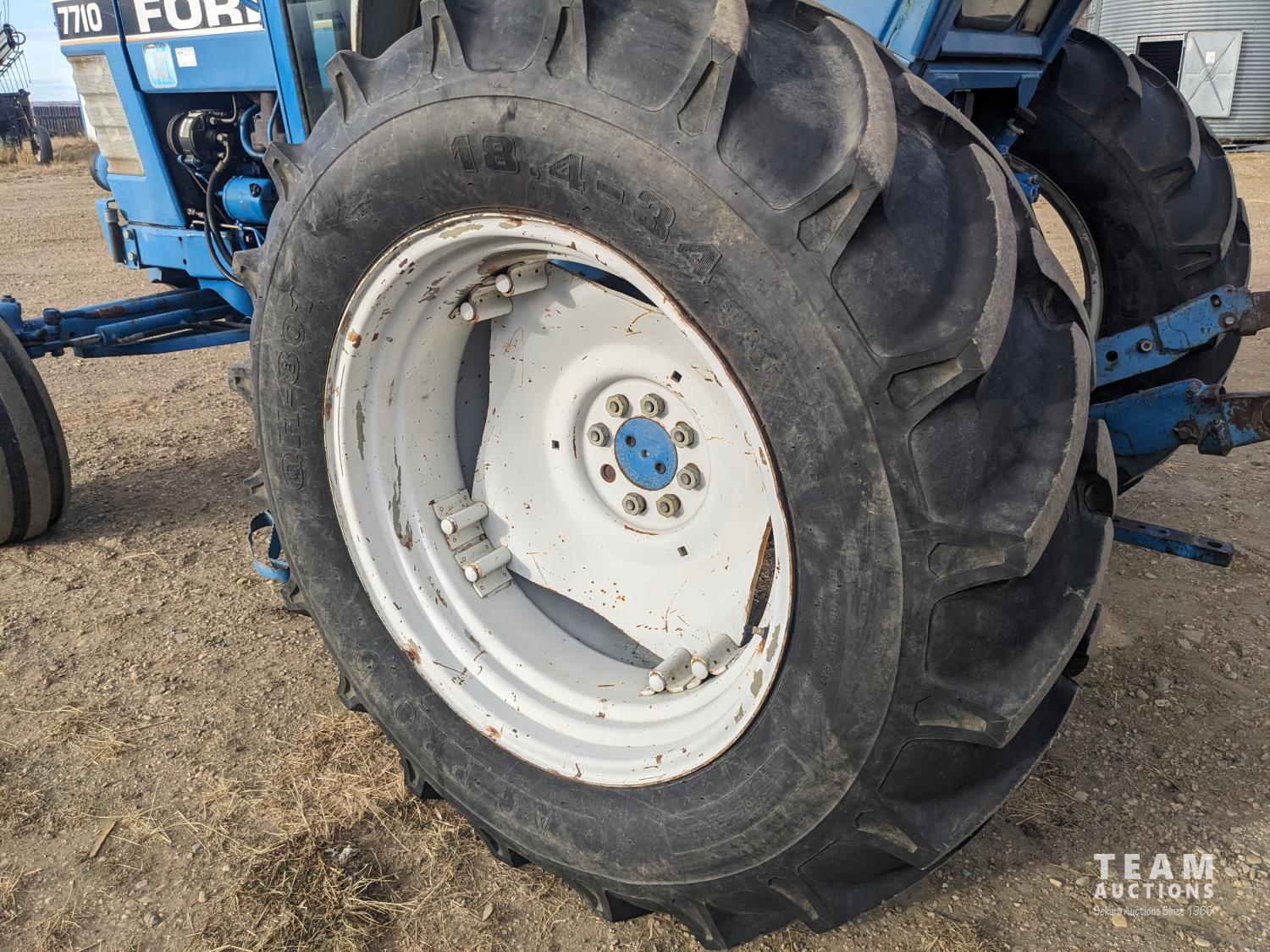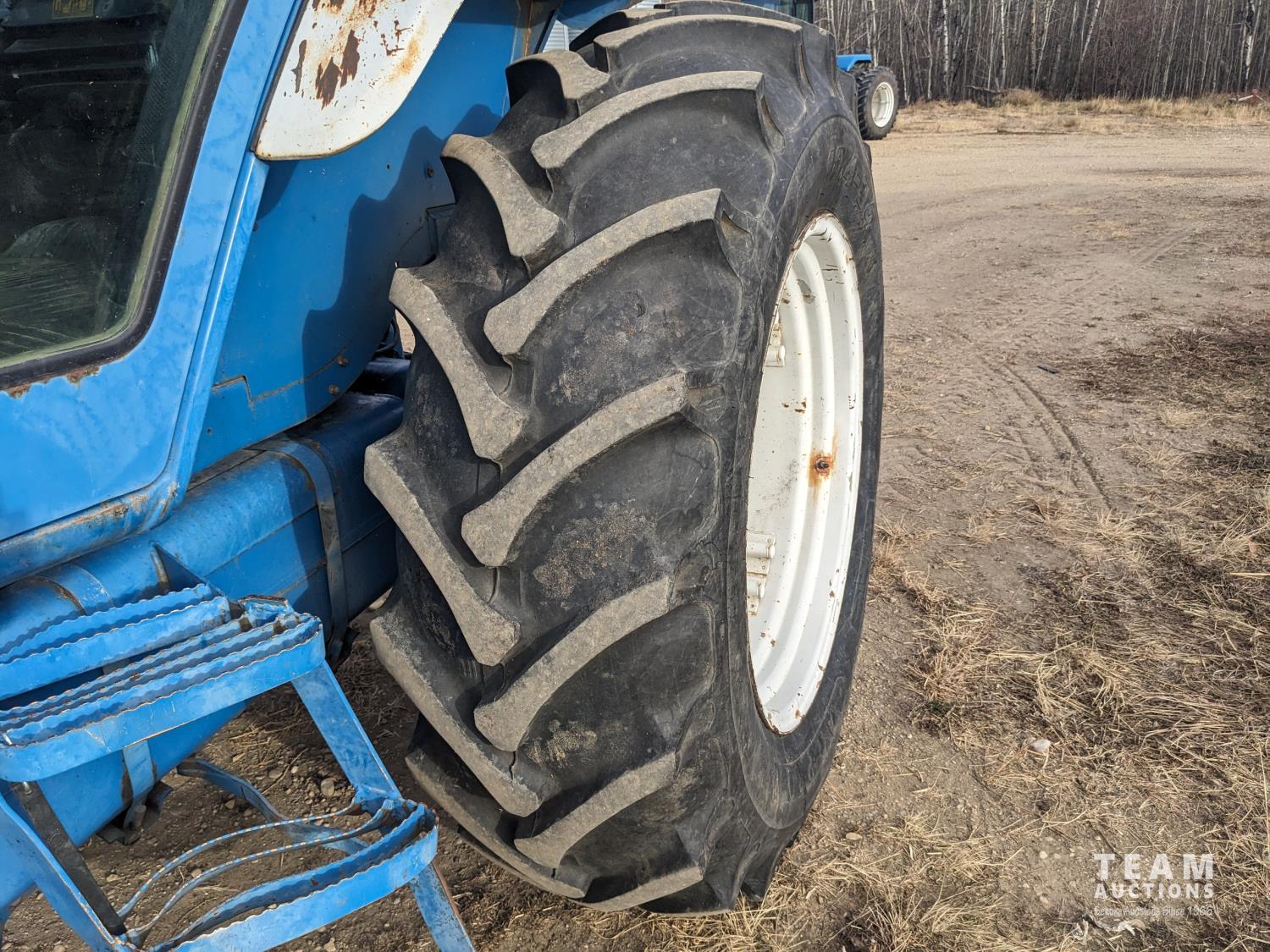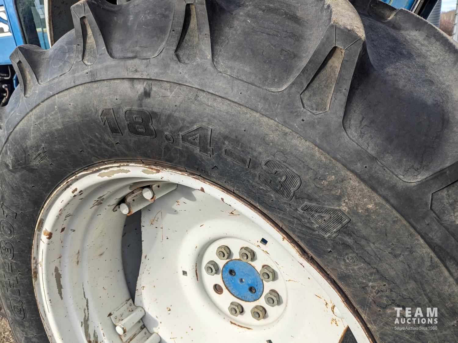 Ford 4.4 L 4 cylinder 97 HP, diesel engine, 86 PTO HP, 16 speed partial power shift transmission, cab, rear differential lock, A/C, radio, 540/1000 PTO, 3 point hitch, 2 rear hydraulic outlets, 10.00-16 front tires, 18.4-34 rear tires