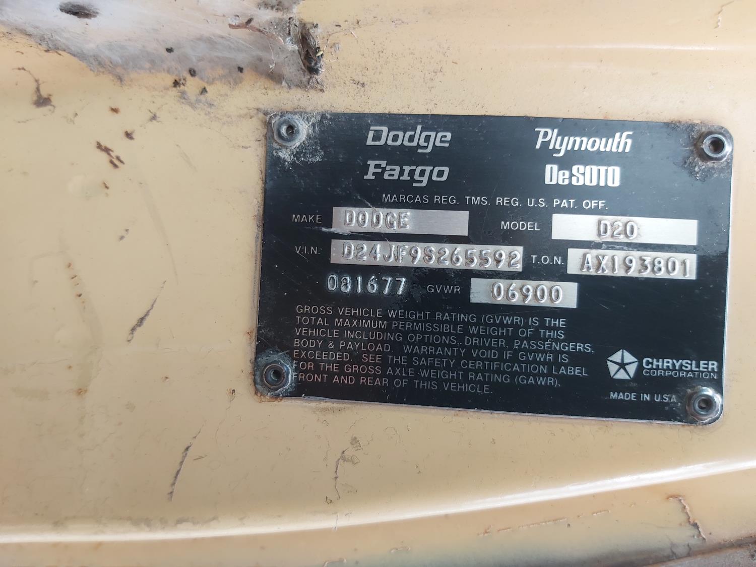 165 1979 Dodge D20 Regular Cab Pickup Truck (Inoperable)