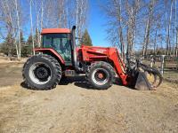 Case IH L300 loader, Q/A, 84 inch bucket, grapple, mid mount hydraulic connection, Cummins 5.9 6 cylinder 120 HP, engine, 105 PTO HP, 16 speed partial power shift transmission, cab, left hand reverser, rear differential lock, joystick, A/C, radio, upgraded stereo, 540/1000 PTO, 3 point hitch, 3 point hitch exterior control, 3 rear hydraulic outlets, rear wheel weights, 14.9-28 front tires, 18.4-38 rear tires