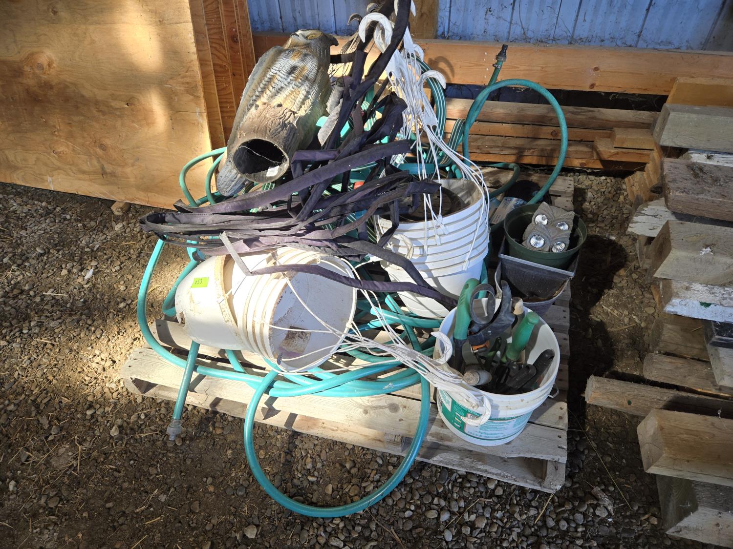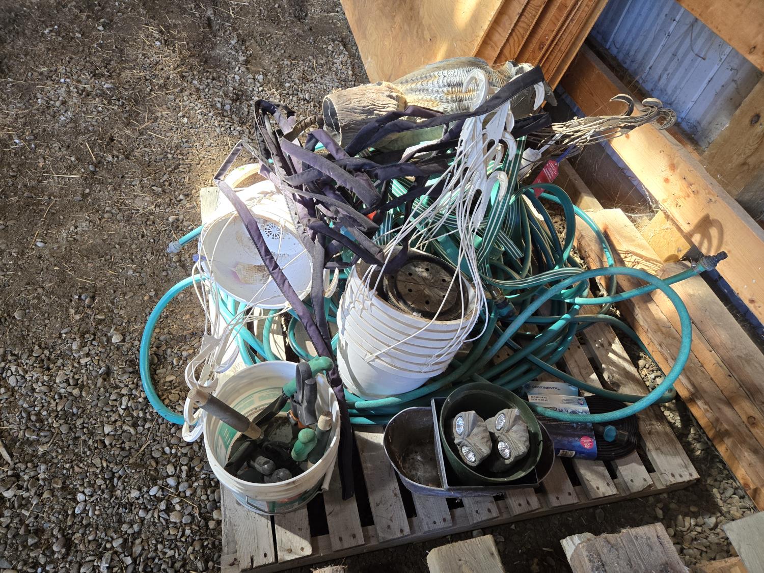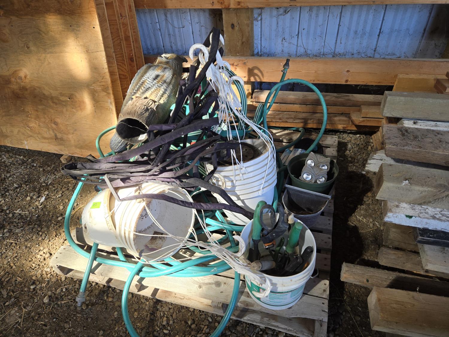 (6) garden hoses and connections, (18) hanging flower baskets, Qty of garden tools, (2) Solar light owl ornaments, plastic owl, (3) plant pots