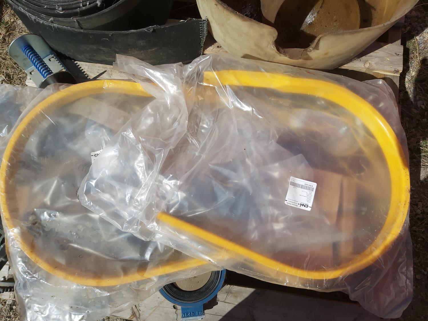 (2) funnels, oil catch pan, miscellaneous hardware, (3) actuators, (2) gate wheels, belting, baler pickup parts