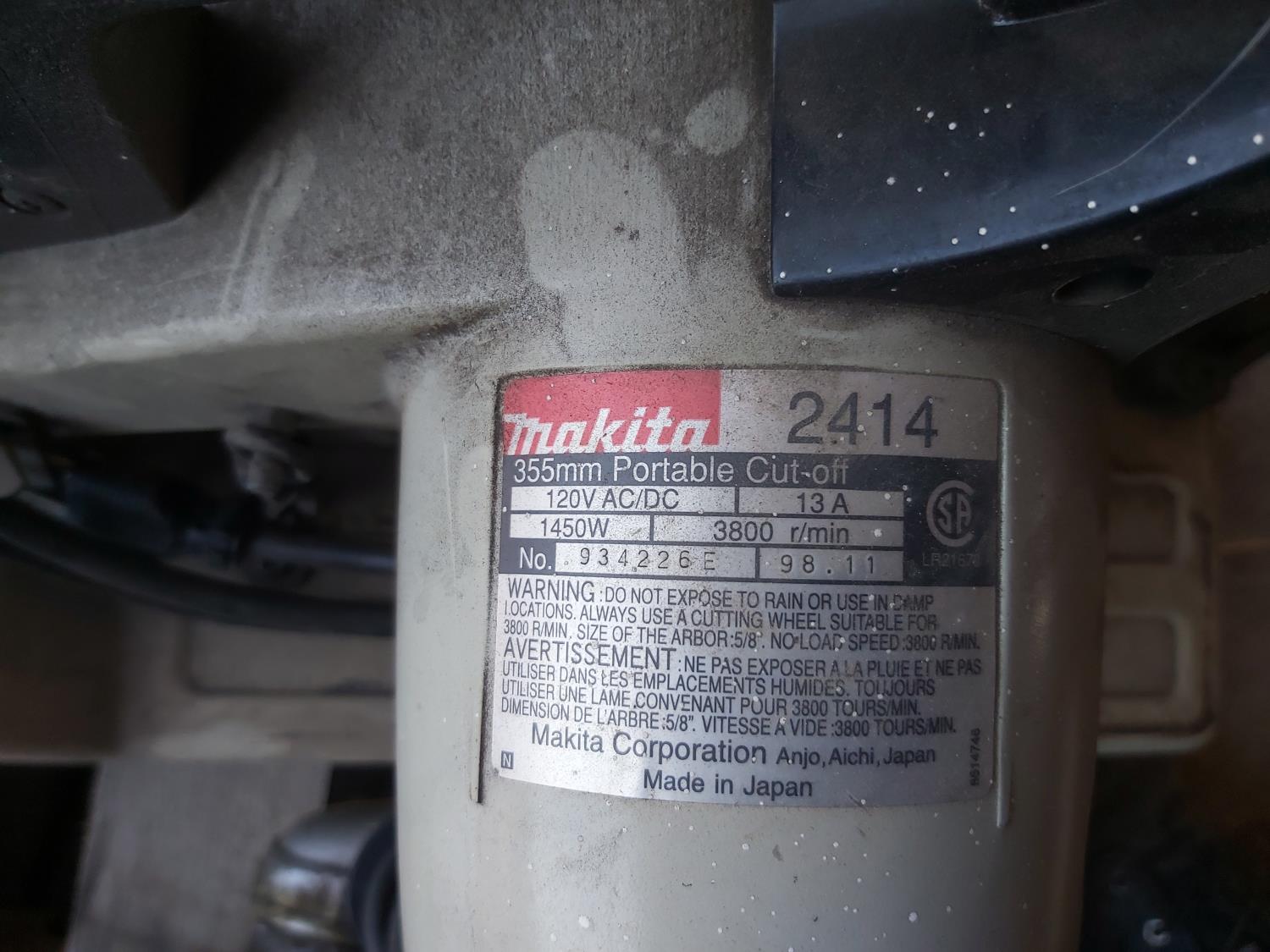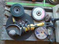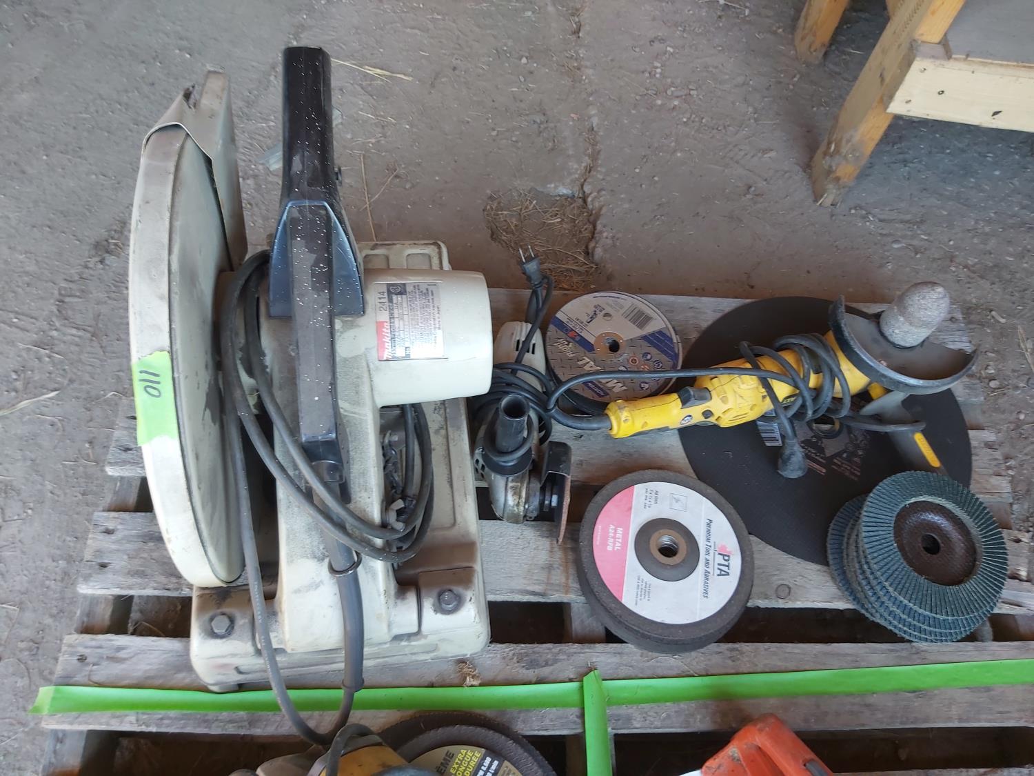 14 inch Makita Chop saw, (2) angle grinders, qty of grinding discs