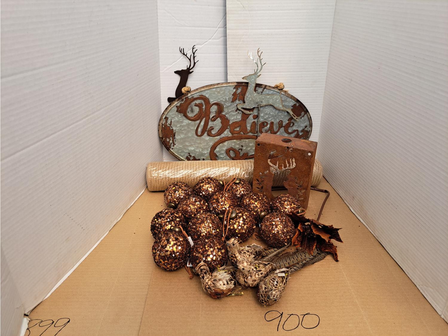 900 Copper Ornaments and Rustic Sign