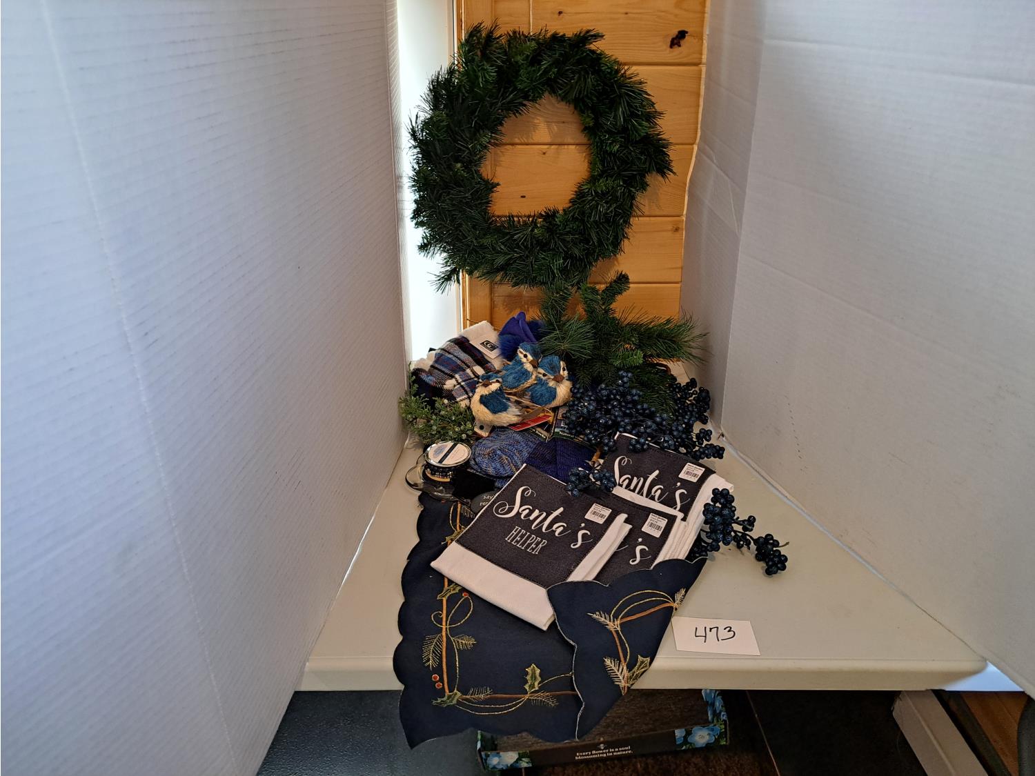 blue jay decor, wreath, Santa linen