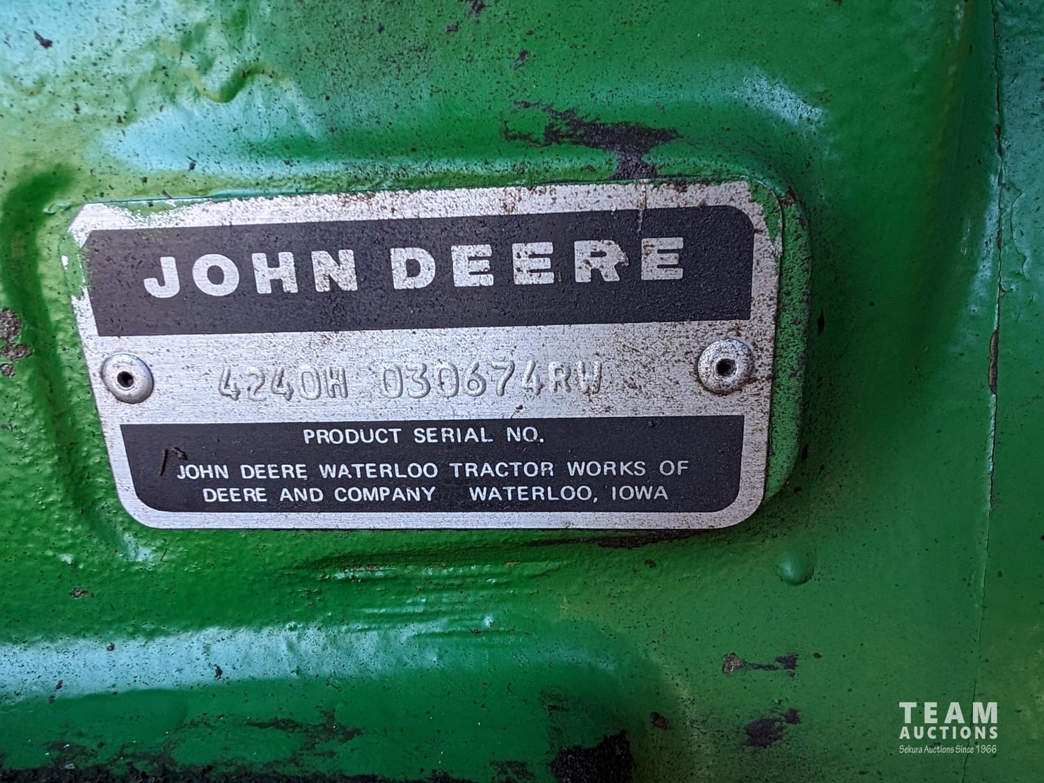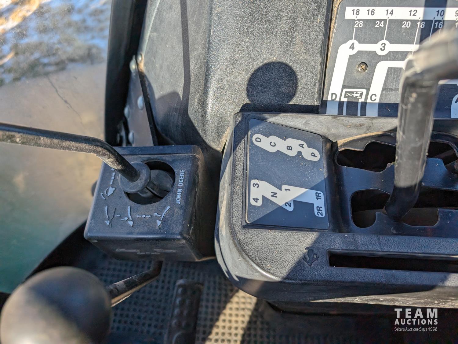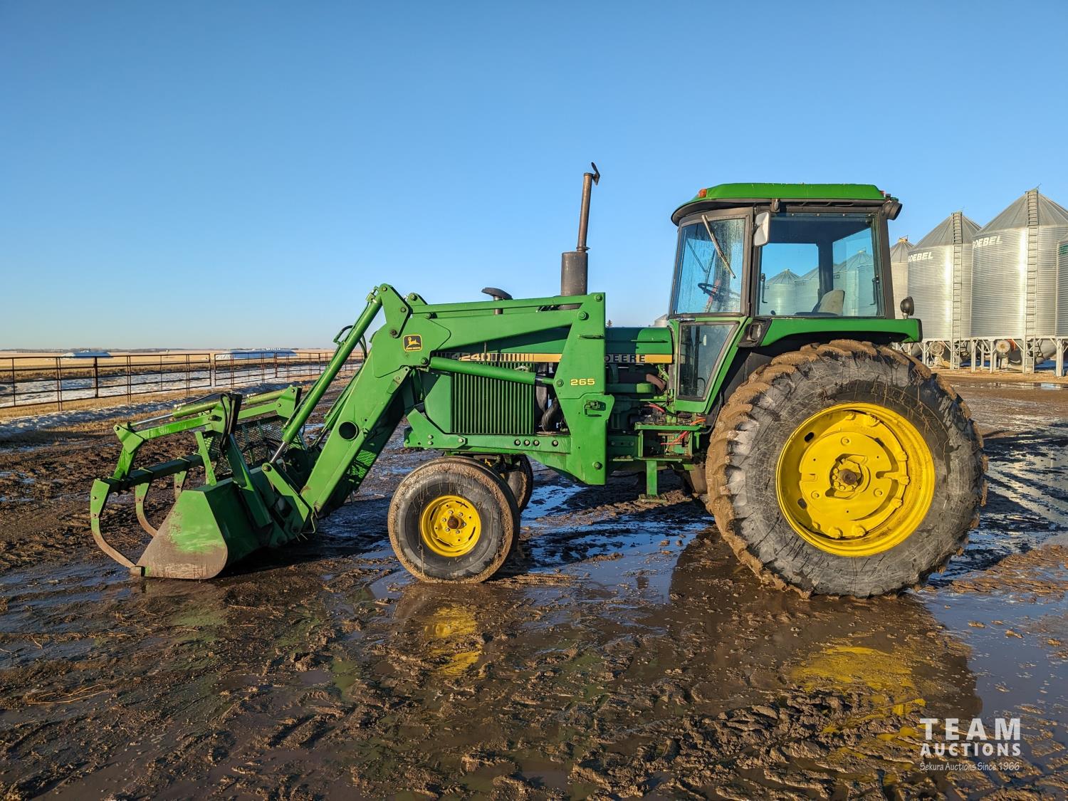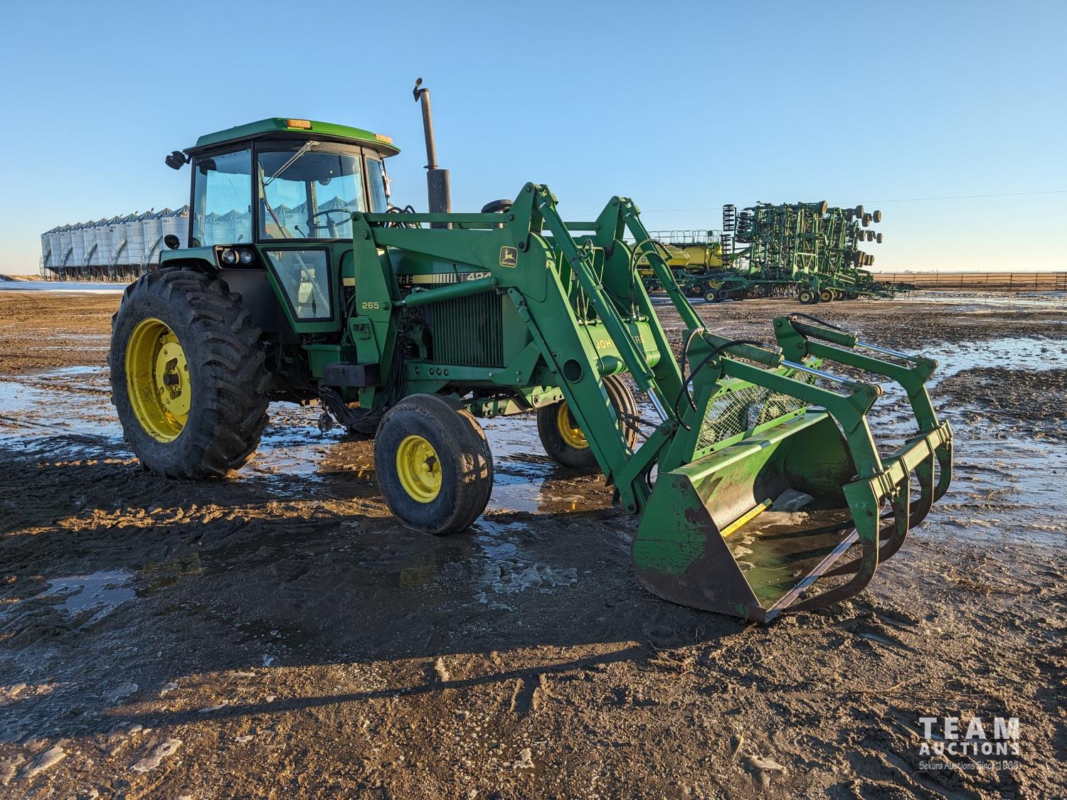John Deere 265 loader, grapple, 7.6 L 6 cylinder diesel engine, 110 PTO HP, 16 speed partial power shift transmission, cab, A/C, 540/1000 PTO, 3 rear hydraulic outlets, 11.00-16SL front tires, 20.8-38 rear tires