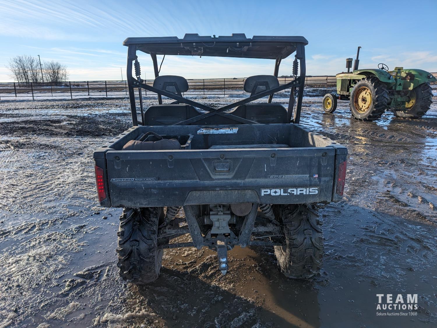 800 cc fuel injected water cooled engine, automatic transmission, Hi/Lo range, reverse, 2 passengers, power steering, manual dump box, hitch, 27X9-12 front tires, 27X11-12 rear tires