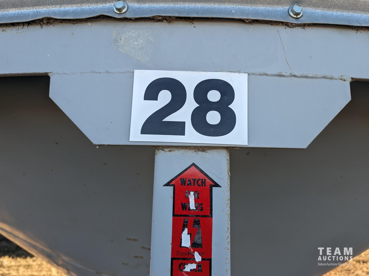 Bin #28, roof damage, Buyer responsible for removal, couple bushels of heated beans in the hopper, loose and will fall out