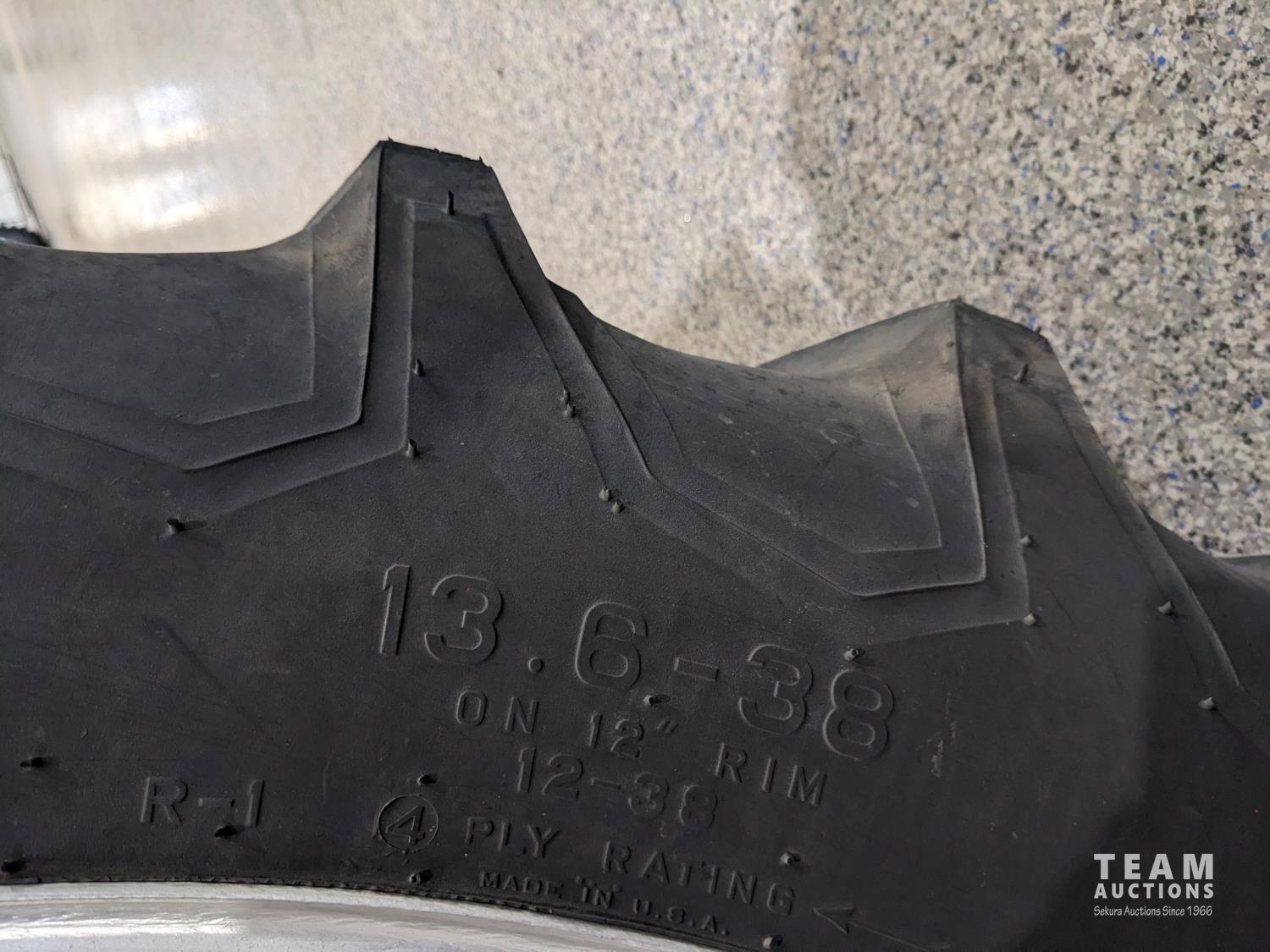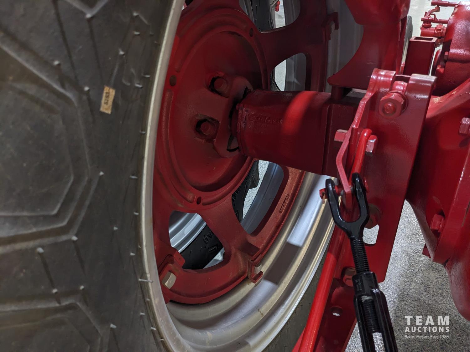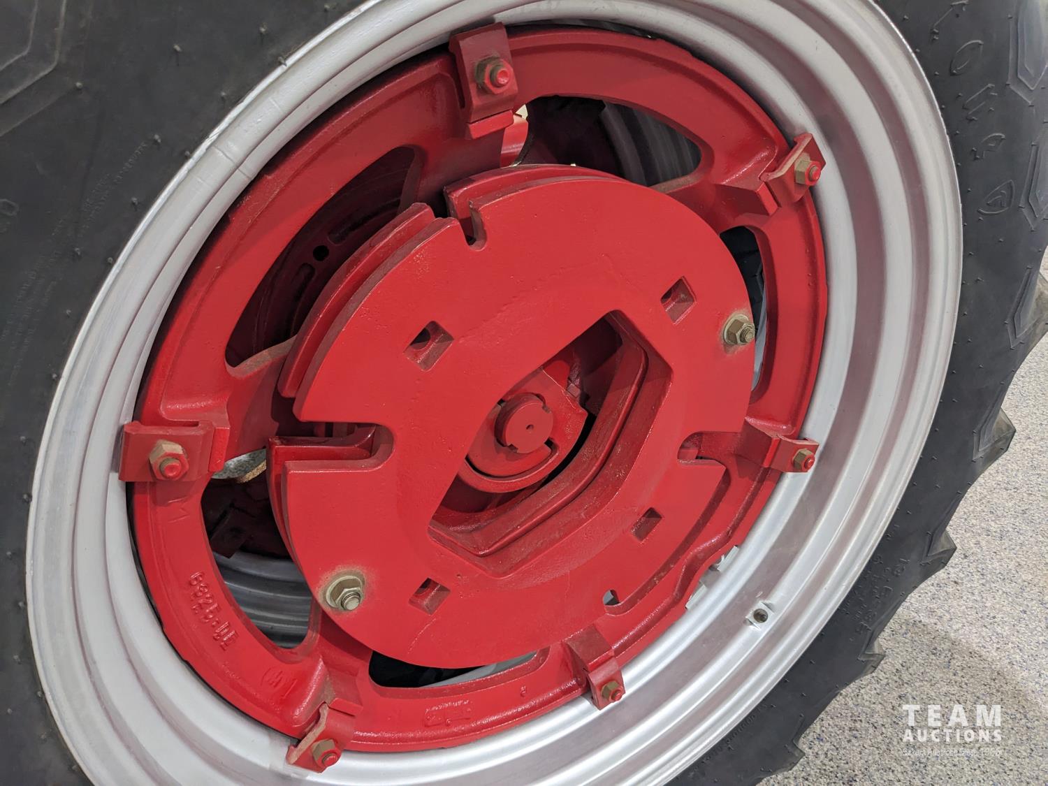 4 cylinder gas engine, 5 speed transmission, belt pulley, 540 PTO, rear weights, 6.50-16 front, 13.6-38 duals (all new front and rear tires)