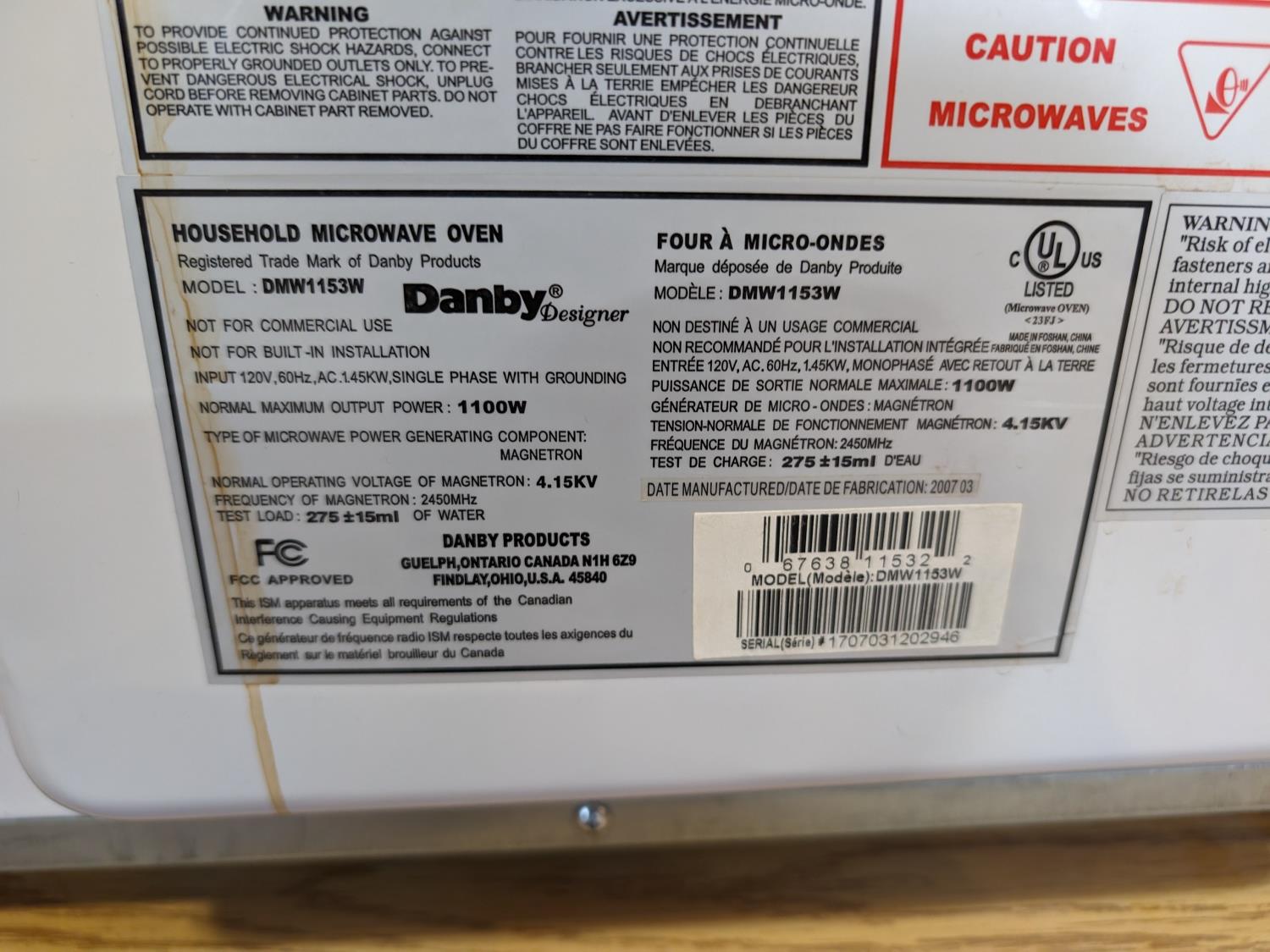1019 Danby DMW1153W Microwave