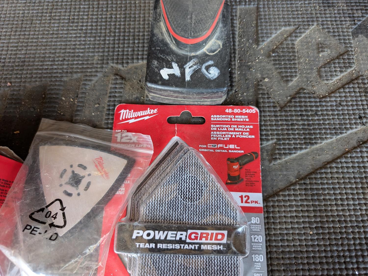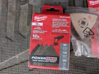 M12 red lithium high output XC3.0 battery pack, 12 pack assorted 80, 120 & 180 grit mesh sanding sheets, 36 pack assorted 80, 120 & 180 grit mesh sanding sheets