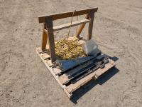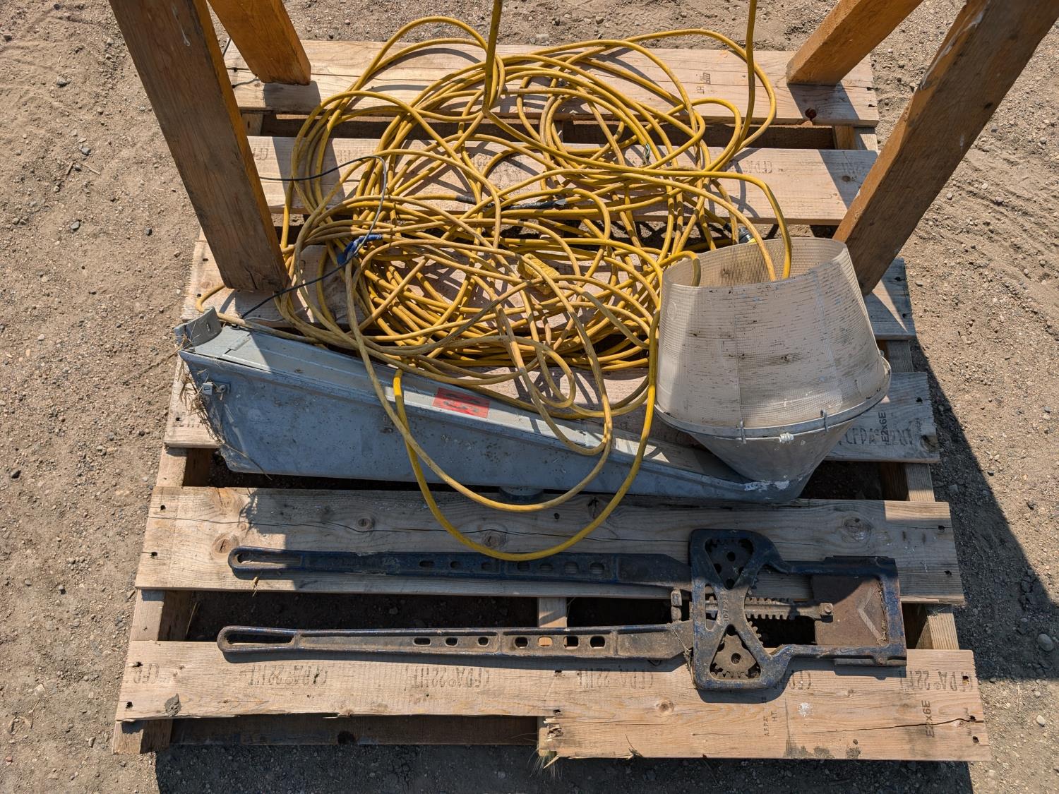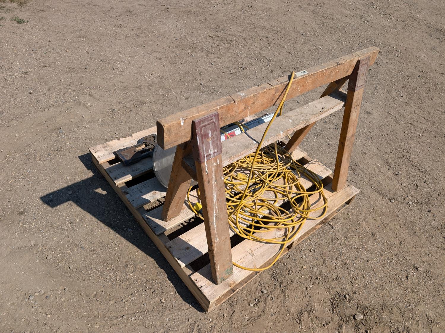 extension cord, wooden saw horse, horn shear, yard light