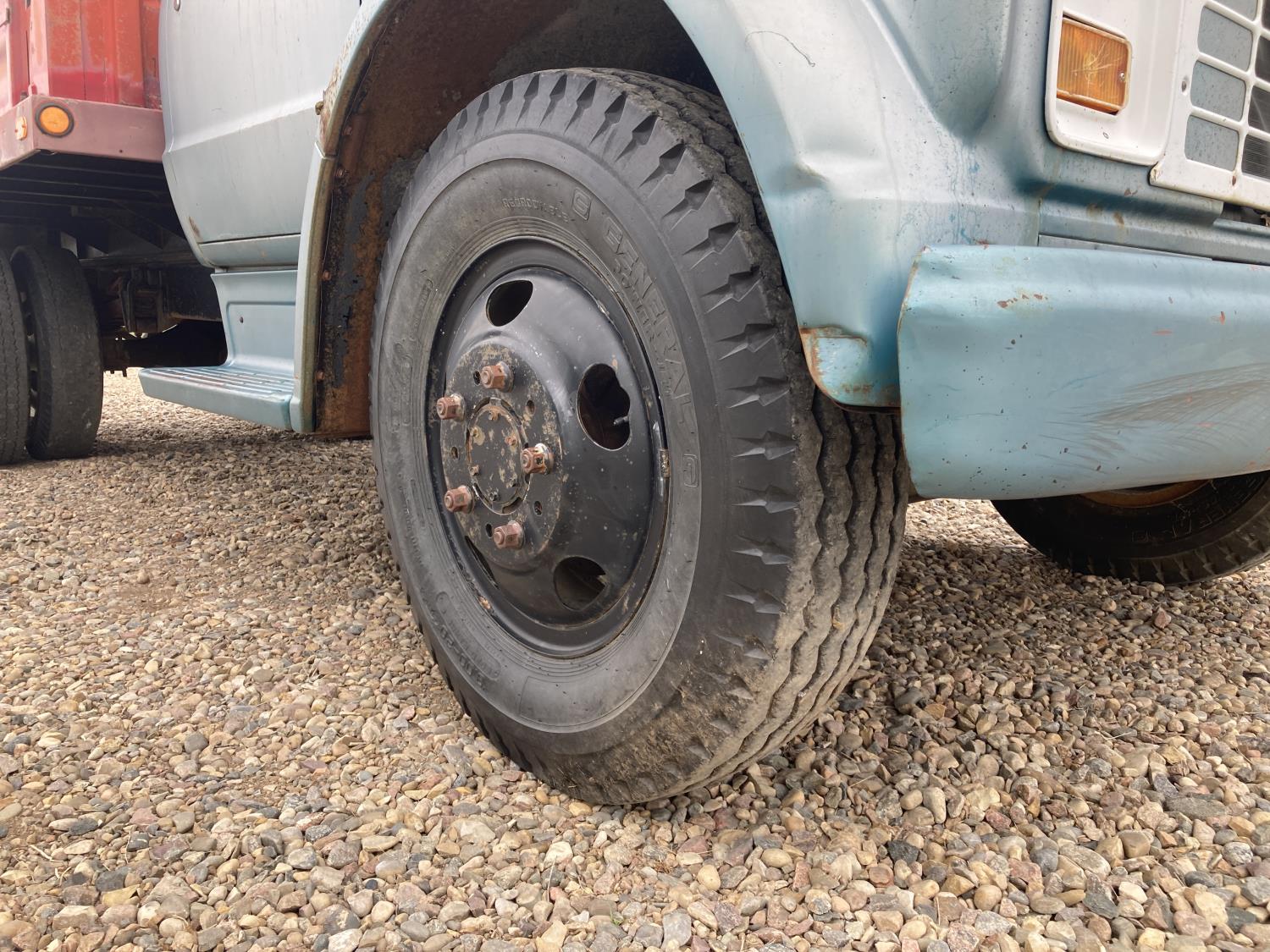 V8 gas engine, 5X2 manual transmission, 14 ft box, hoist, 9.00-20 tires