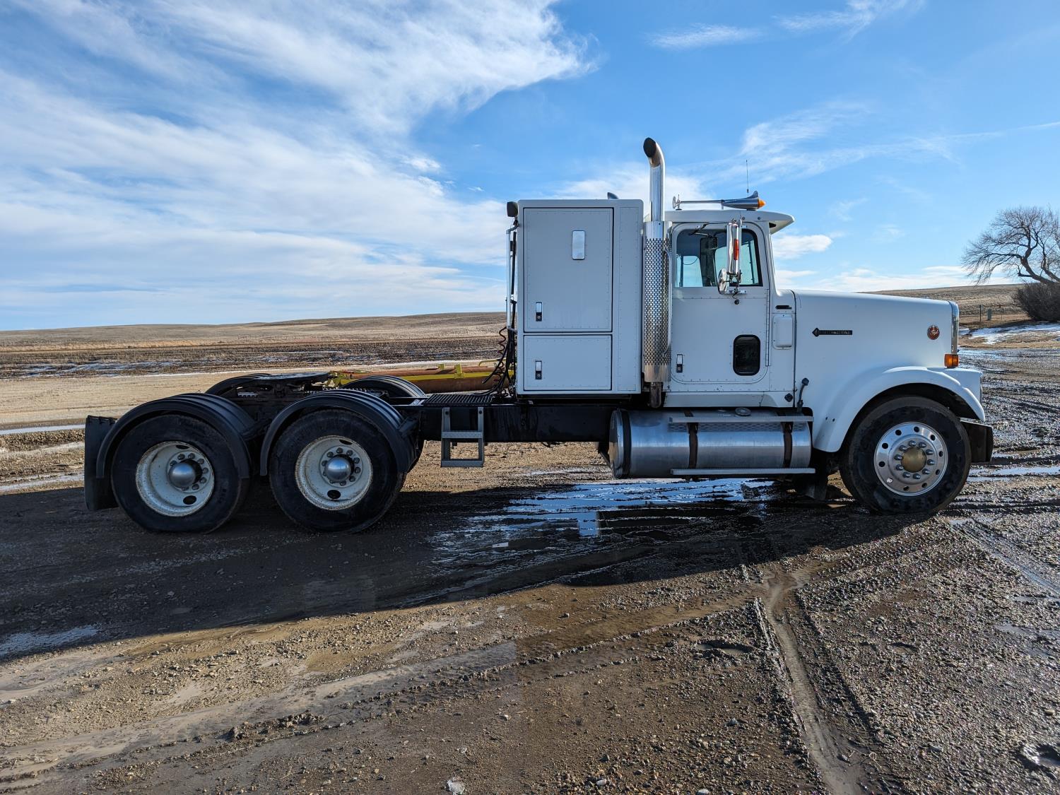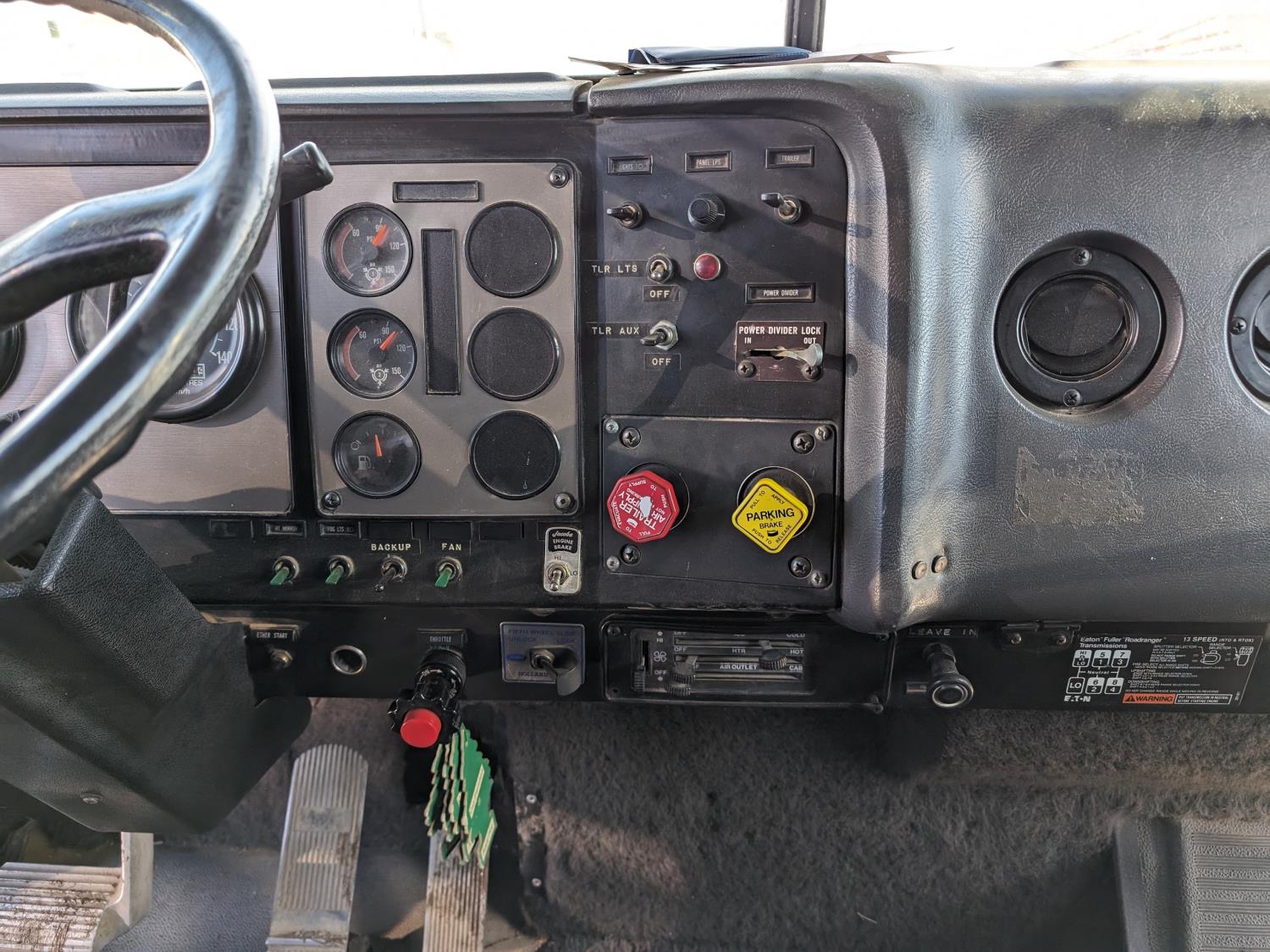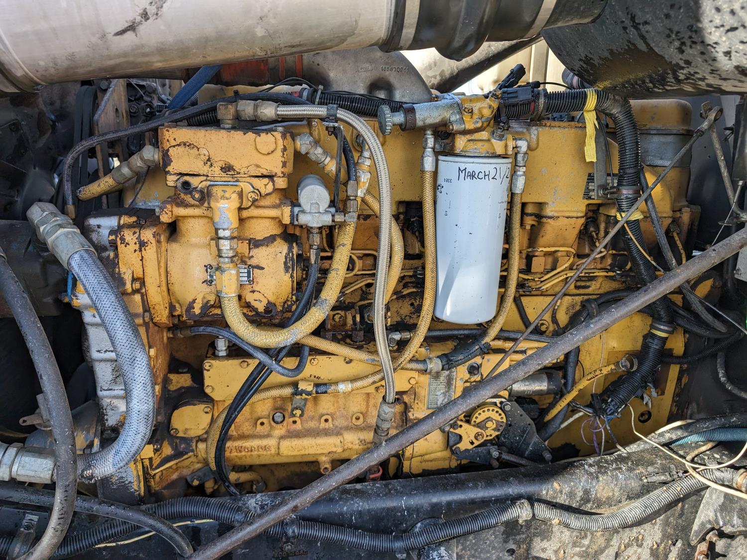 Caterpillar 3406B 14.6 L 6 cylinder 425 HP diesel engine, engine brake, Eaton Fuller 13 speed manual transmission, flat top 42 inch sleeper, radio, chain holders, air ride suspension, diff lock, 222 inch WB, aluminum front wheels, 11R24.5 tires