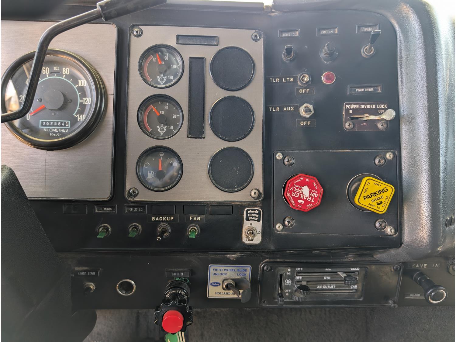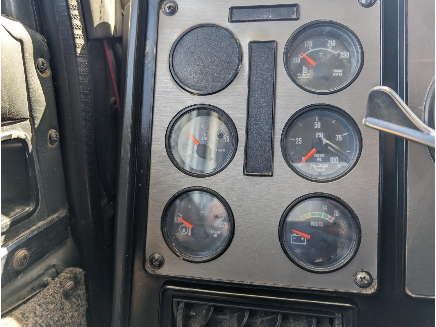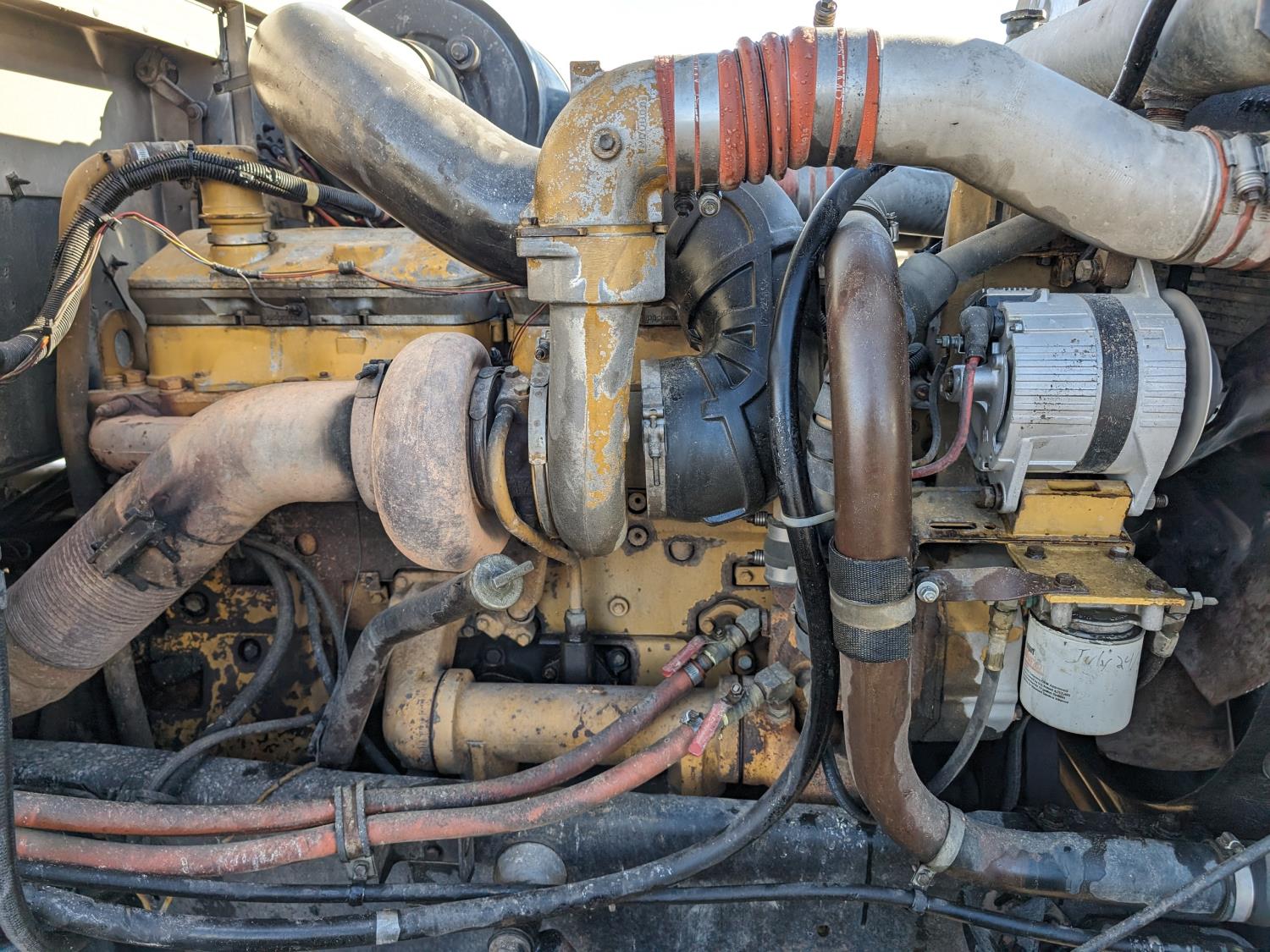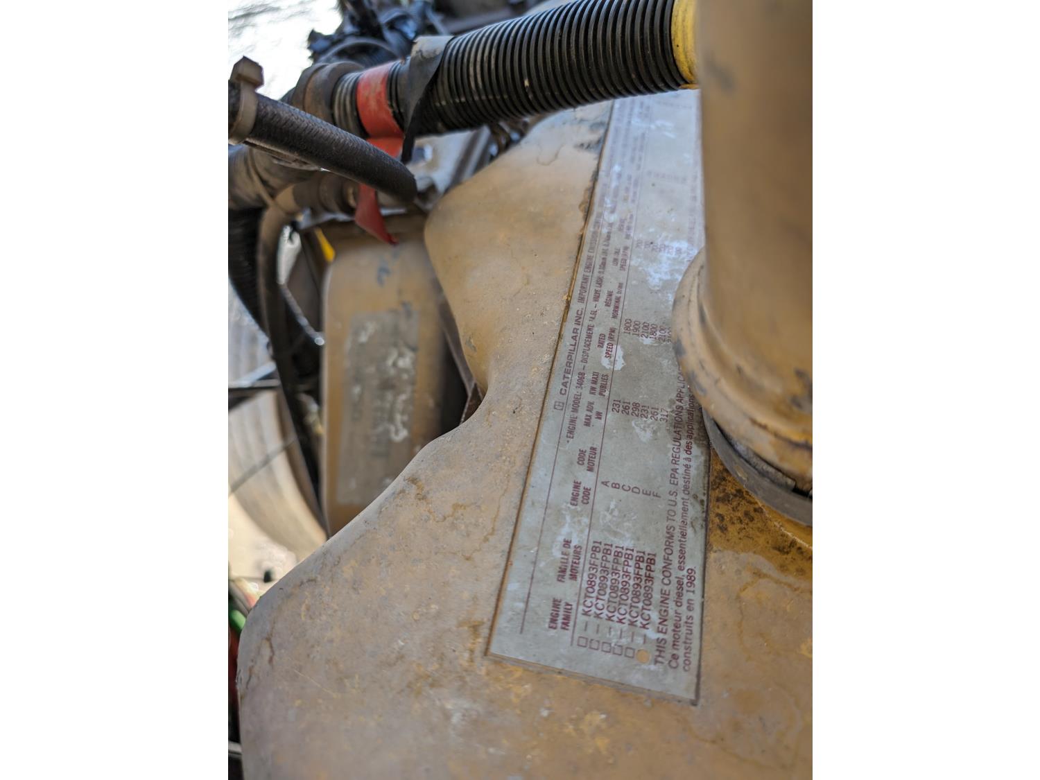 Caterpillar 3406B 14.6 L 6 cylinder 425 HP diesel engine, engine brake, Eaton Fuller 13 speed manual transmission, flat top 42 inch sleeper, radio, chain holders, air ride suspension, diff lock, 222 inch WB, aluminum front wheels, 11R24.5 tires