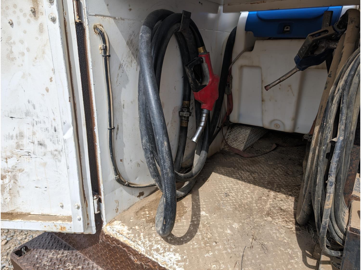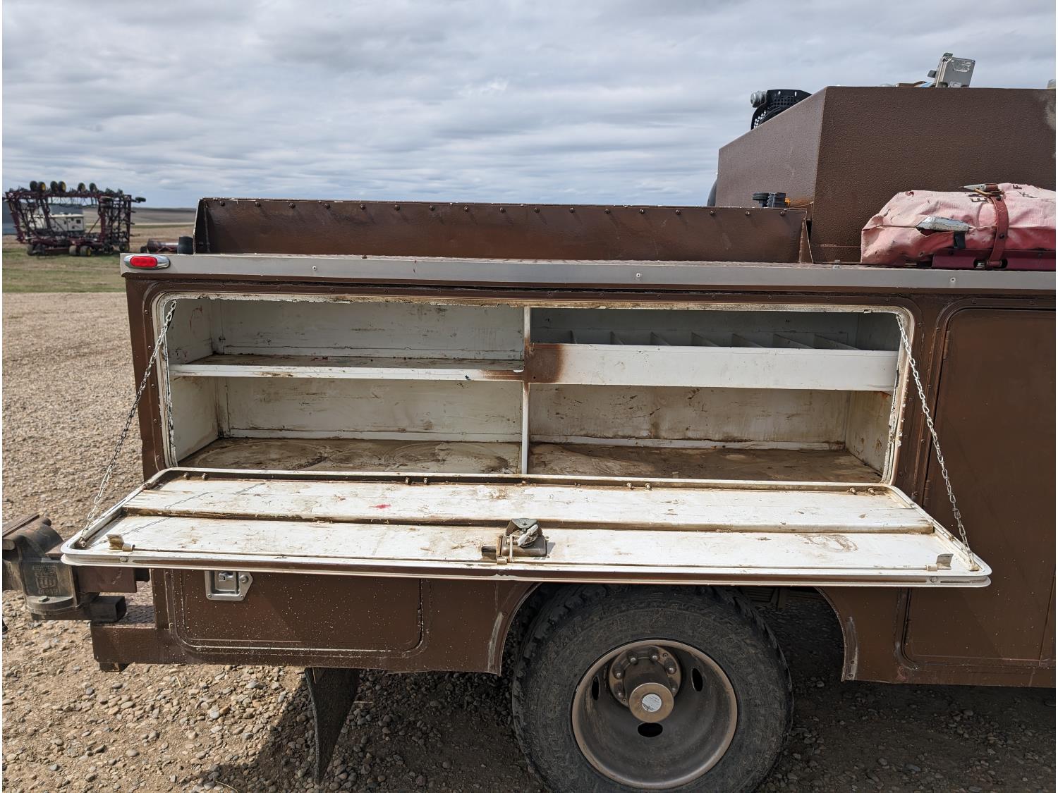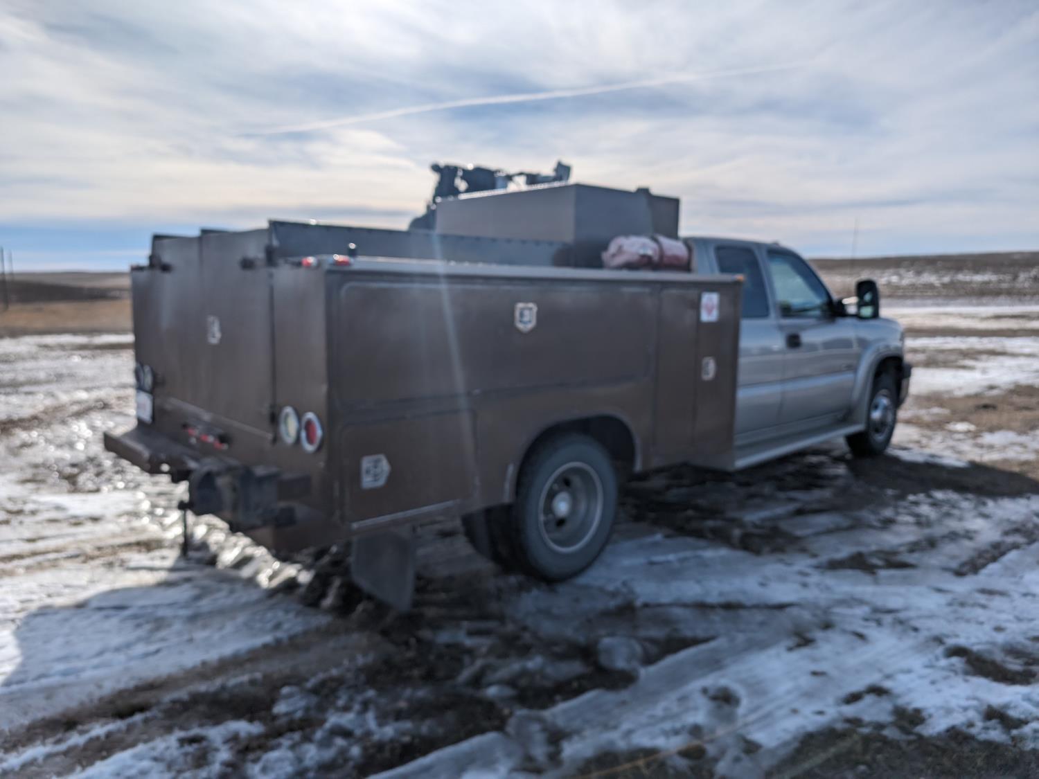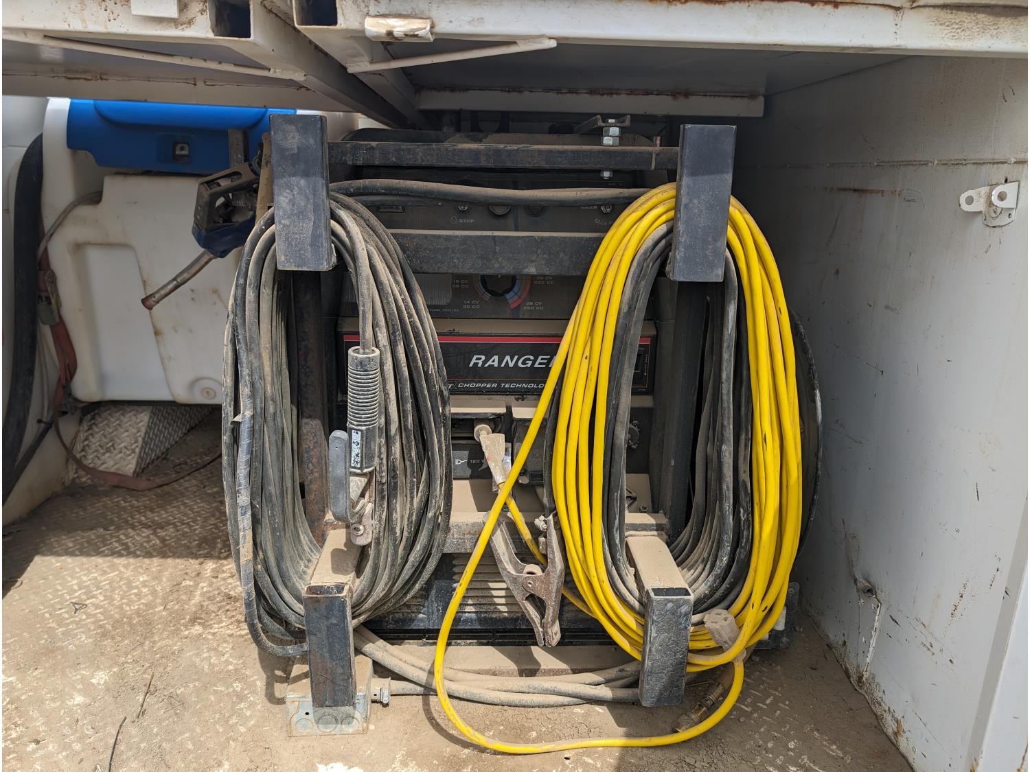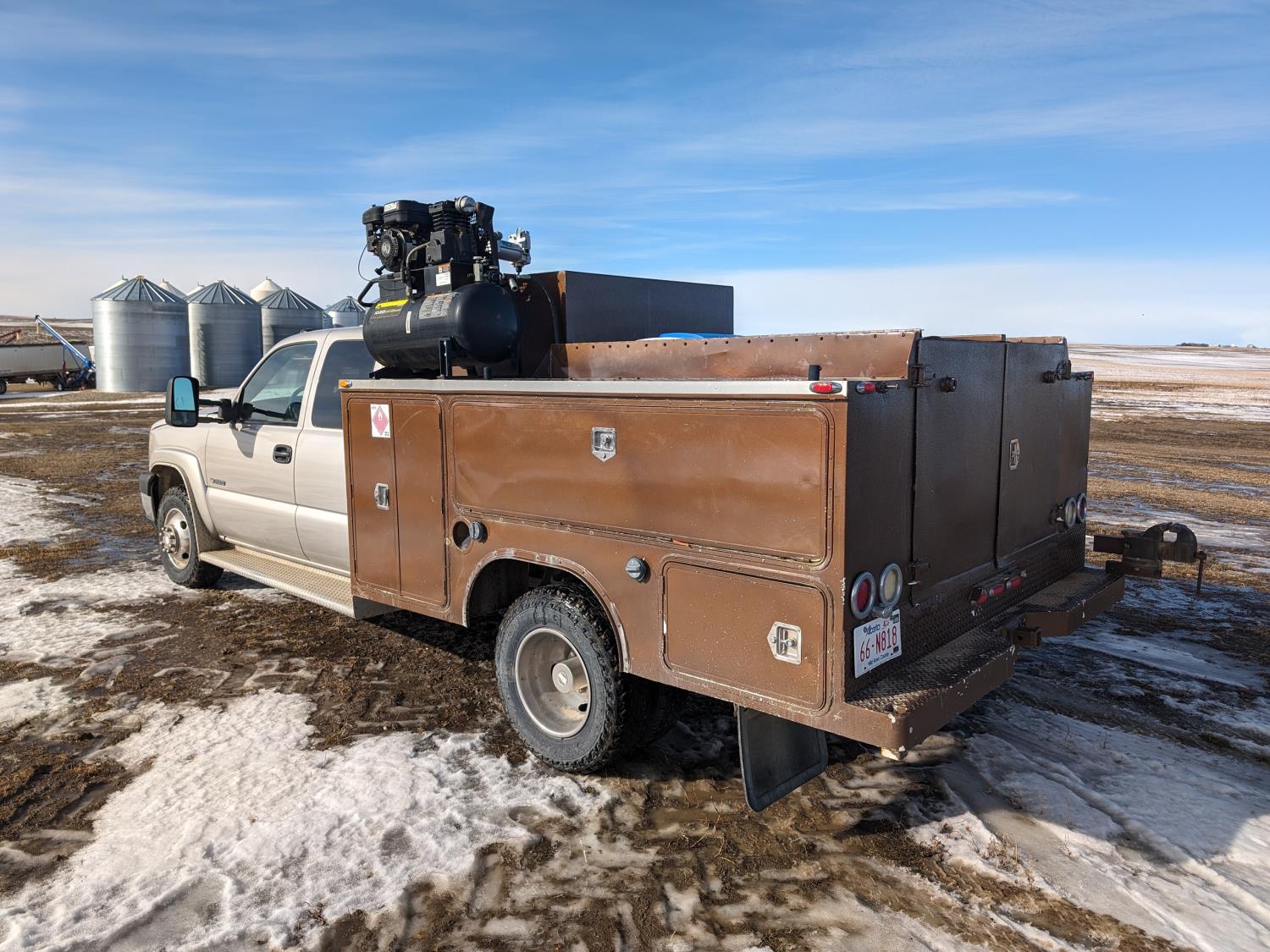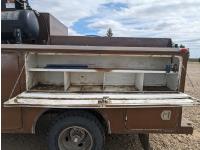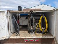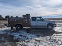 8.1 L V8 gas engine, automatic transmission, A/C, 2003 Milron 9 ft service body, Lincoln Electric Ranger 250 welder, John Deere ACI-20GR air compressor, 1135 Liter fuel tank, transfer pump, hose, nozzle, DEF tank, pump, hose, nozzle, bench vise, 215/85R16 tires