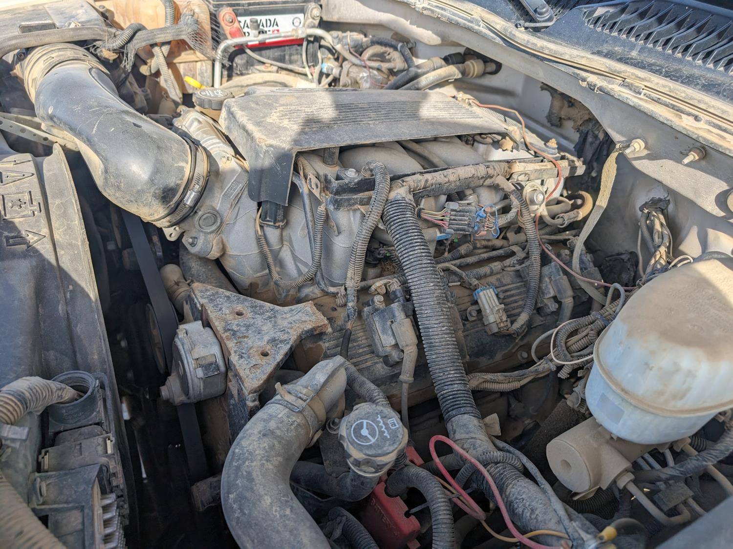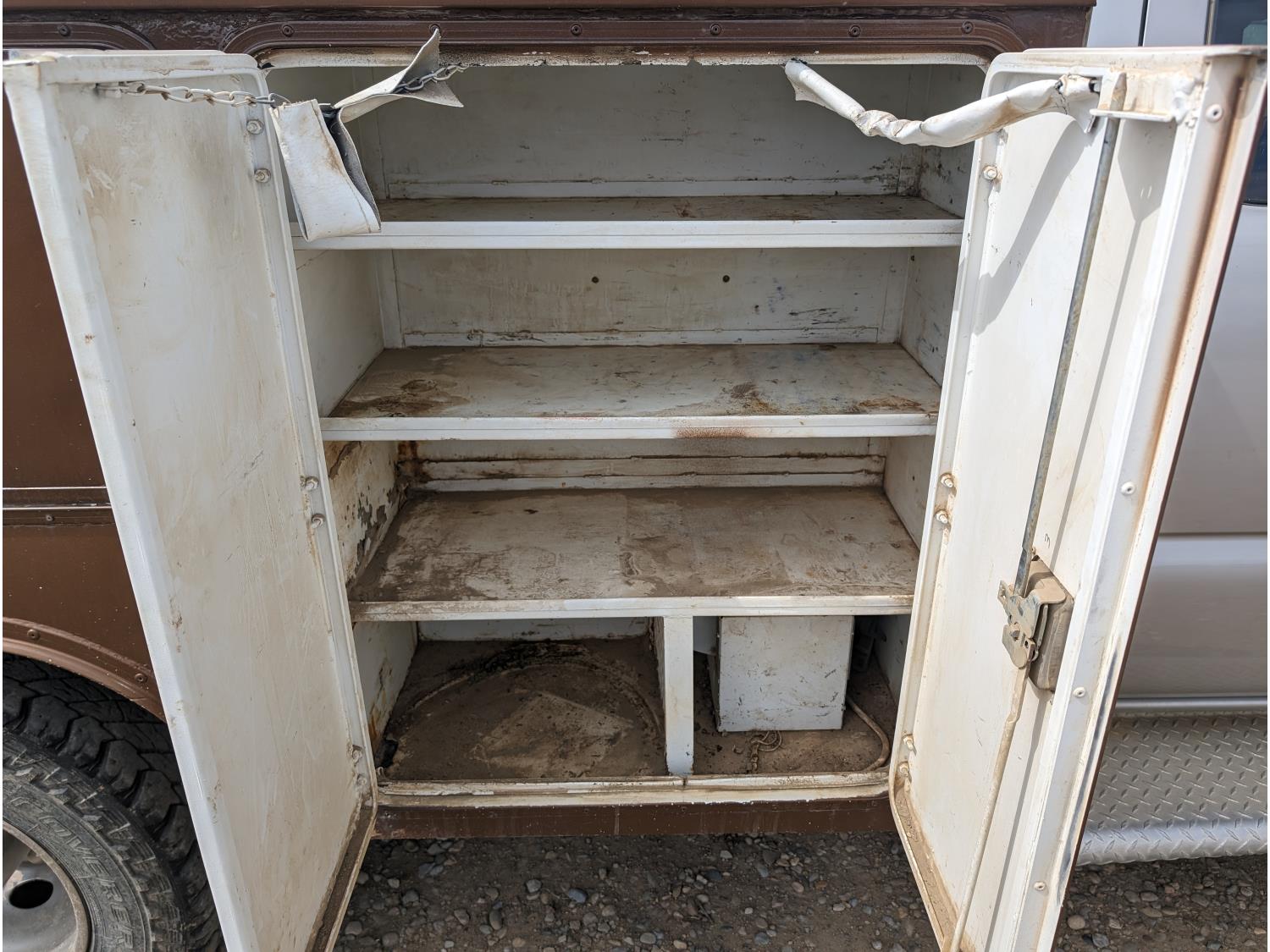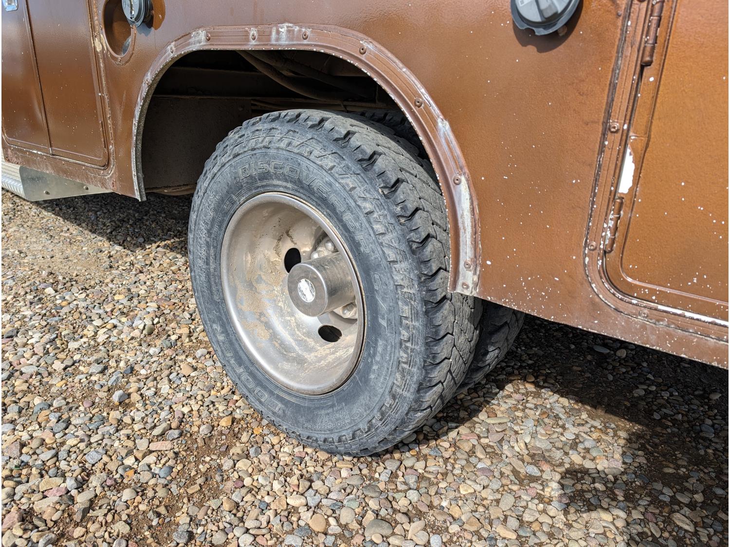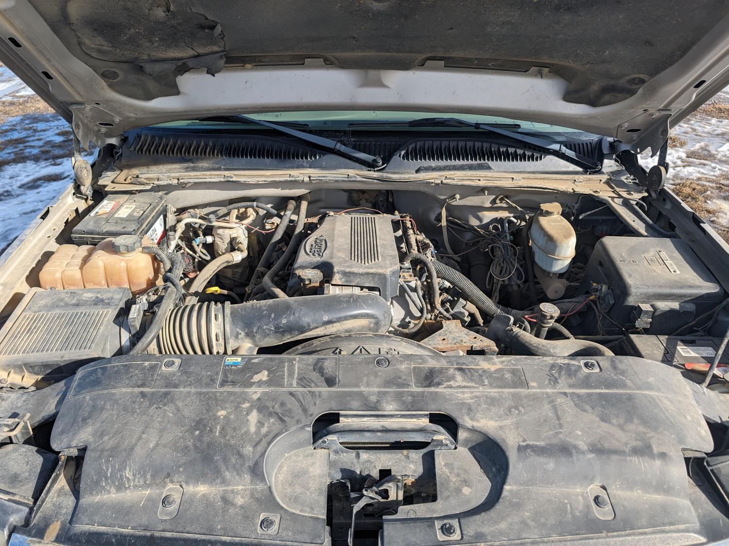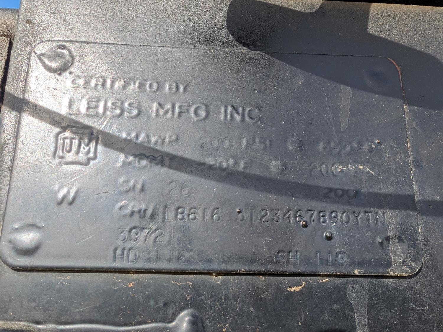 8.1 L V8 gas engine, automatic transmission, A/C, 2003 Milron 9 ft service body, Lincoln Electric Ranger 250 welder, John Deere ACI-20GR air compressor, 1135 Liter fuel tank, transfer pump, hose, nozzle, DEF tank, pump, hose, nozzle, bench vise, 215/85R16 tires