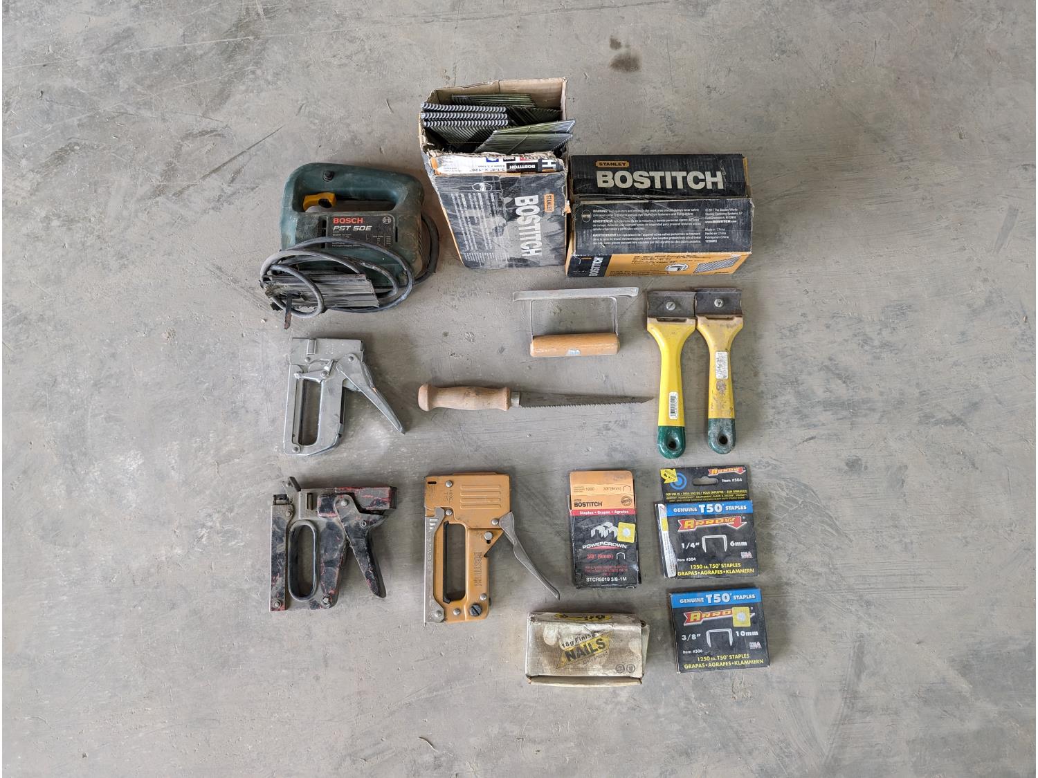 28 Bosch PST 50E Jigsaw & Assortment of Misc Staplers, Nailers and Other Tools