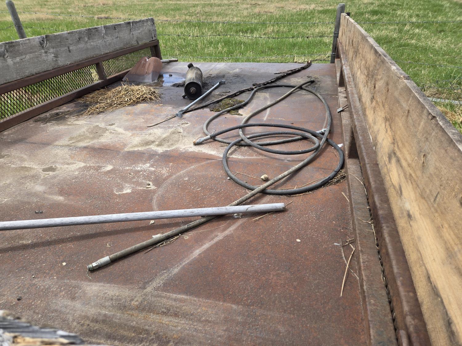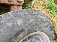 Hoist cylinder is broken, flat tires and has a bent axle. Sells as is.