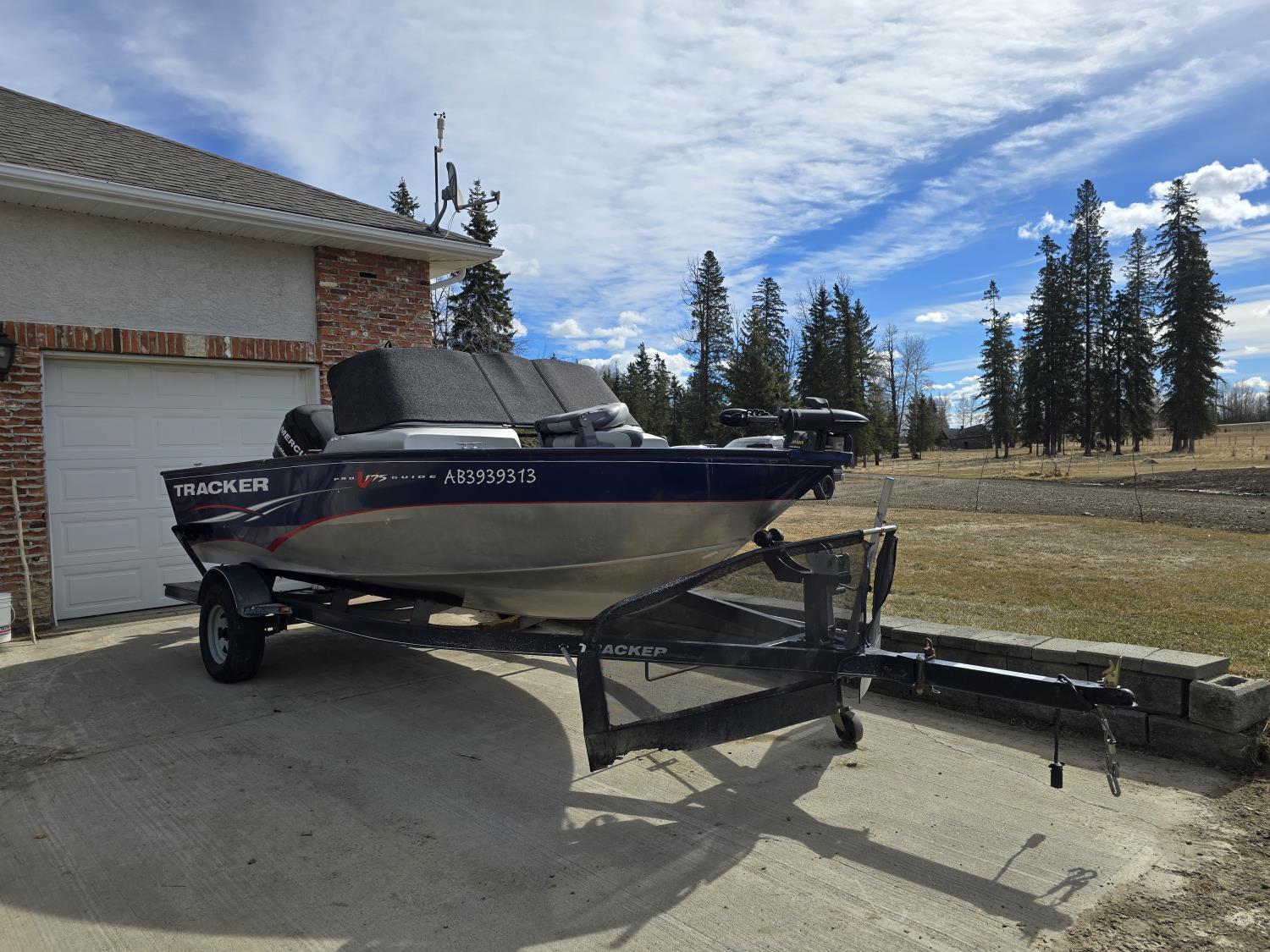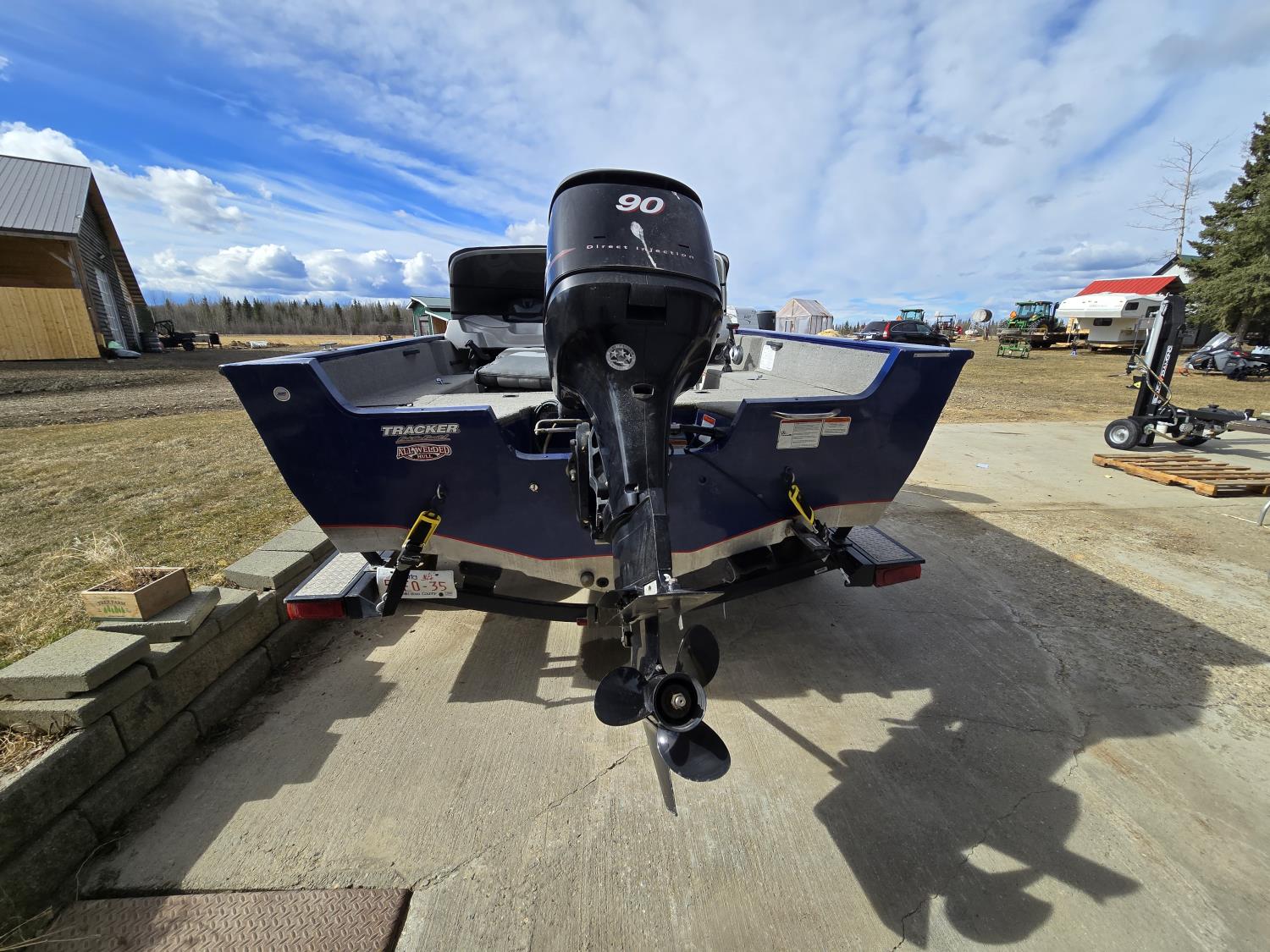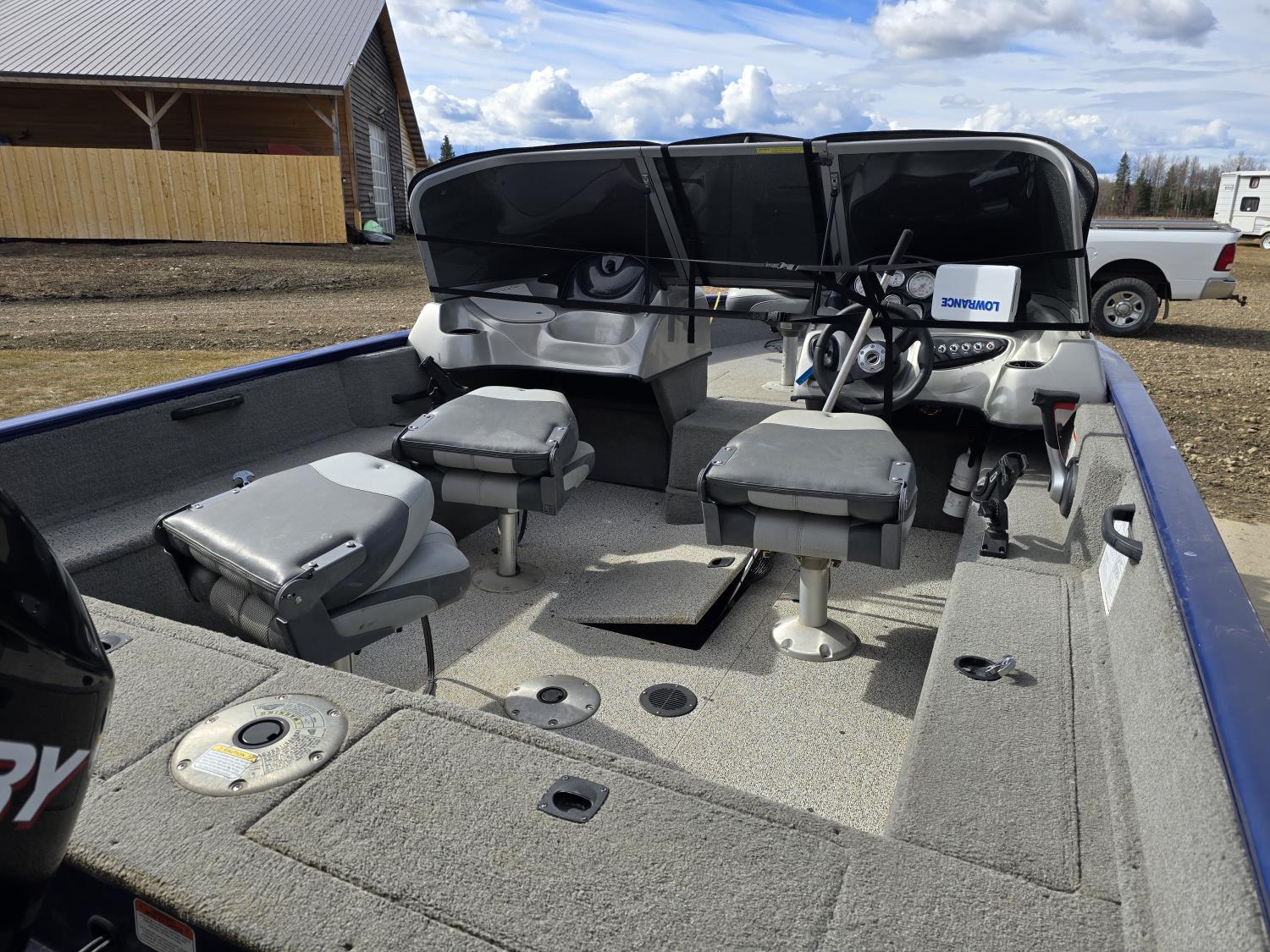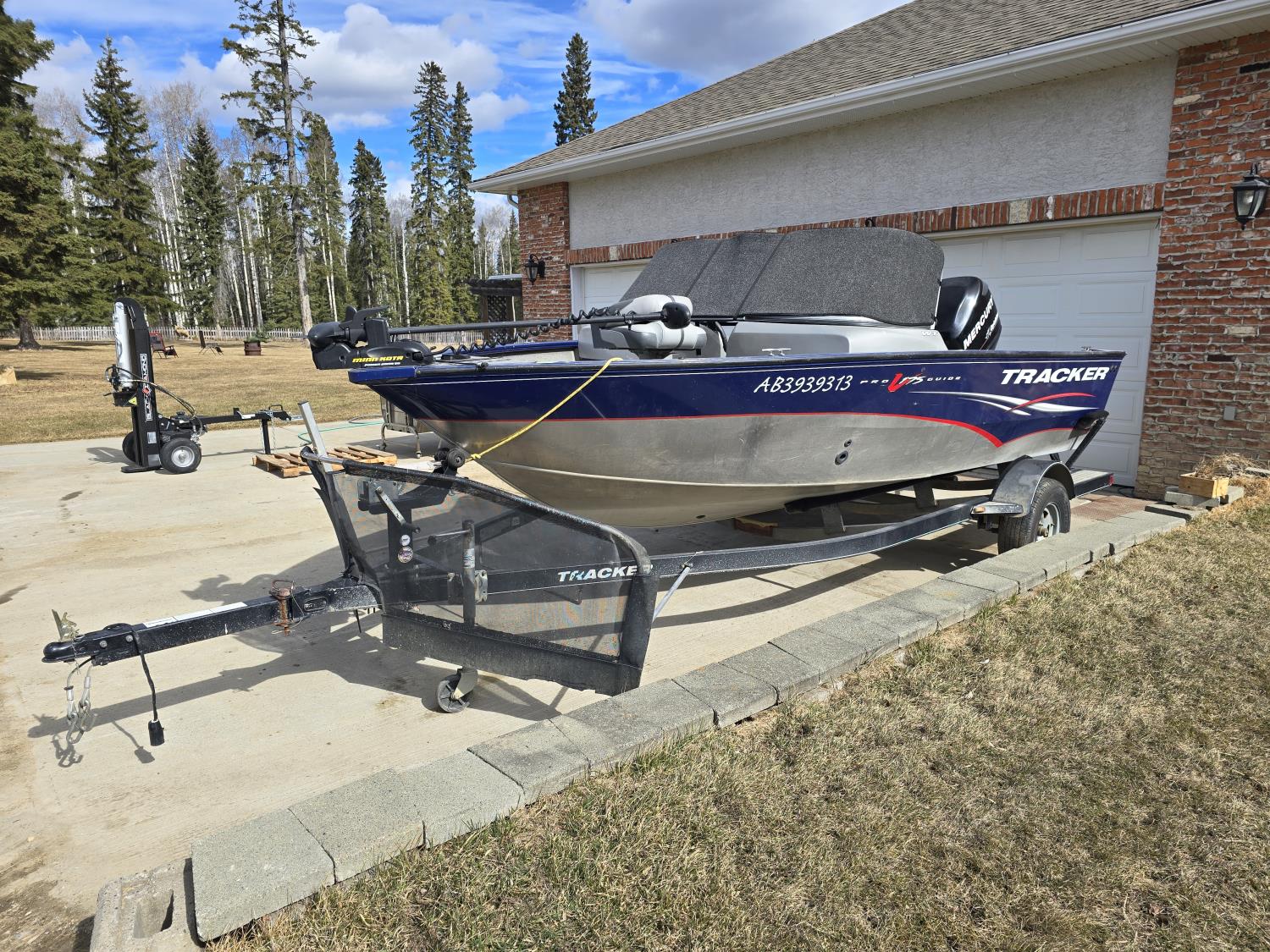 90 HP Mercury motor, open bow, electric trolling motor, fish finder, c/w trailer