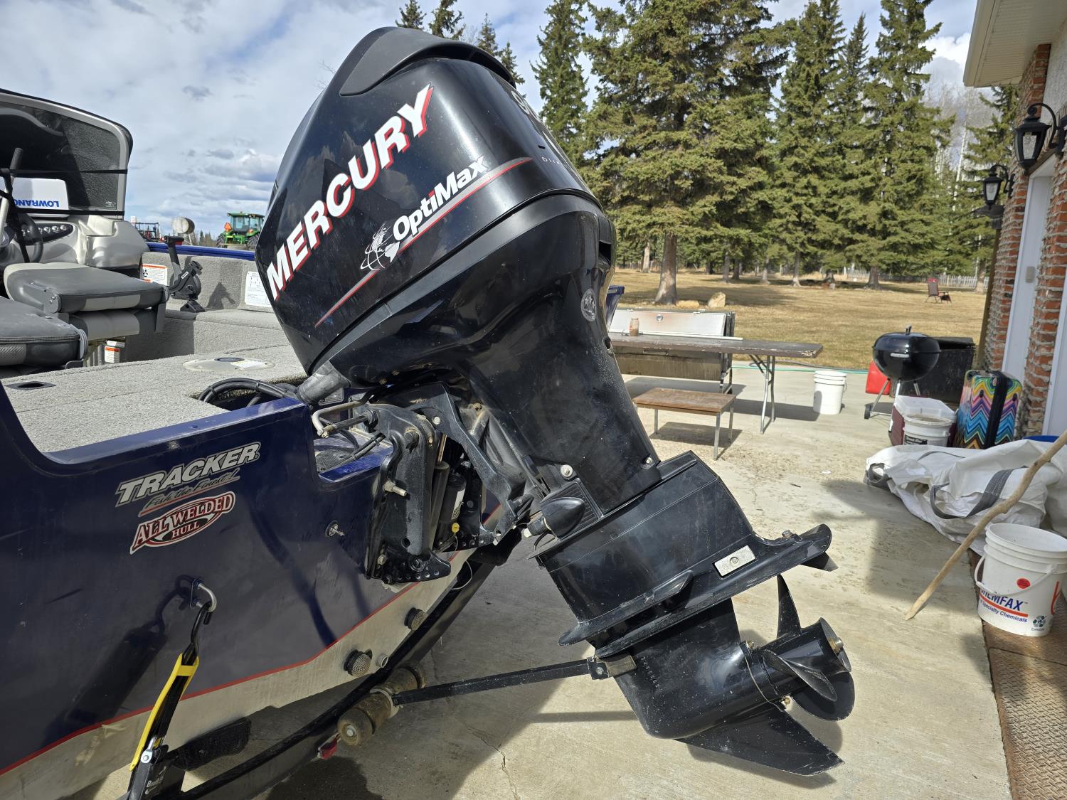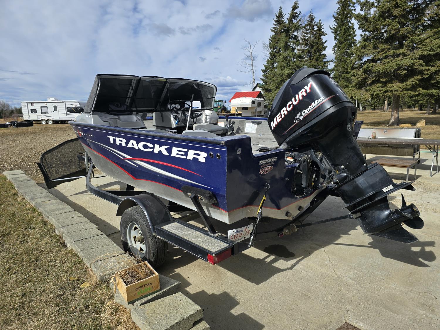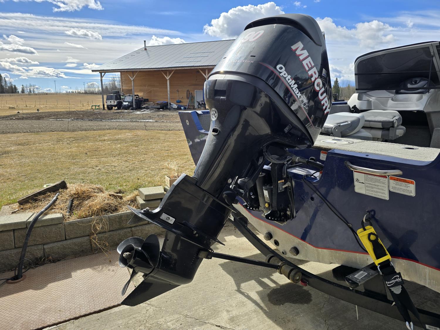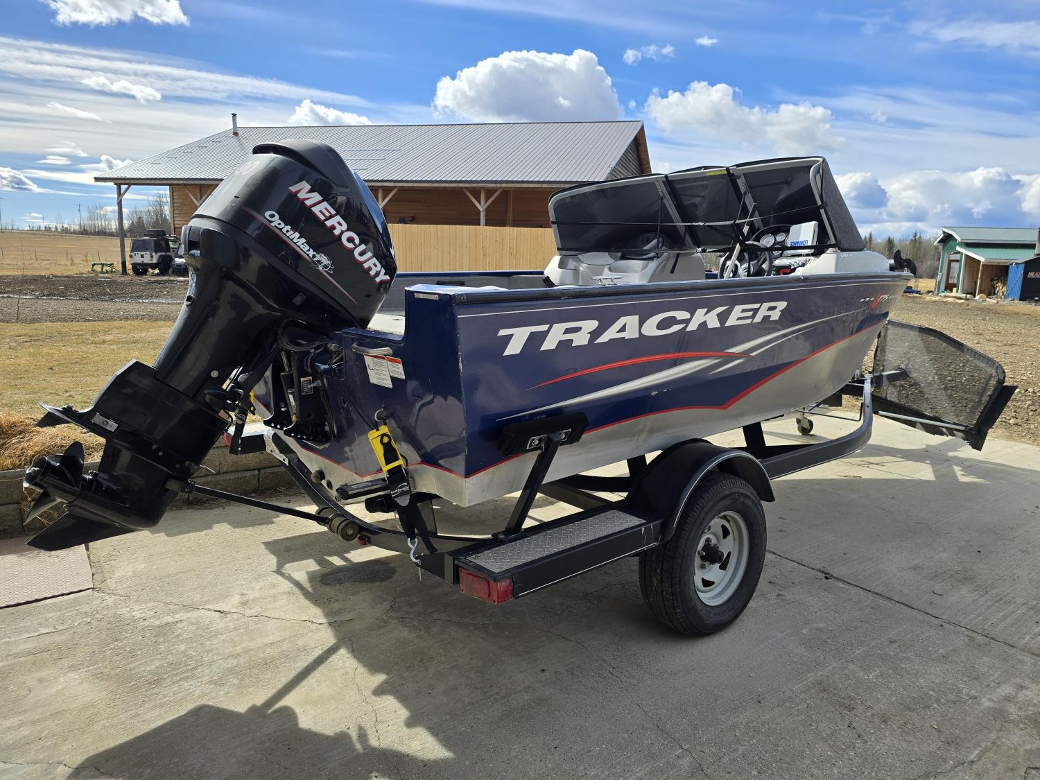 90 HP Mercury motor, open bow, electric trolling motor, fish finder, c/w trailer