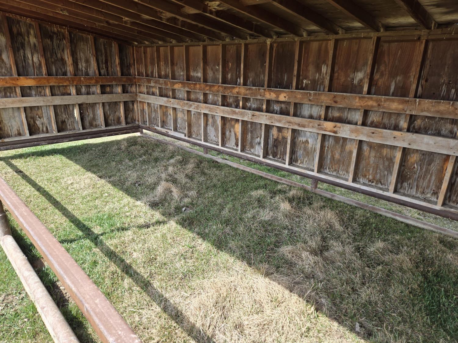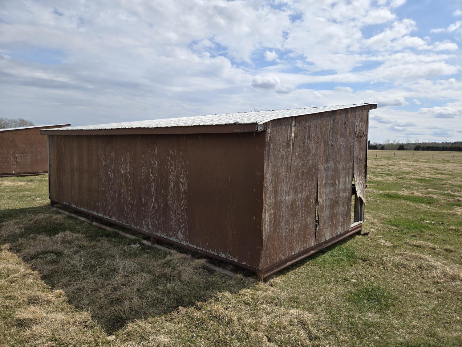 10 ft wide, 2-7/8 inch pipe frame skids, metal roof, wood construction