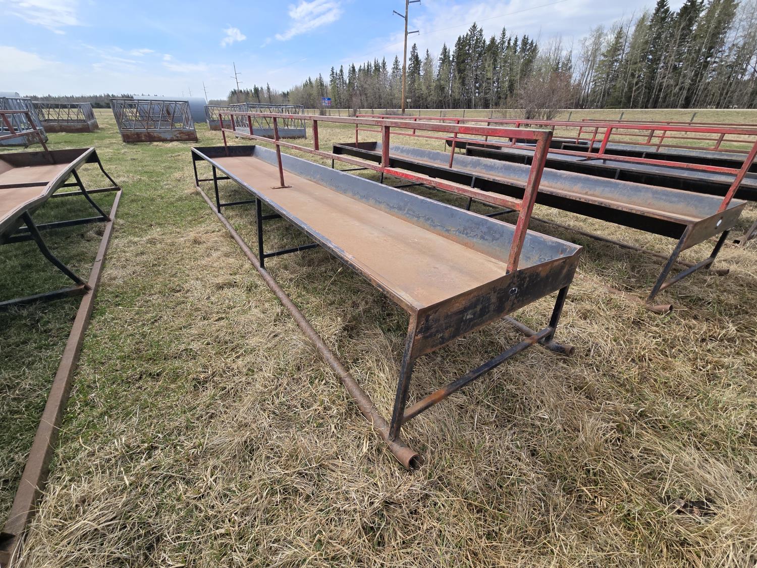 Pipe skids, square tube frame, 40 inch wide metal feed bunk trough, center two rail barrier