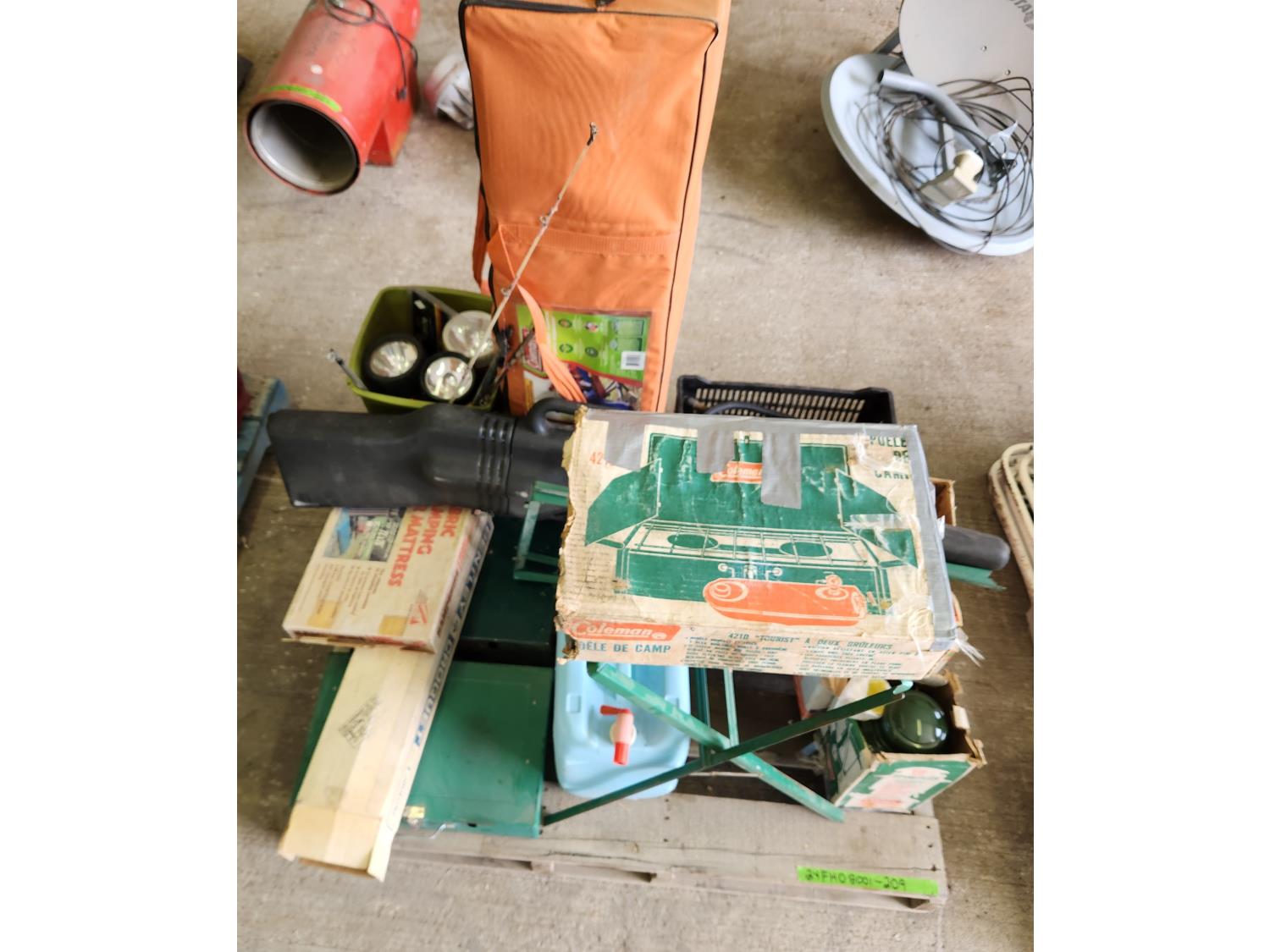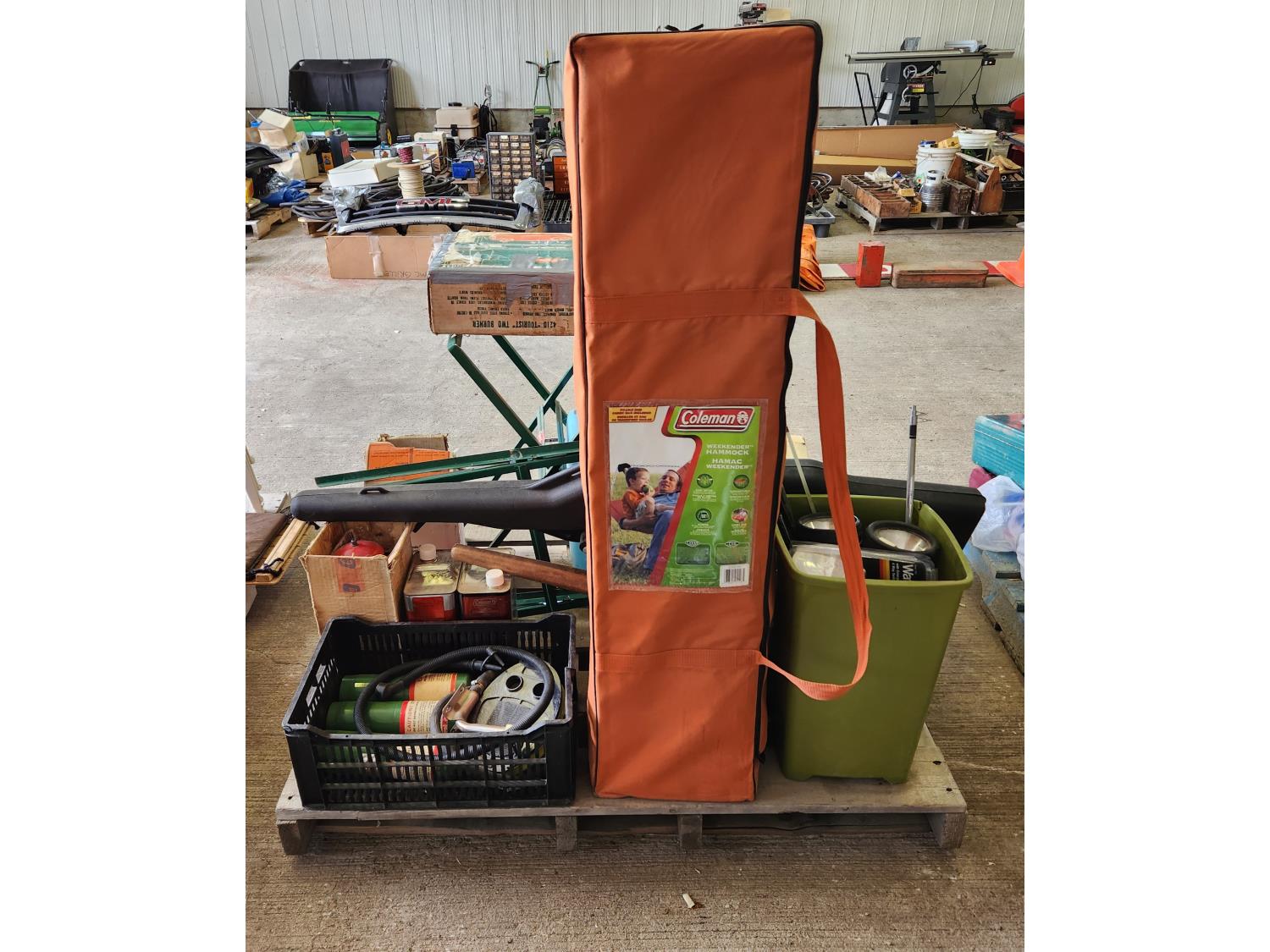 (3) Coleman cook stoves with 2 stands, kerosene lanterns, flashlights, gun scabbard, kerosene, propane, Coleman hammock