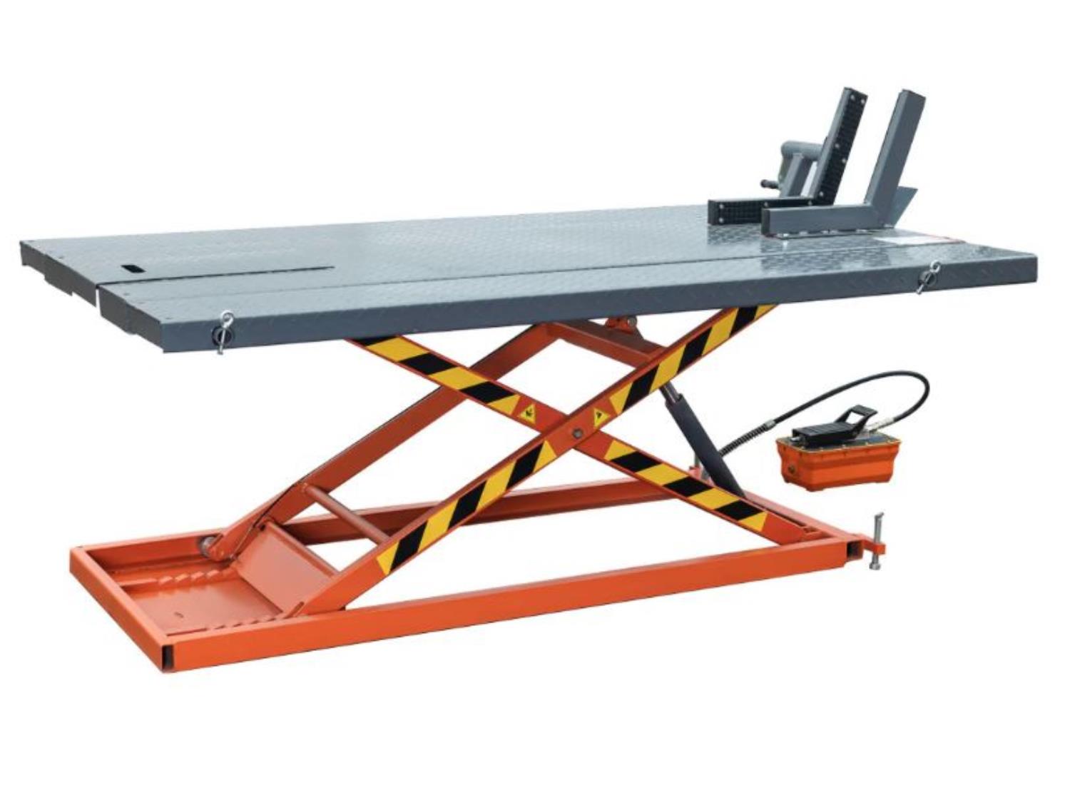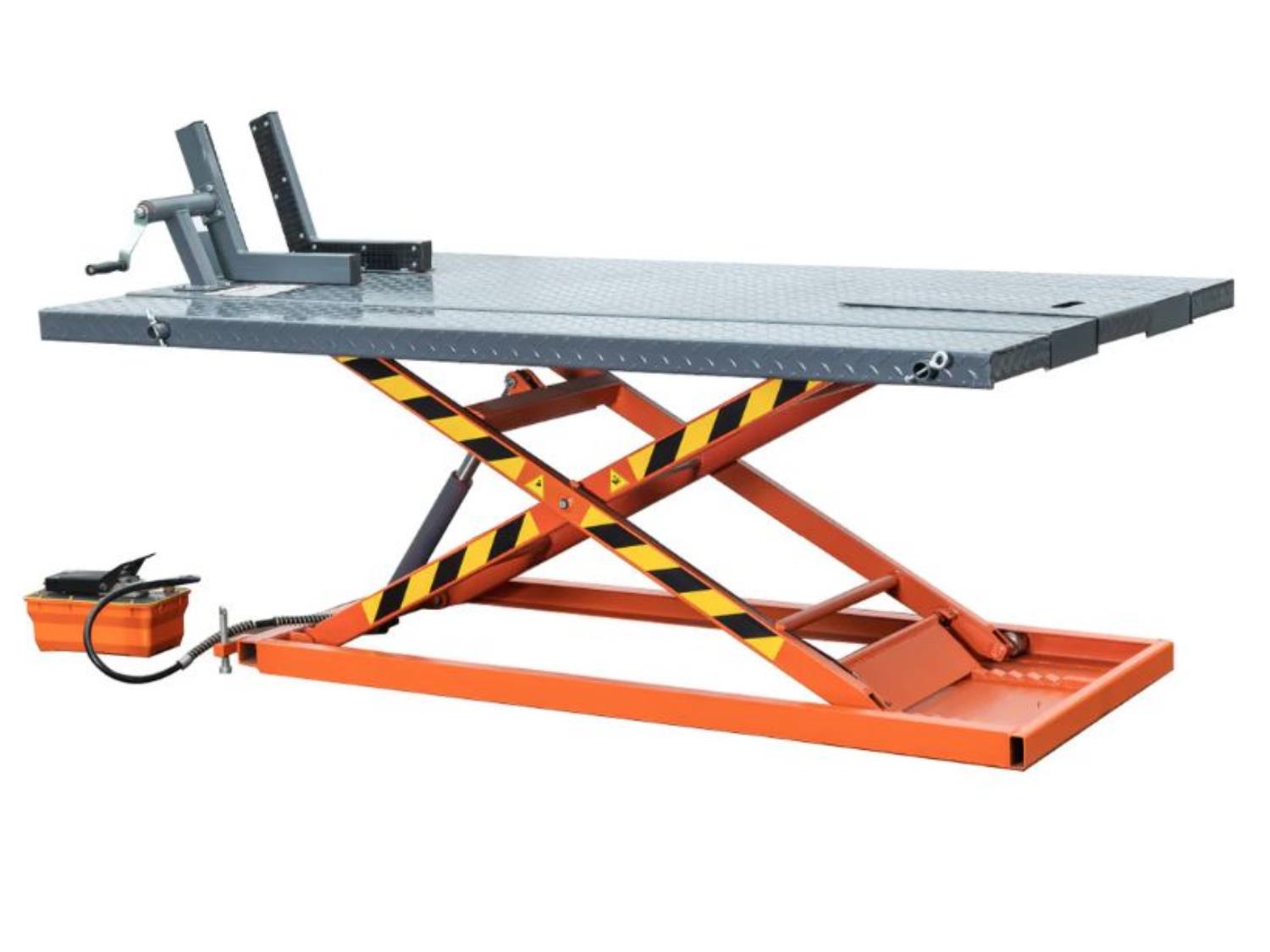 48” work platform, side extensions, foot pedal air pump, front-wheel vise grip