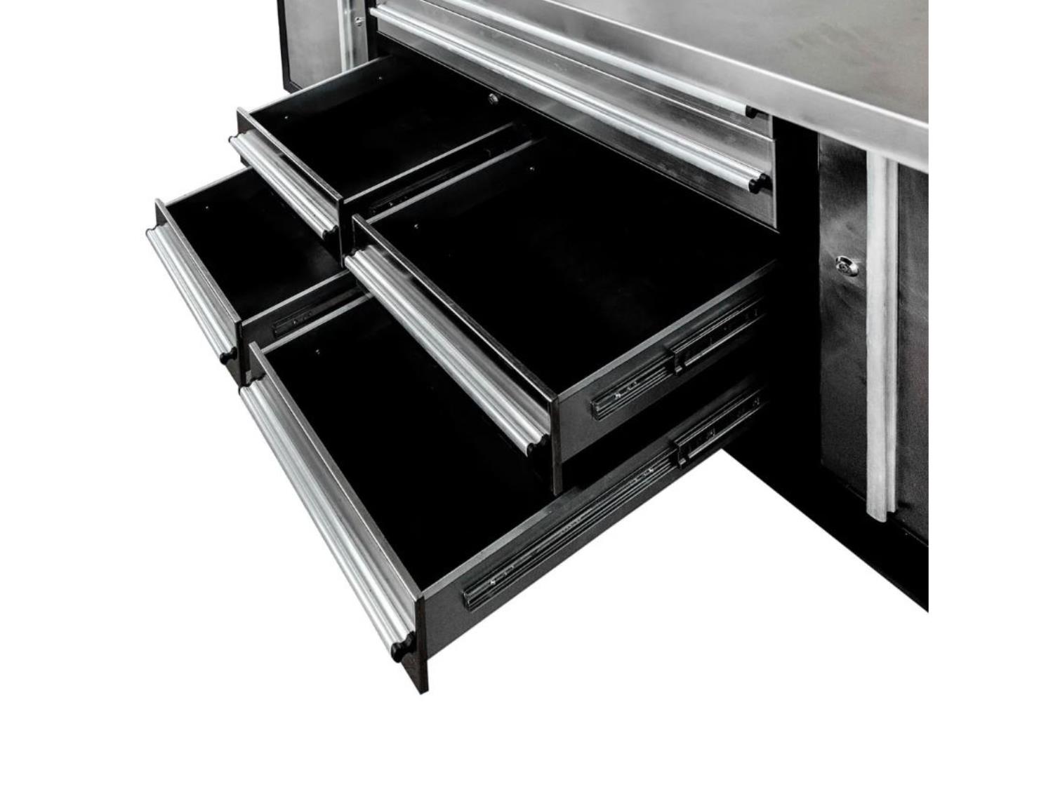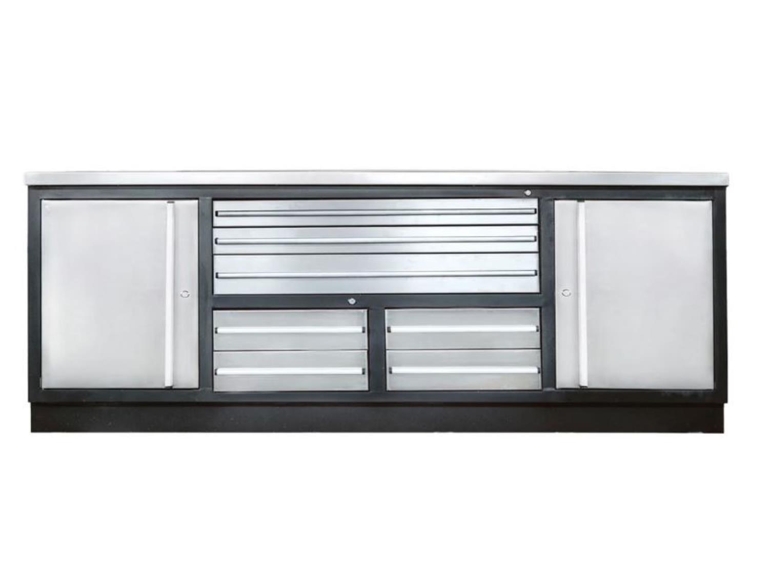 7 lockable drawers, 2 storage cabinets, adjustable shelving, All-in-One welded frame