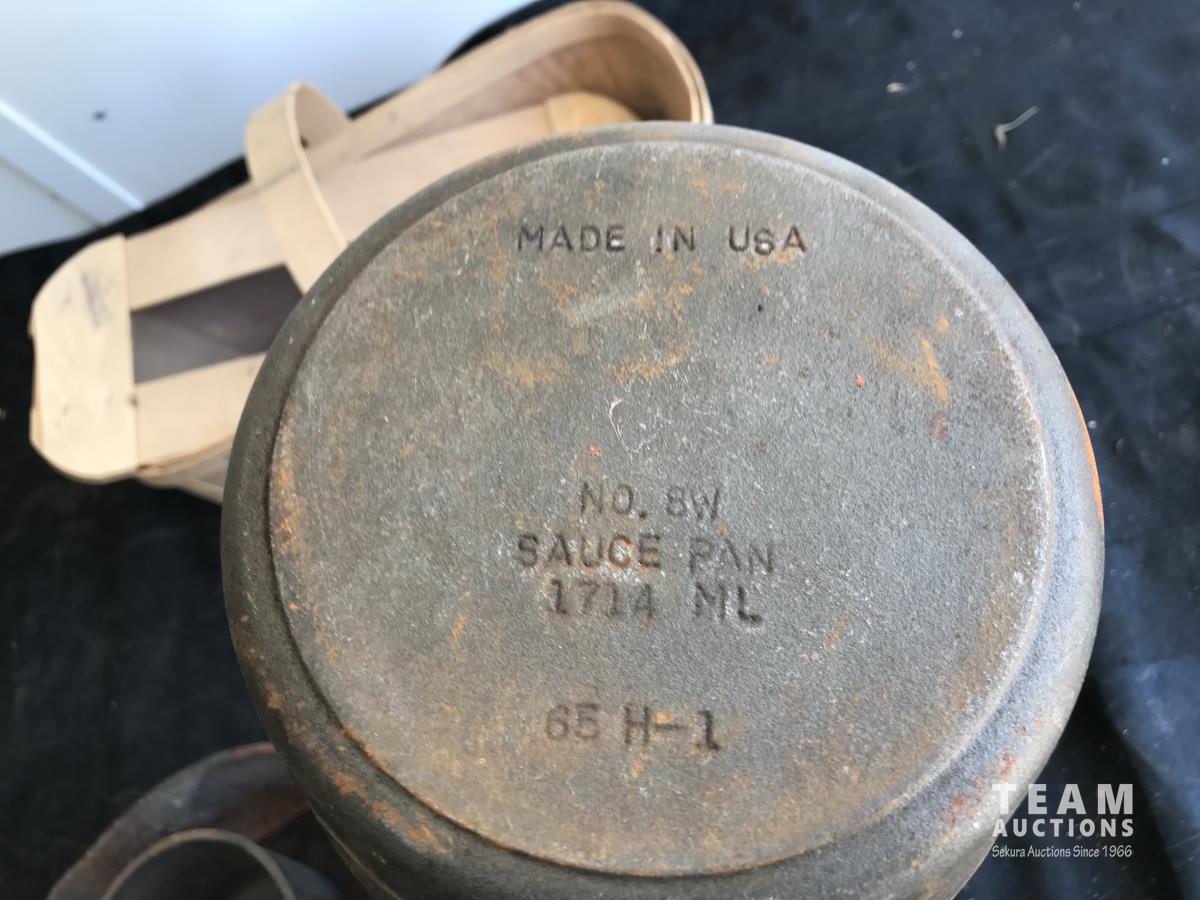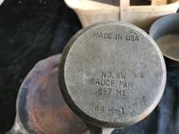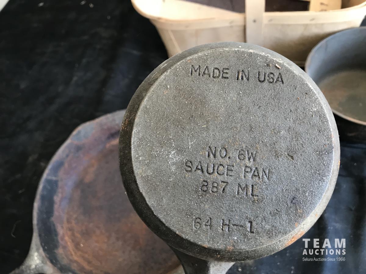 1546 (2) Cast Iron Sauce Pan w/ Cast Iron Frying Pan & Wood Basket