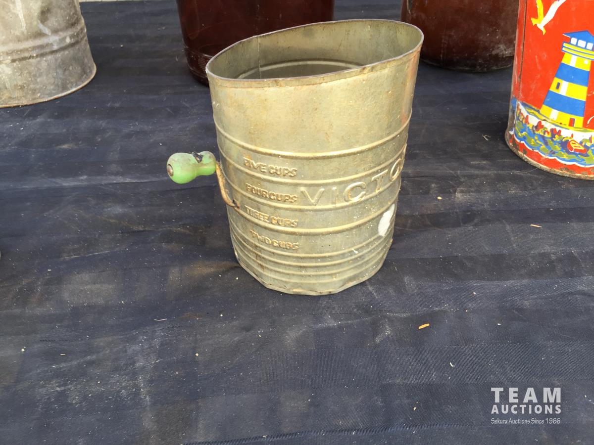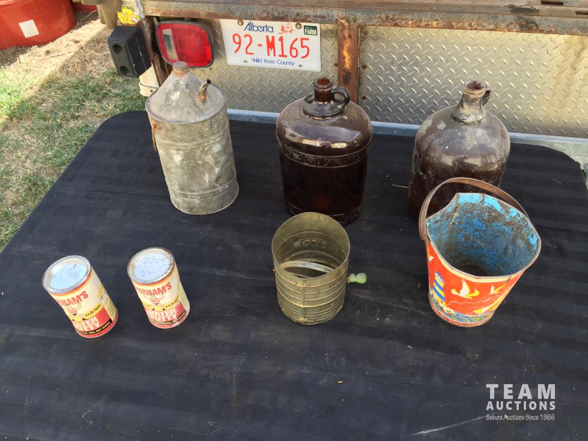 1697 (2) Glass Jugs, (2) Tins, Bucket, Sifter & Metal Can