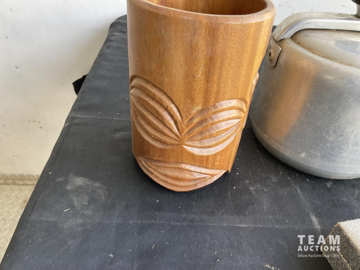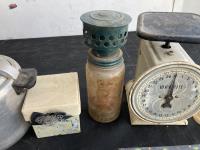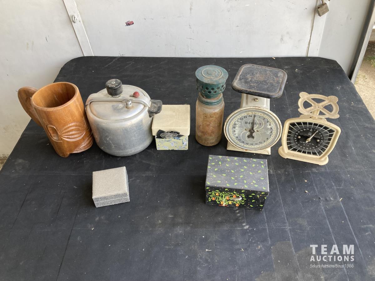1974 (2) Scales, (3) Boxes, Tea Pot & Wooden Cup
