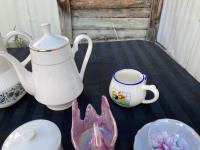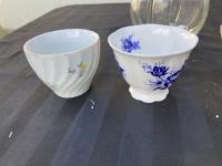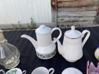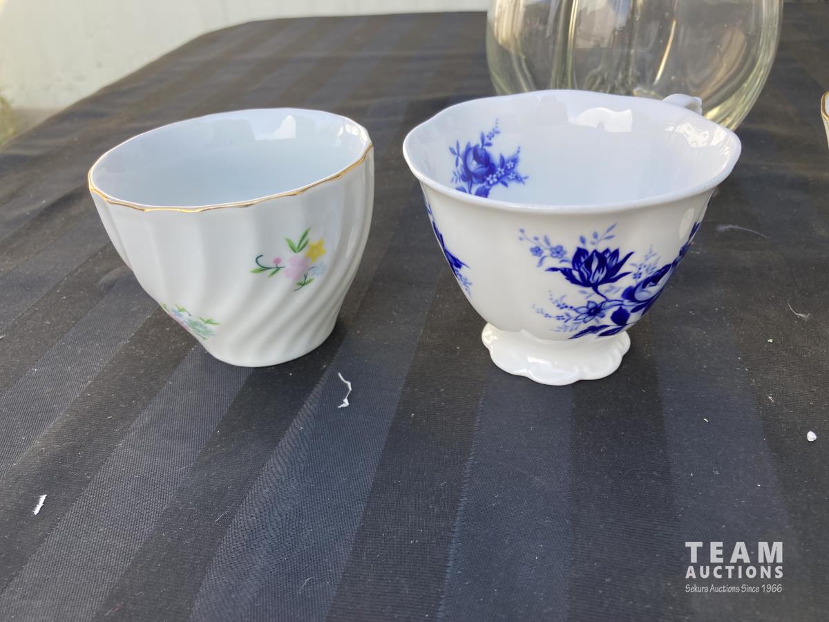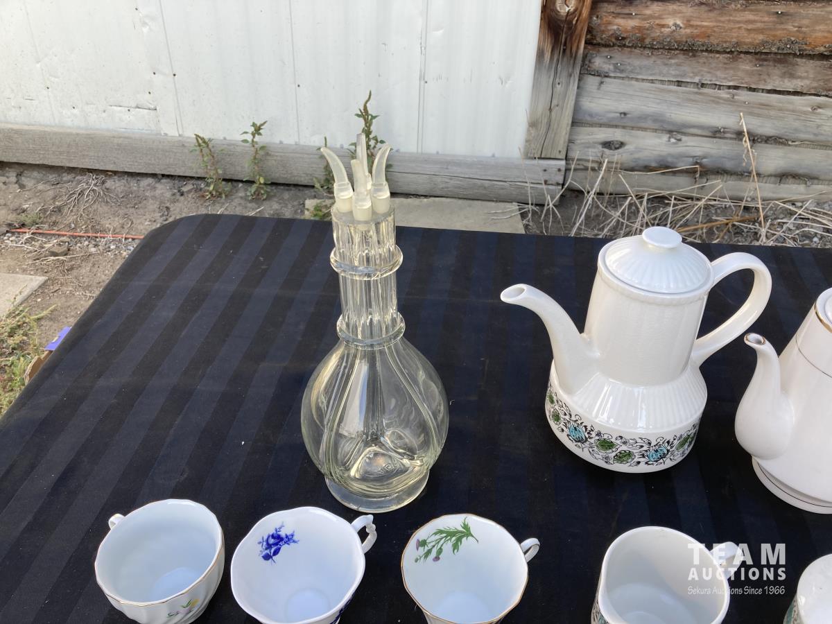 1702 (6) Mugs, (2) Tea Pots & 4 Chamber Glass Decanter