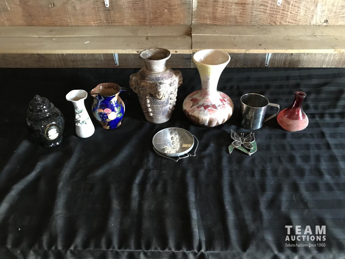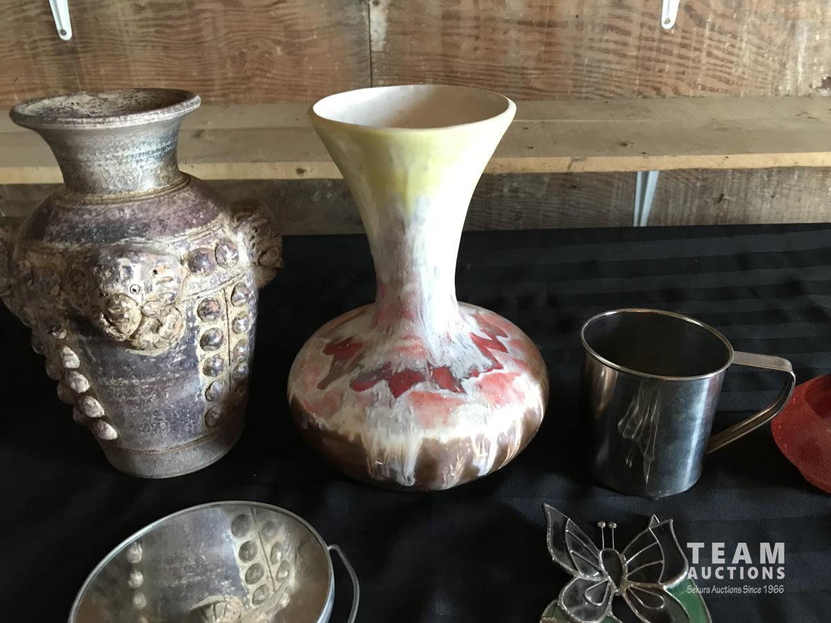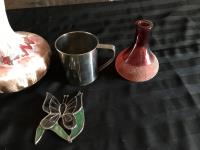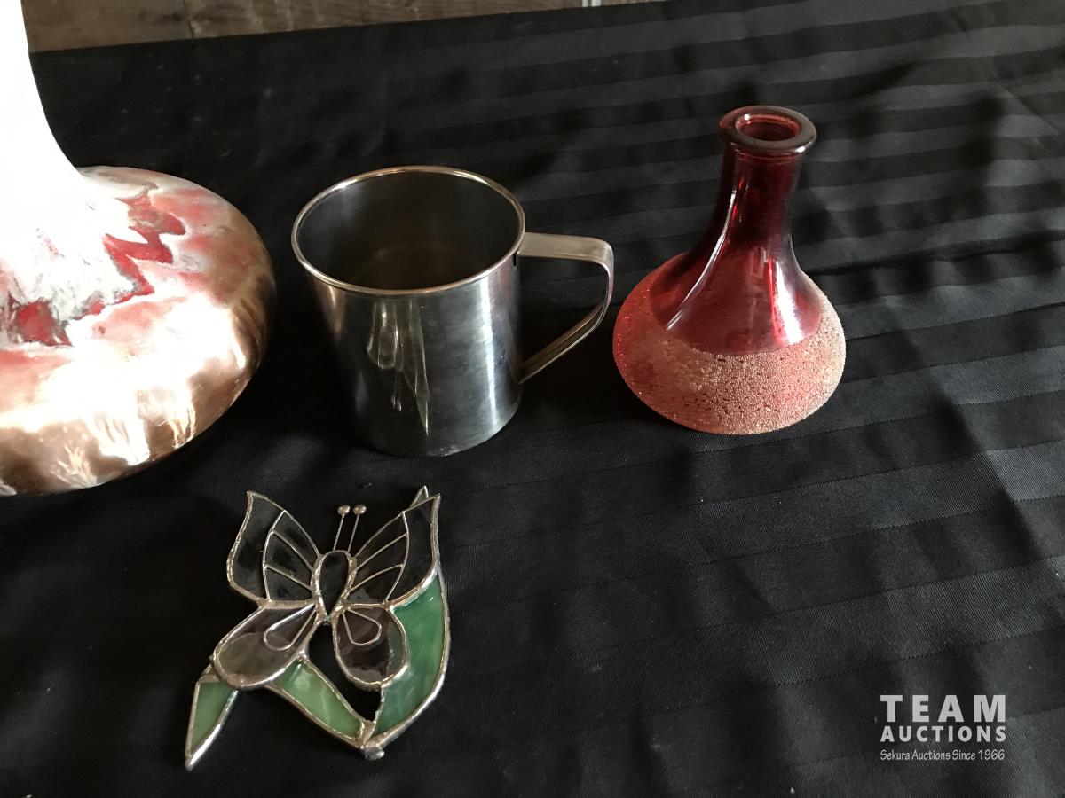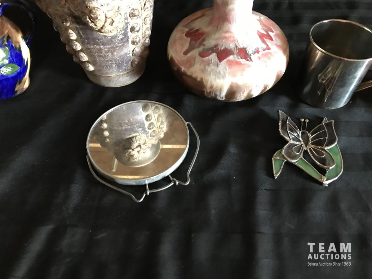 1663 (6) Vases w/ Tin Mug, Mirror & Glass Butterfly