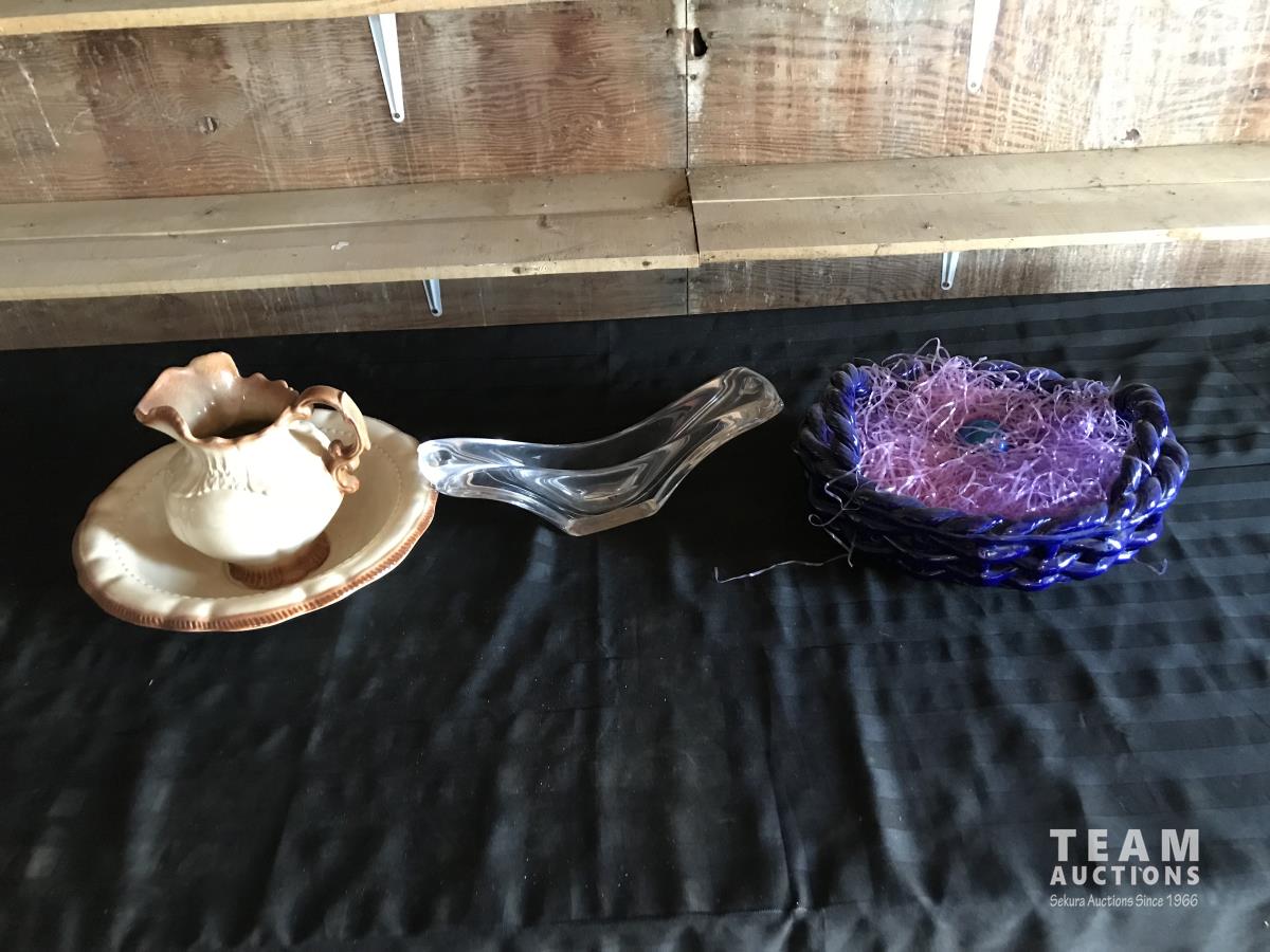 1661 Porcelain Pitcher w/ Plate, Glass Basket & Glass Bowl