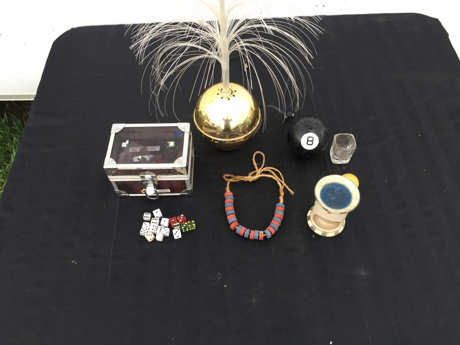 fiberoptic lamp, magic 8 ball, dice, shot glass, bead necklace, candle, jewelry box