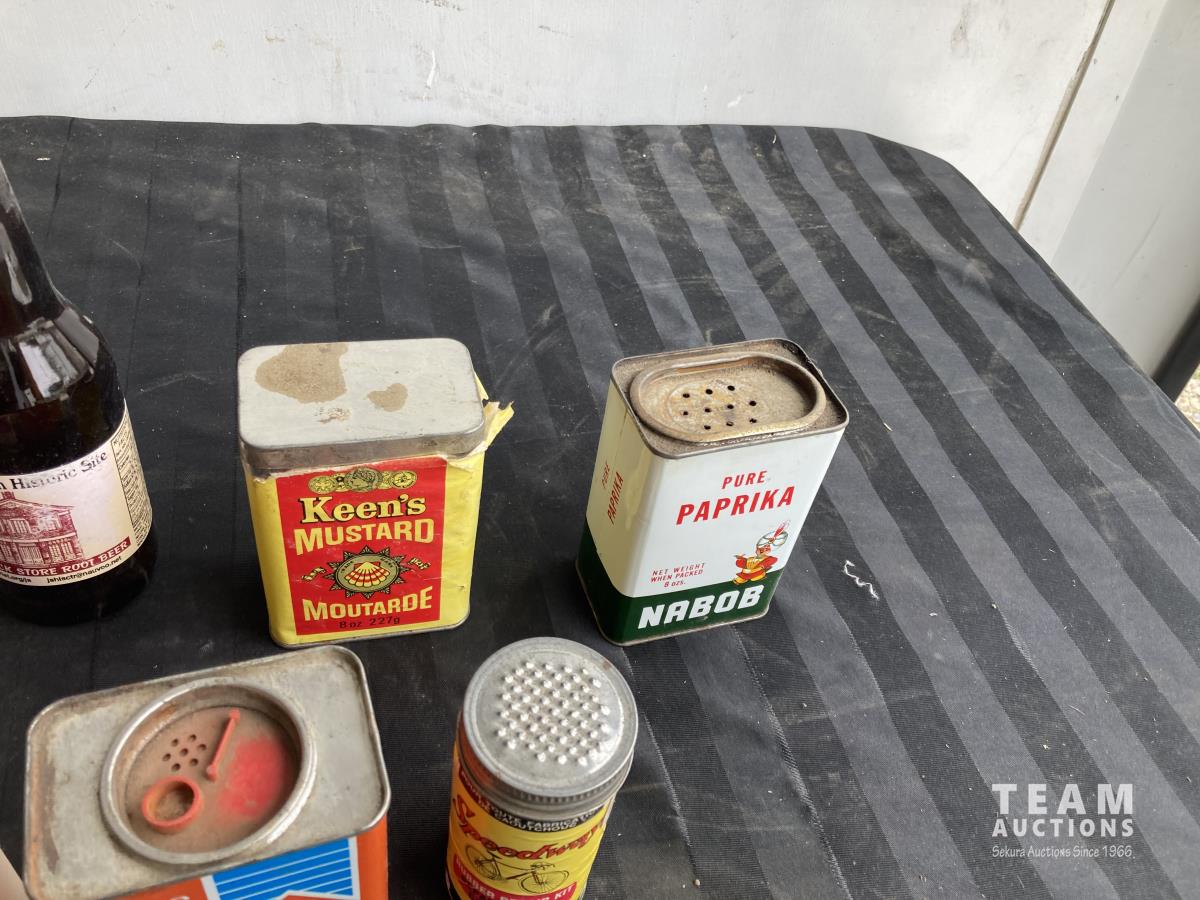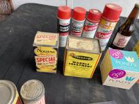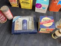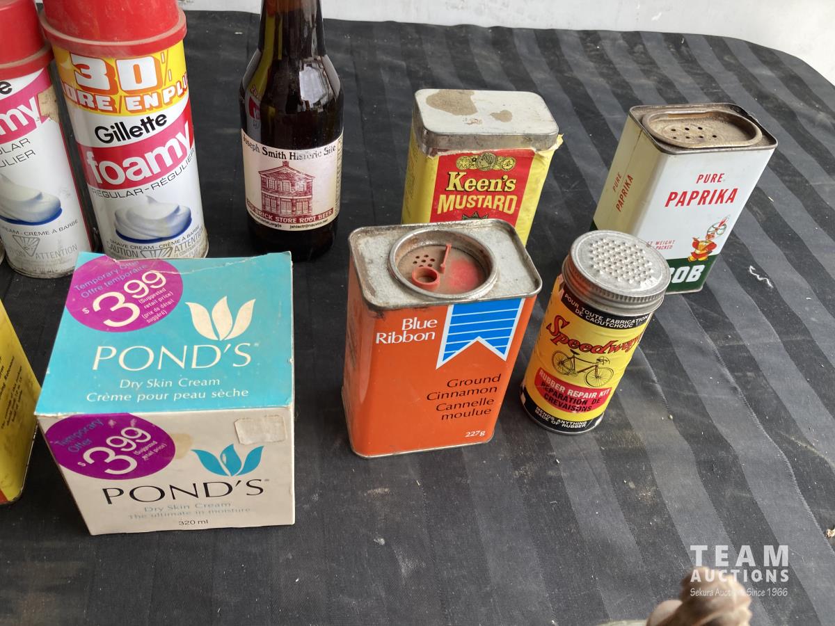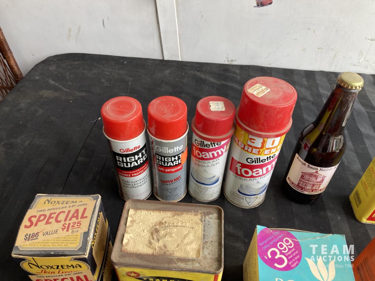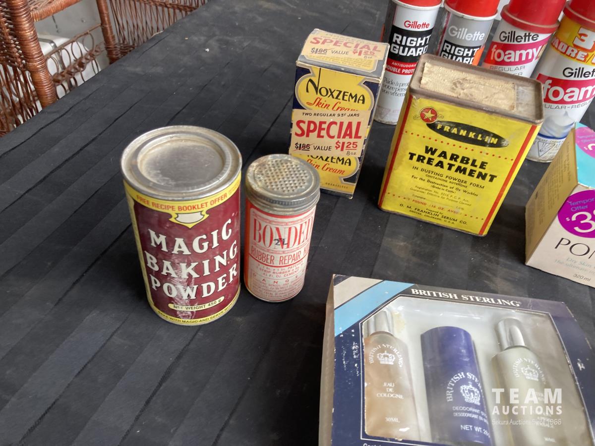 Cologne, shaving cream, tins