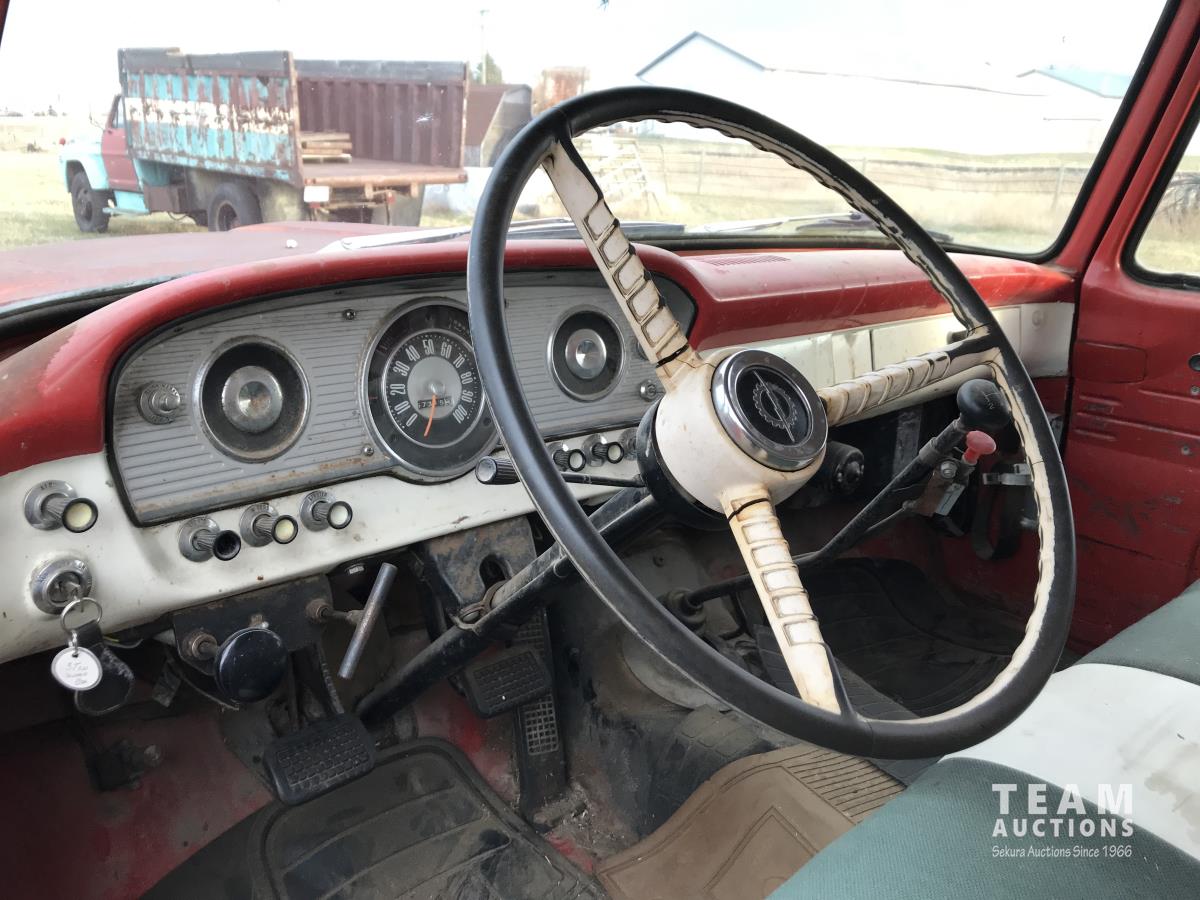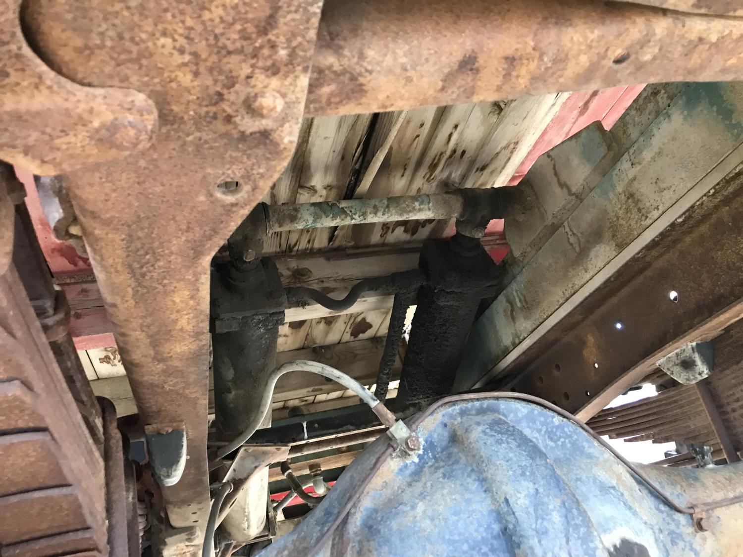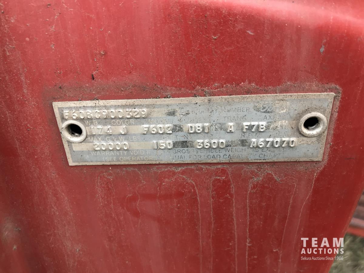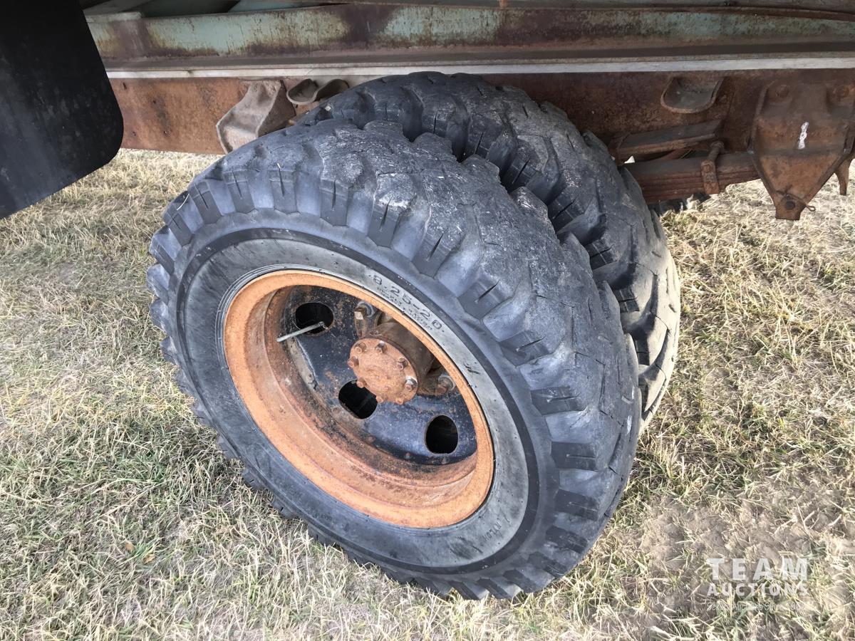 Ford V8 gas engine, 4 speed manual transmission, 14ft wooden box, hoist, 174 inch WB, 8.25-20 tires