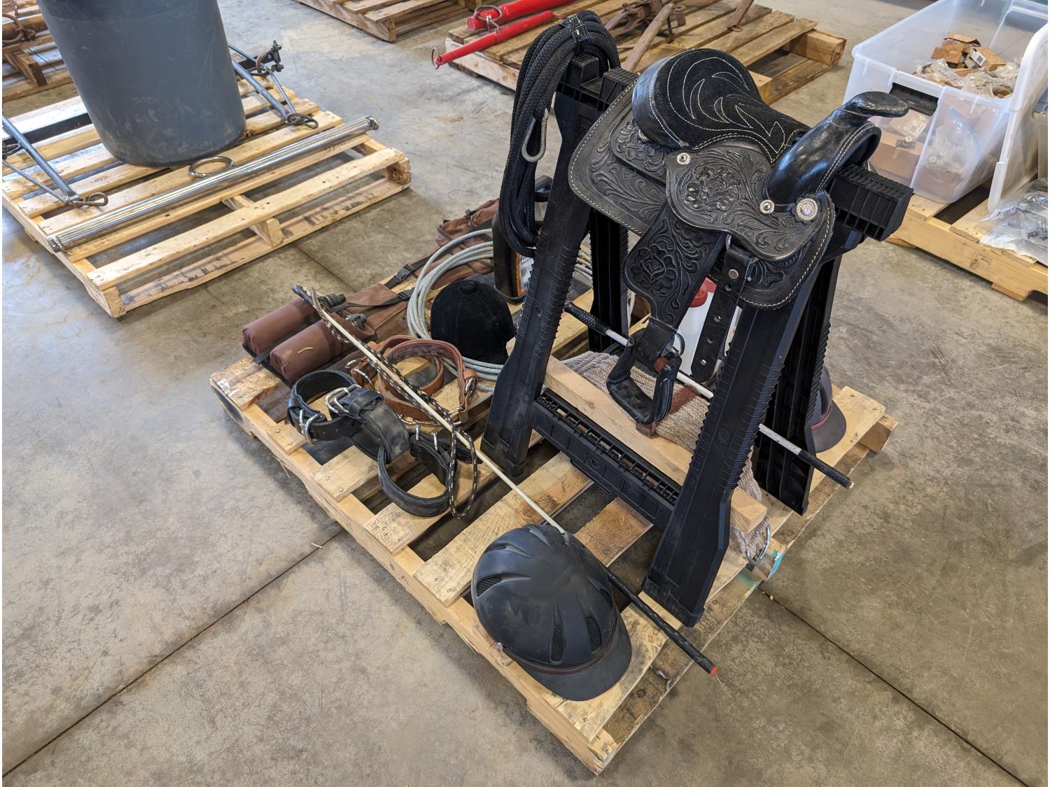 150 (3) Riding Helmets, Kid's 8 Inch Saddle, Stand, & Misc Horse Items