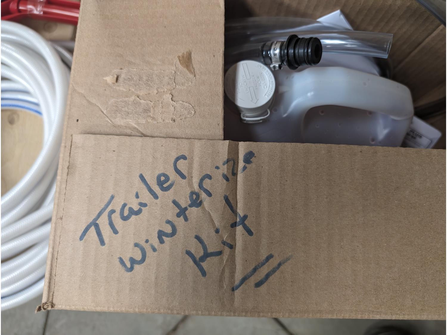 broom and dust pan, winterize kit, disposable cups, new sewer hose, sewer support side winder, wheel chocks, multi purpose inflator kit