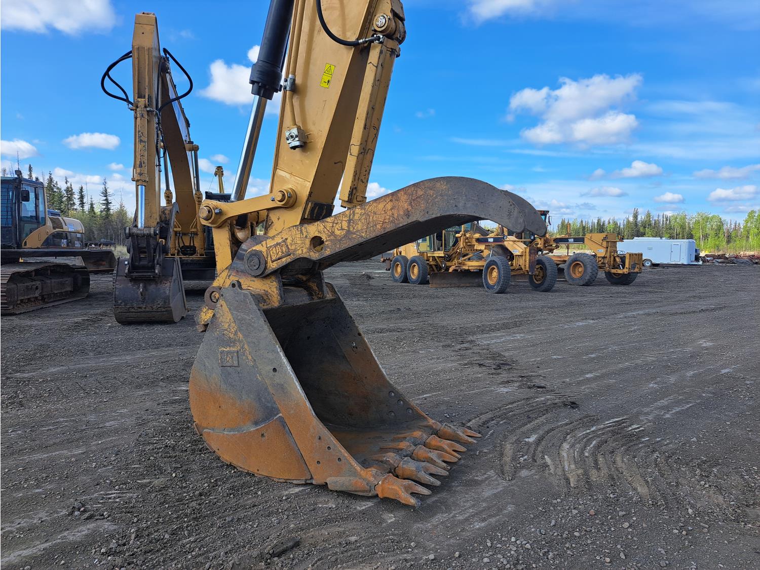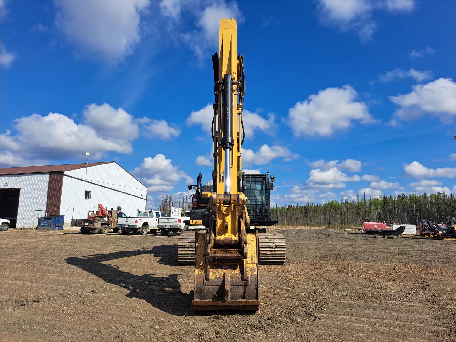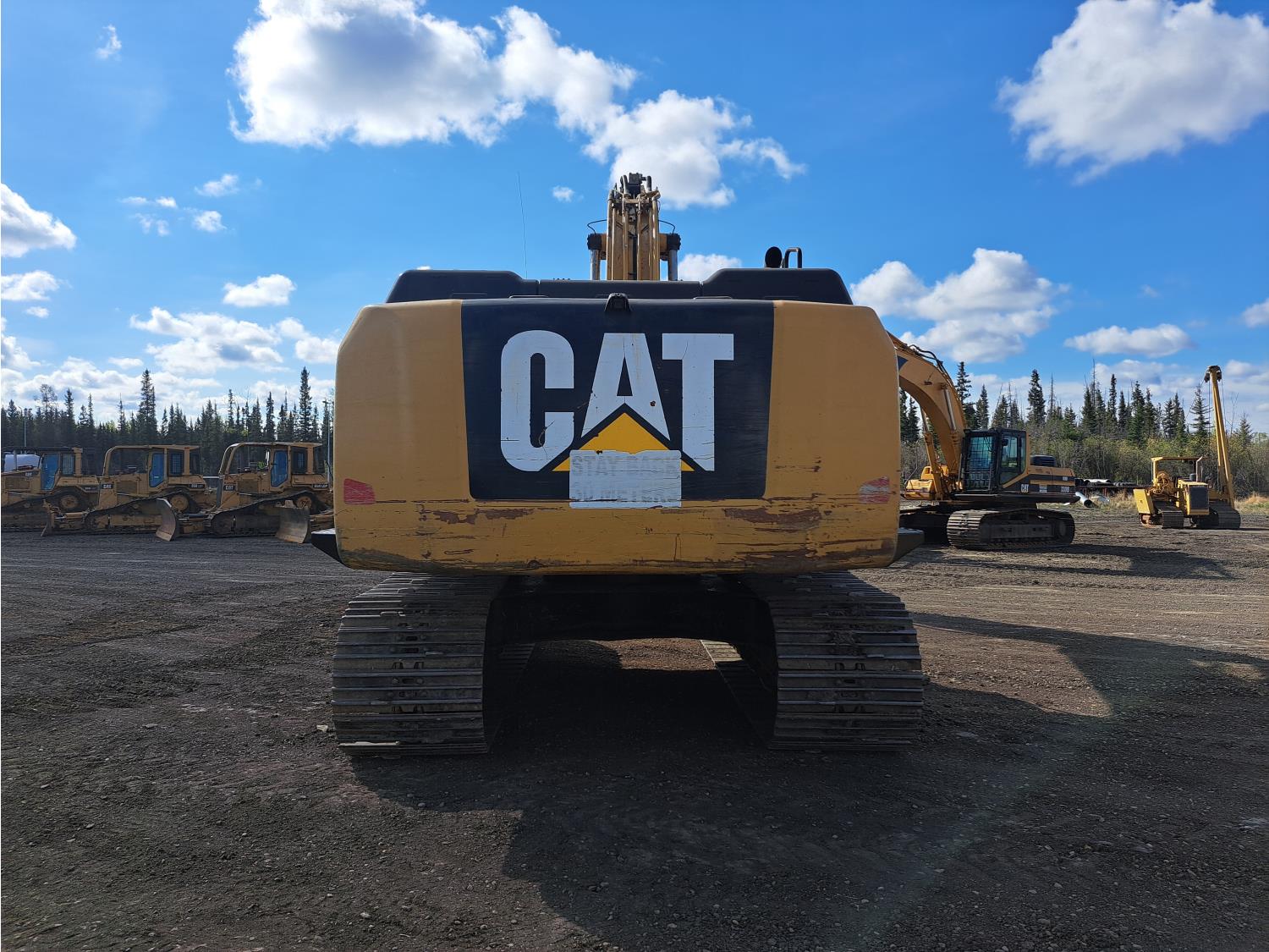 Enclosed cab, A/C, air ride seat, rear view cameras, 48 inch dig bucket, hydraulic thumb, 12 Ft 10 inch stick, catwalks, aux hydraulics, 34 inch track pads, triple grousers