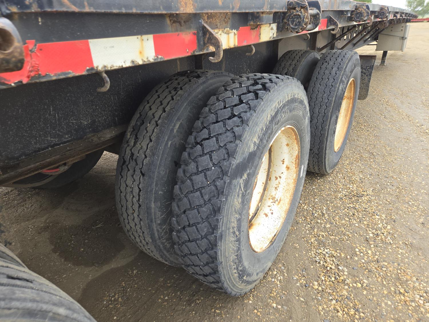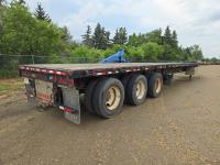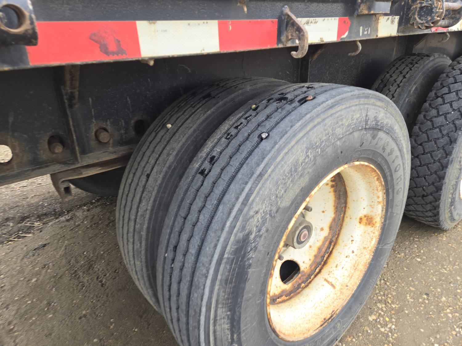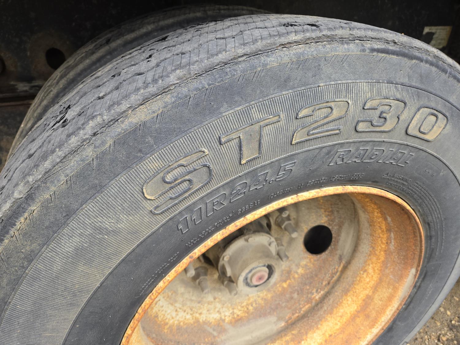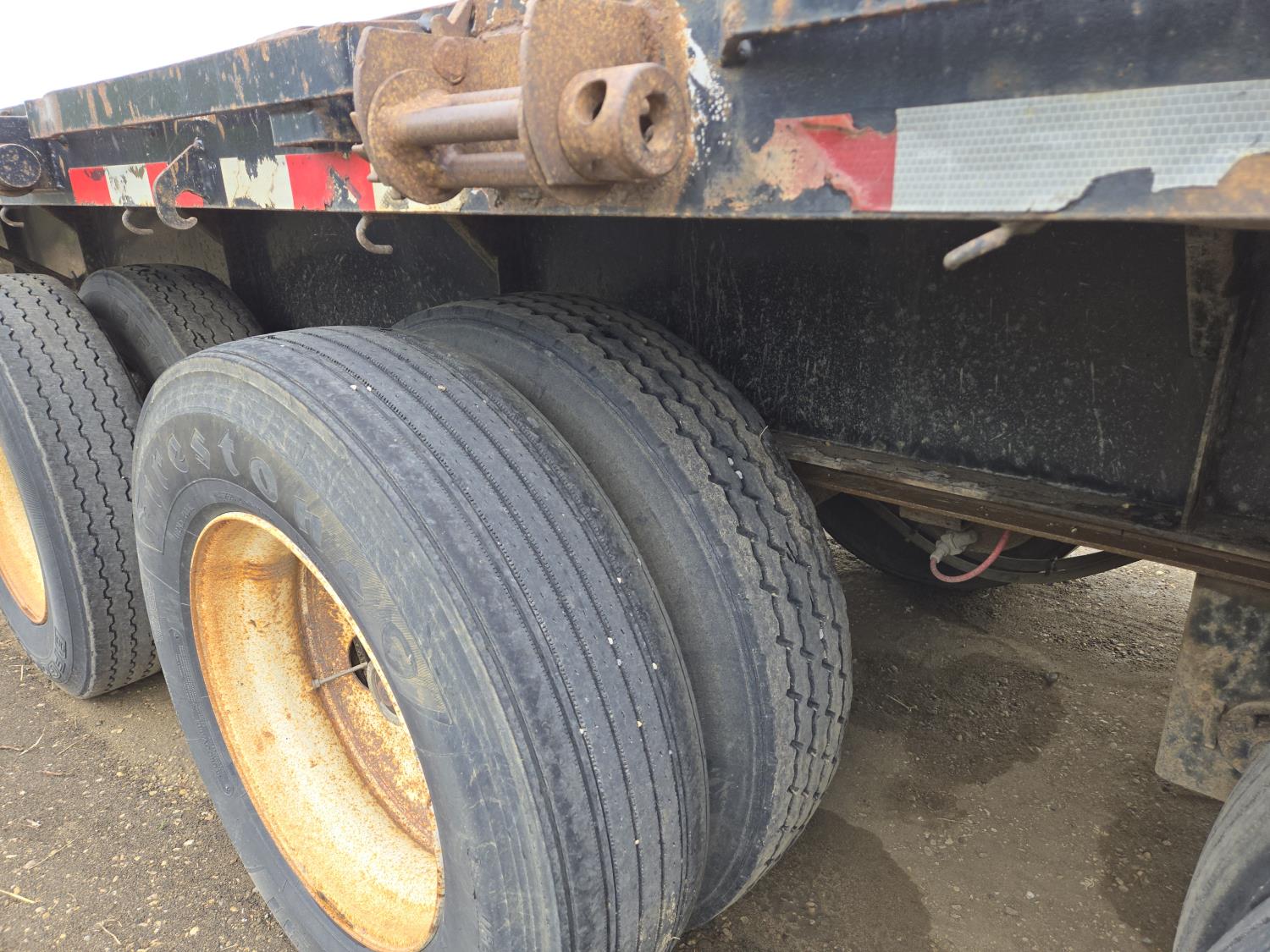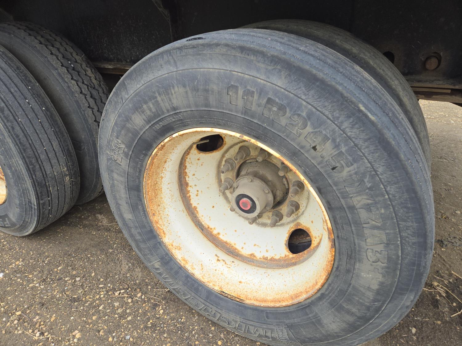 102 inch wide deck, wood deck, stake pockets, rub rails, cargo winches, tool / storage box, Full rear sliding track suspension, air ride suspension, 11R24.5 tires