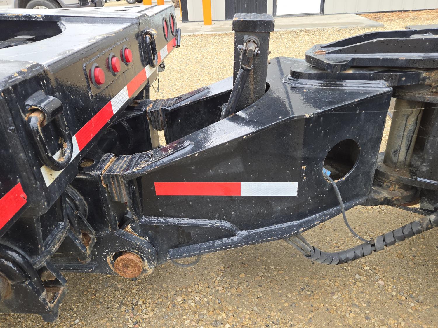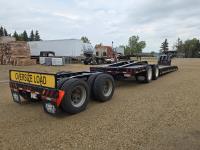 Hydraulic detachable neck, self contained hydraulic system with electric start Honda gas engine, 20X8-1/2 ft main deck, swing out extensions, pin joint main deck, 275/80R22.5 tires on the trailer, 2000 Aspen T/A rear booster, air ride suspension, aluminum wheels, 275/70R22.5 tires