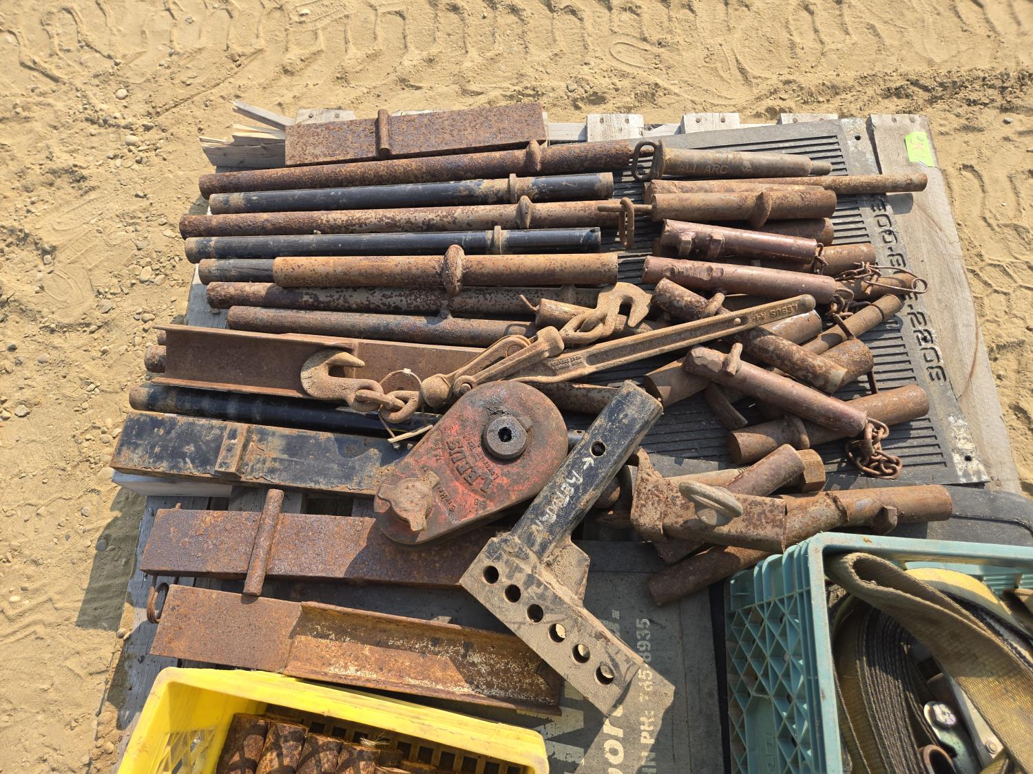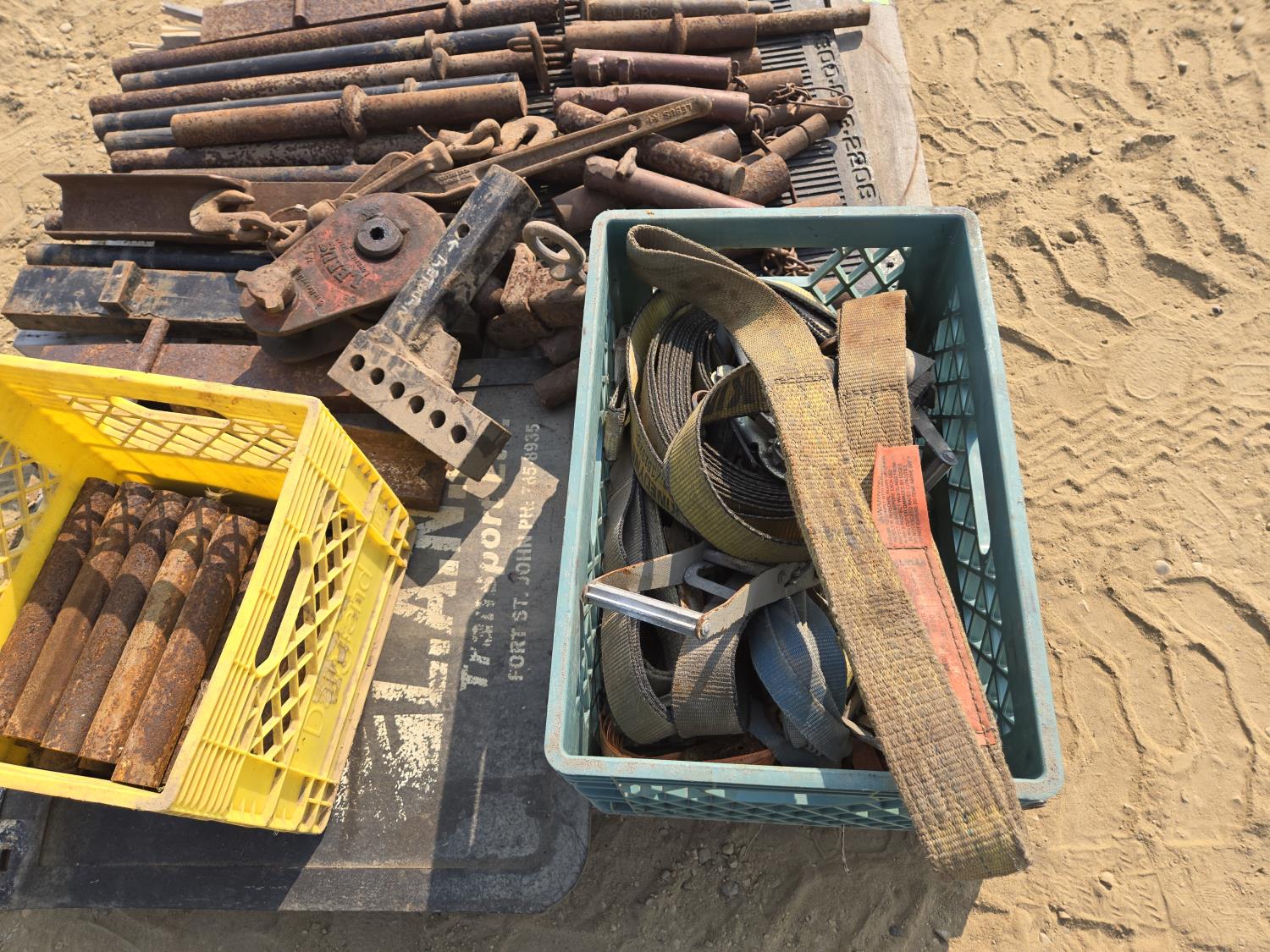 315 Qty of Trailer Pins, Stakes, Ratchet Straps, Snatch Block & (2) Receiver Hitches