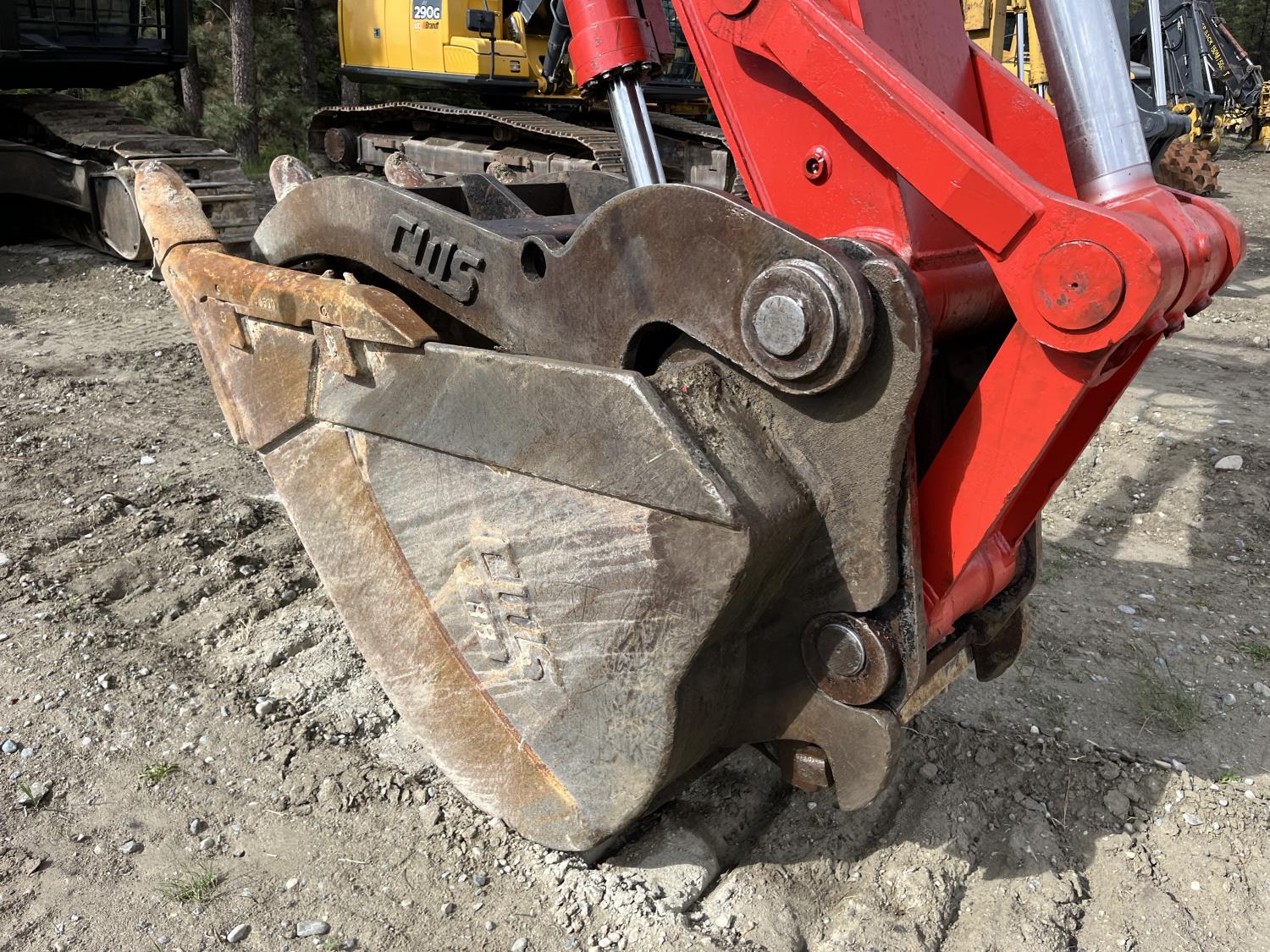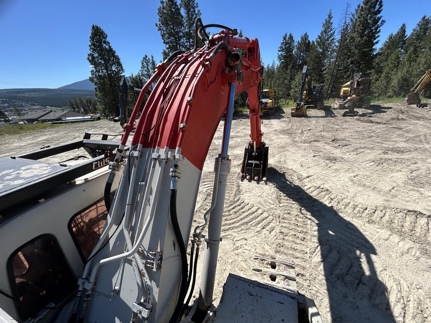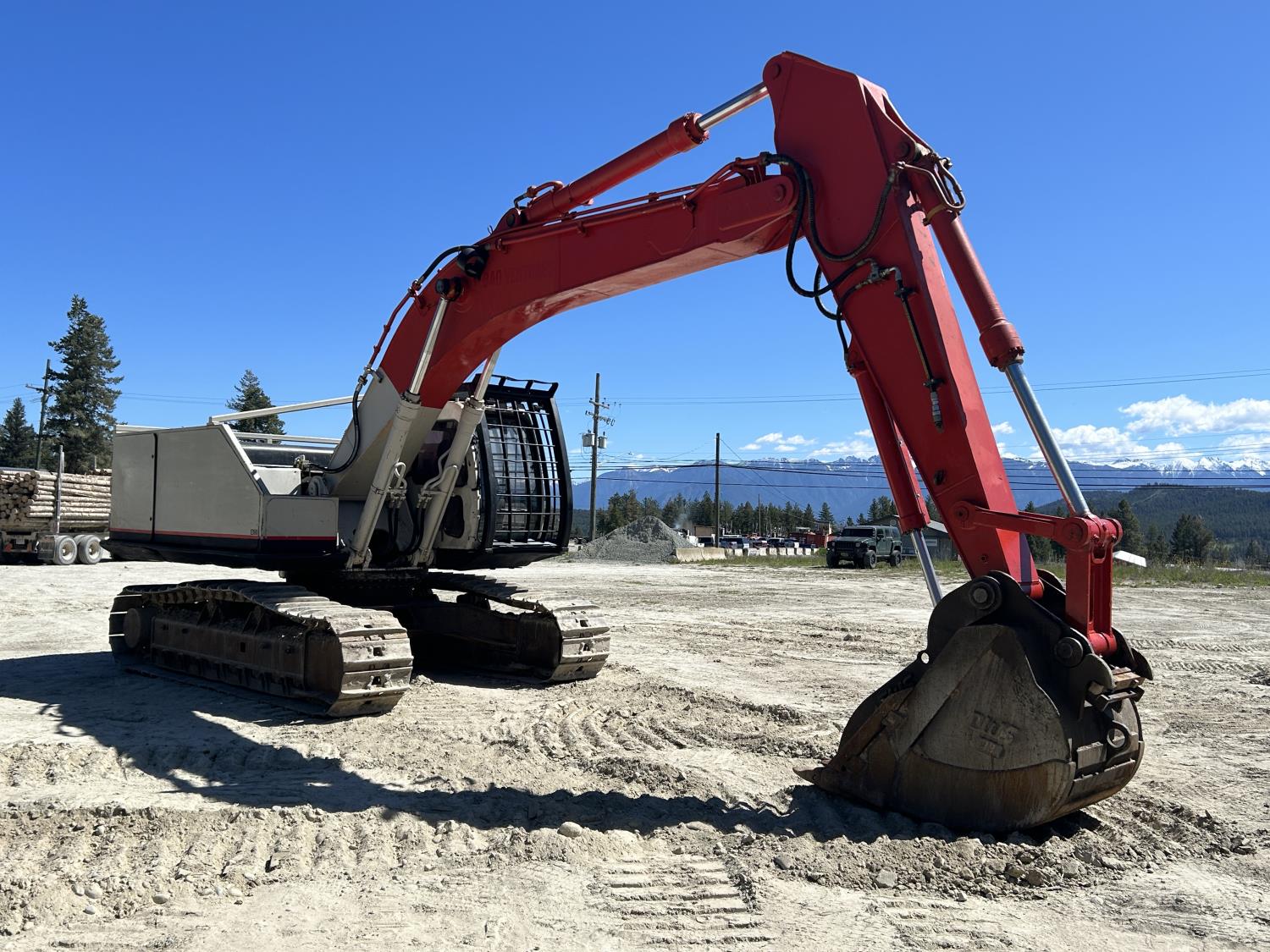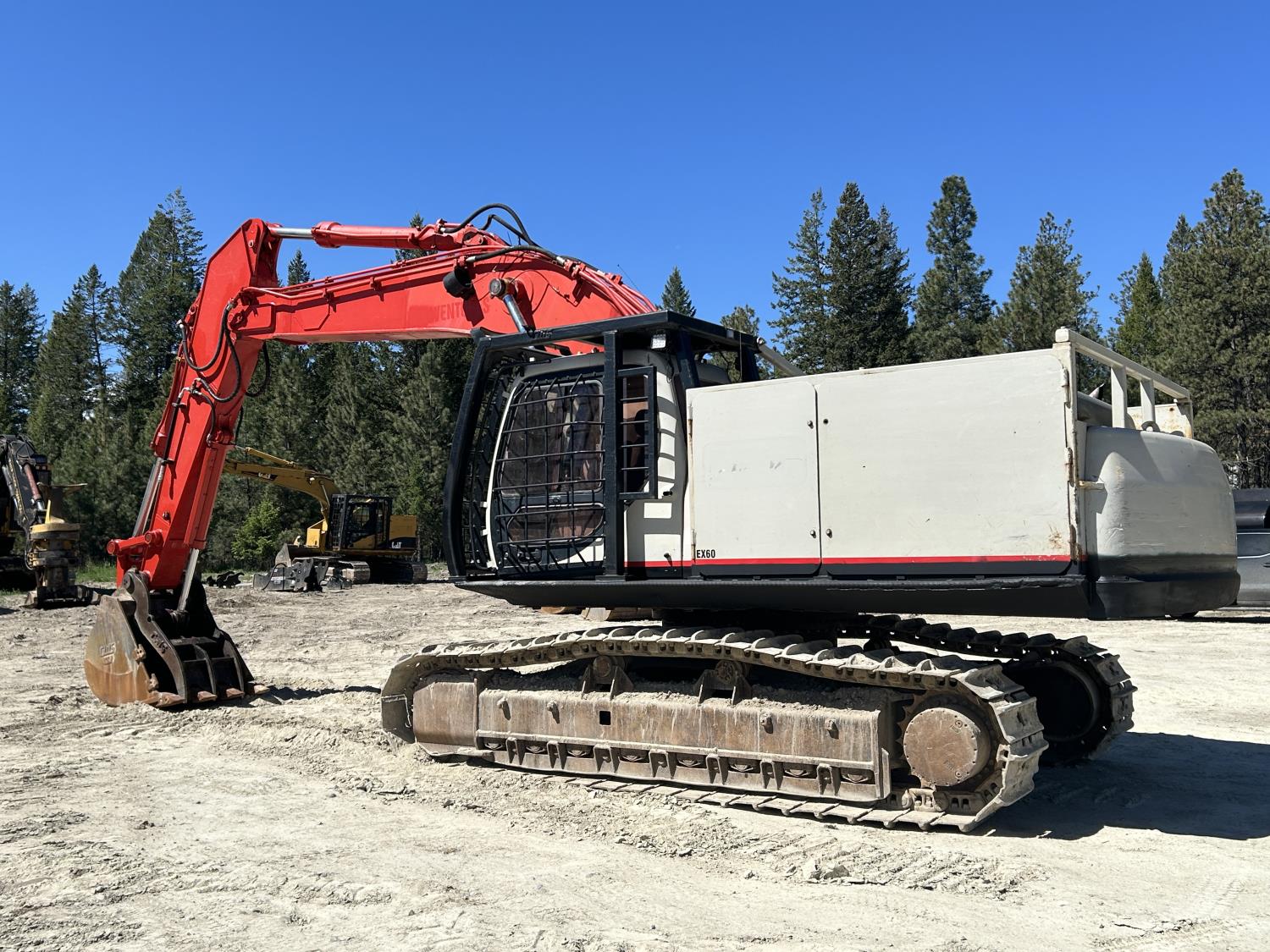 Enclosed cab, A/C, pilot controls, cab screens, 48 inch dig bucket, Q/C coupler, hydraulic thumb, 1 auxiliary hydraulics, 10 Ft 6 inch stick, catwalks, full forestry guarding, 28 inch track pads, triple grousers
