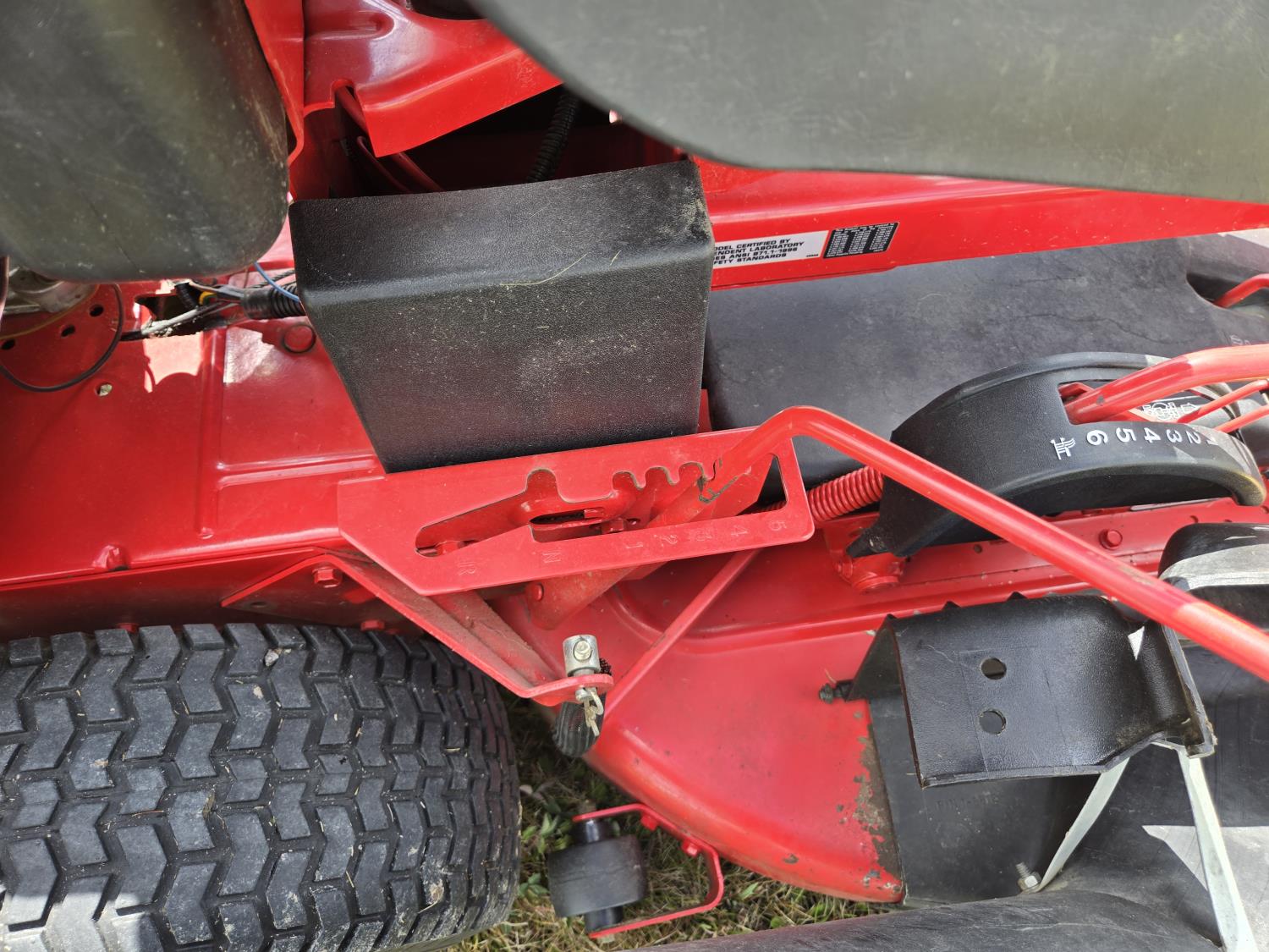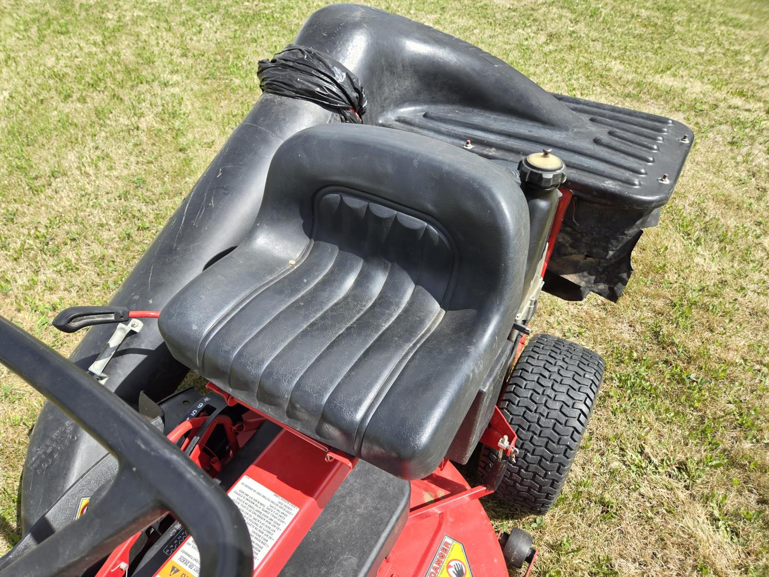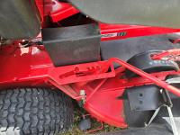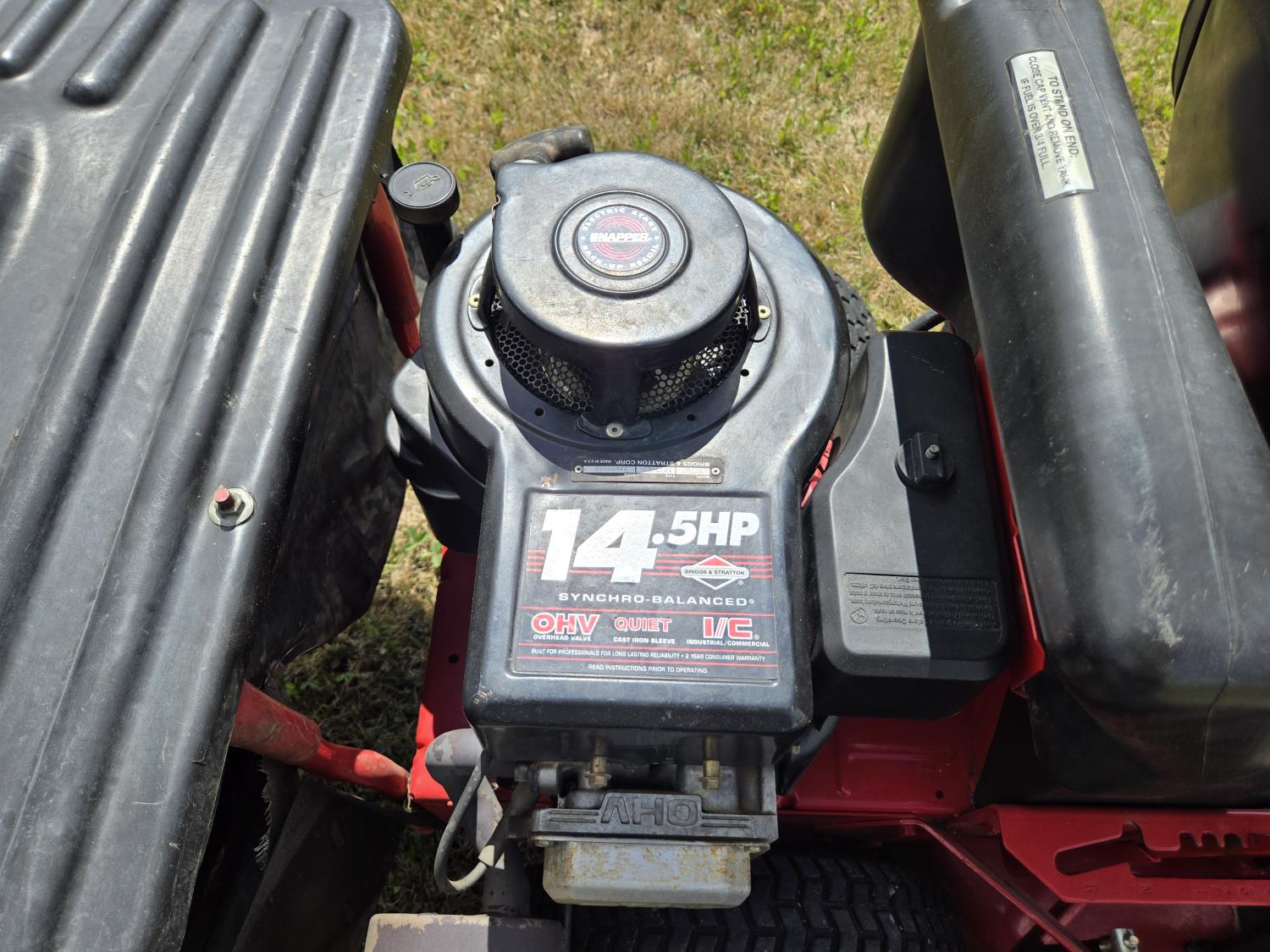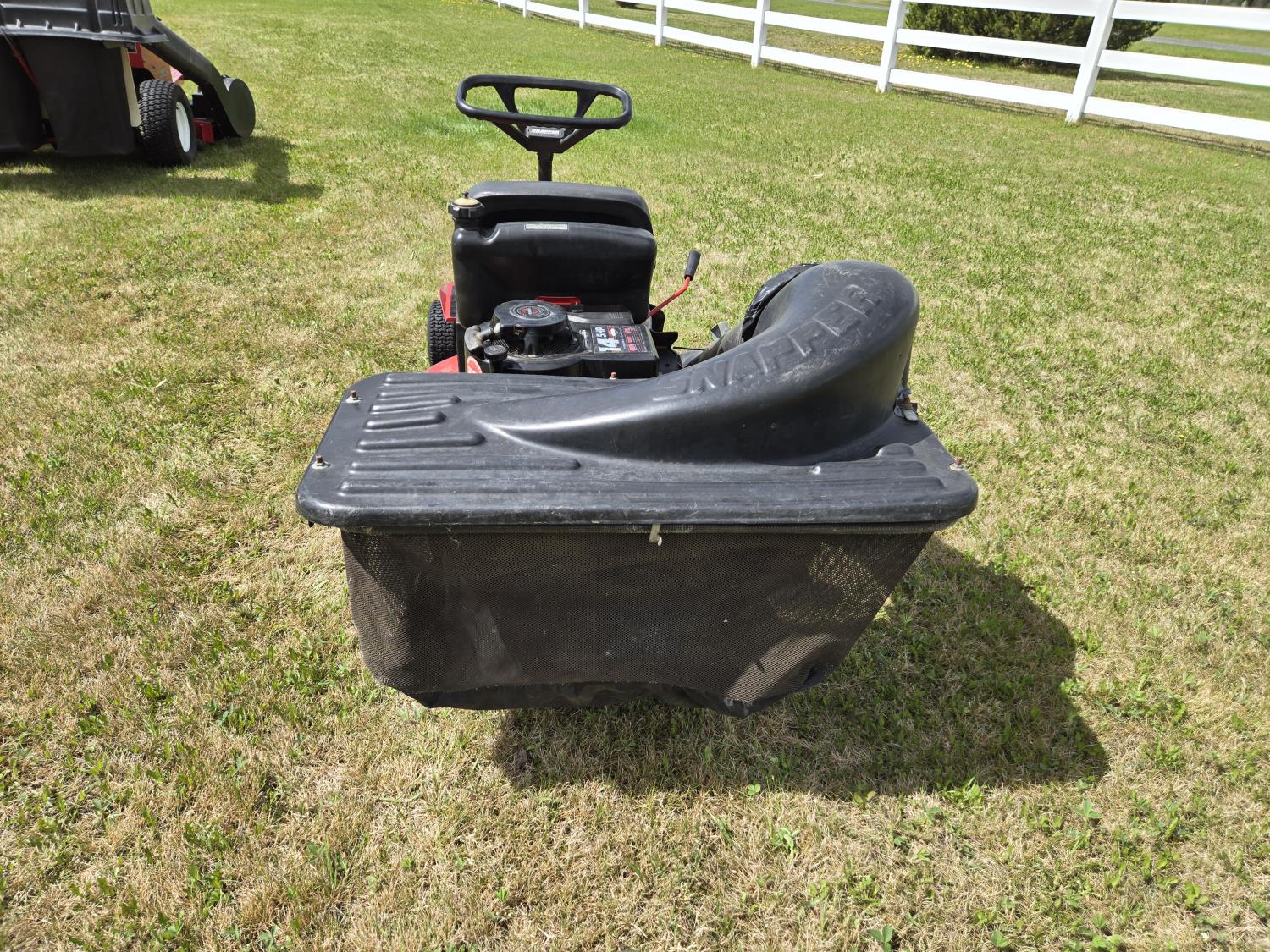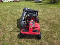 Briggs & Stratton 14 HP single cylinder engine, 5 speed manual transmission, rear bagging system