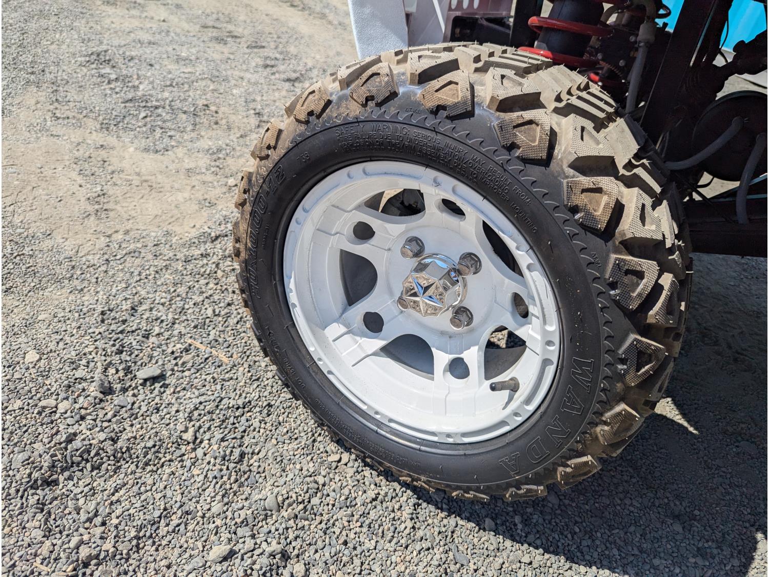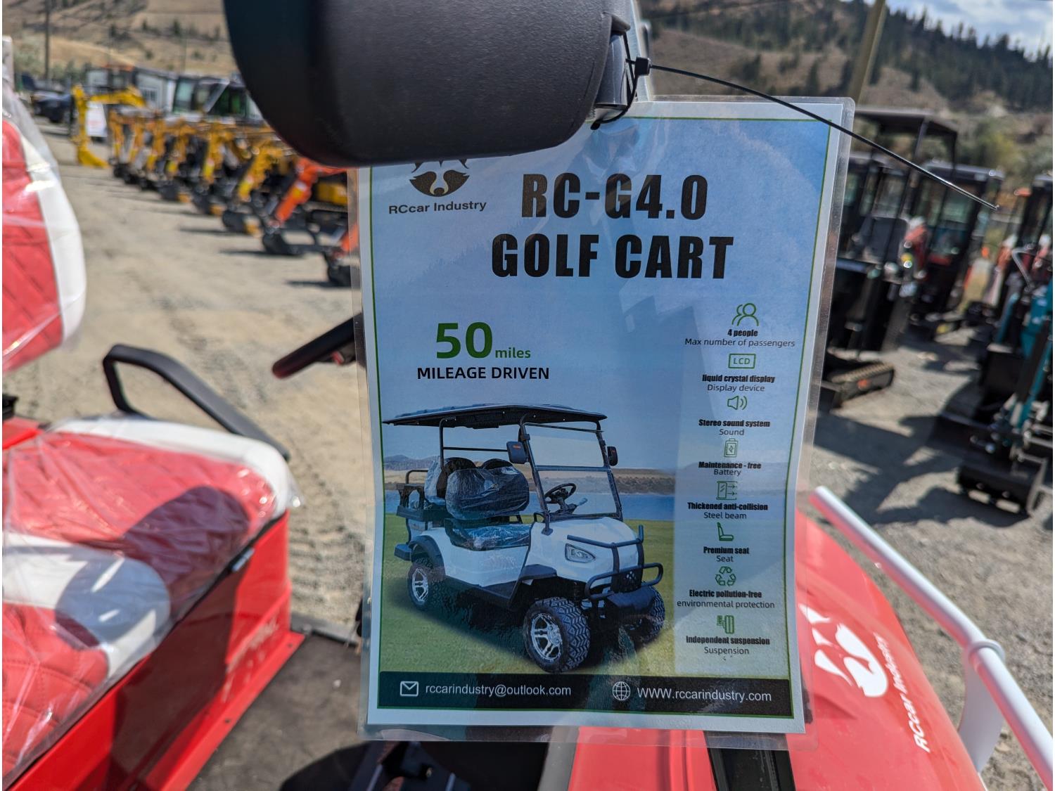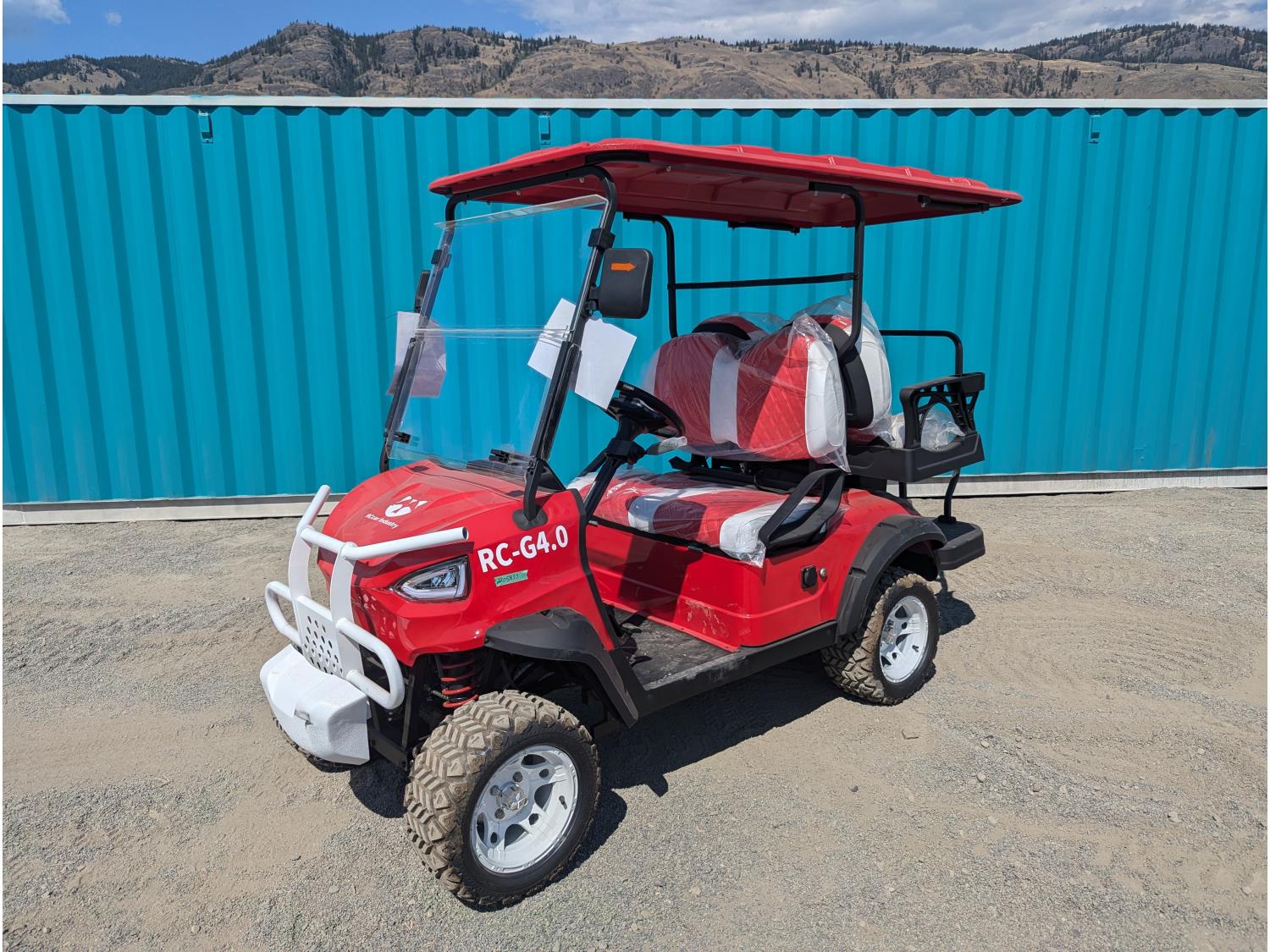 4 passengers, canopy, windshield, reverse, charger, backup camera, 80km range, 38kph top speed, 4000 watt motor, 20X10.00-12 tires