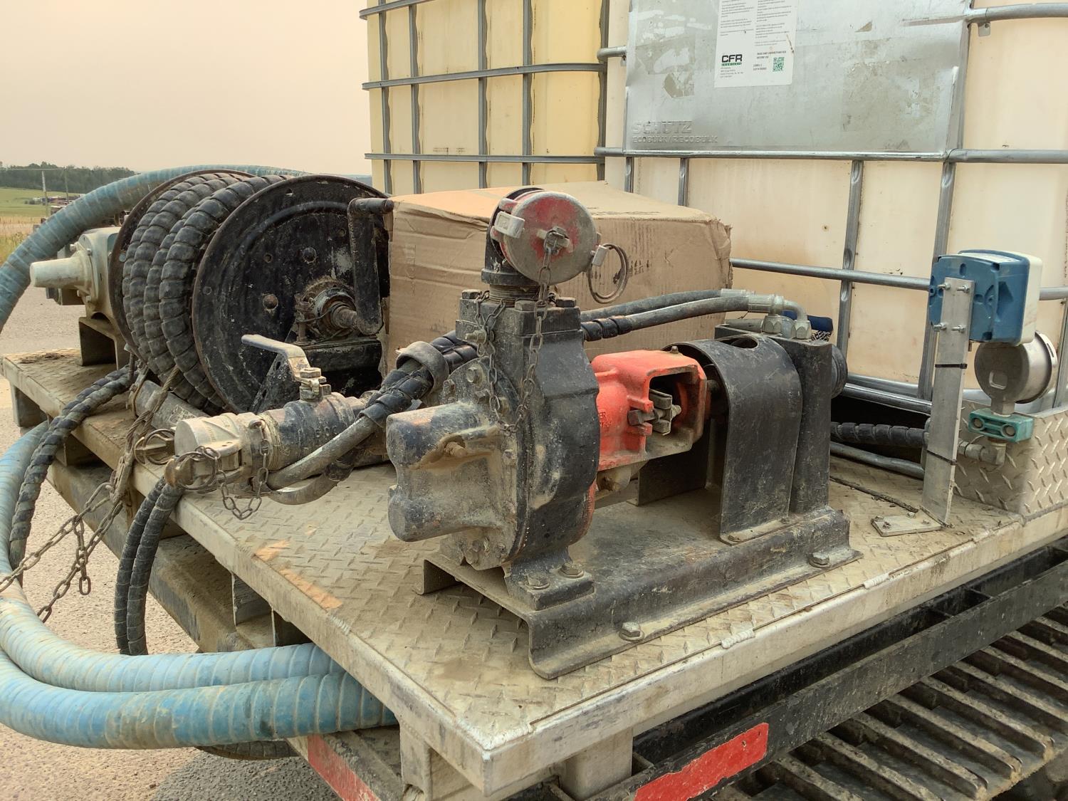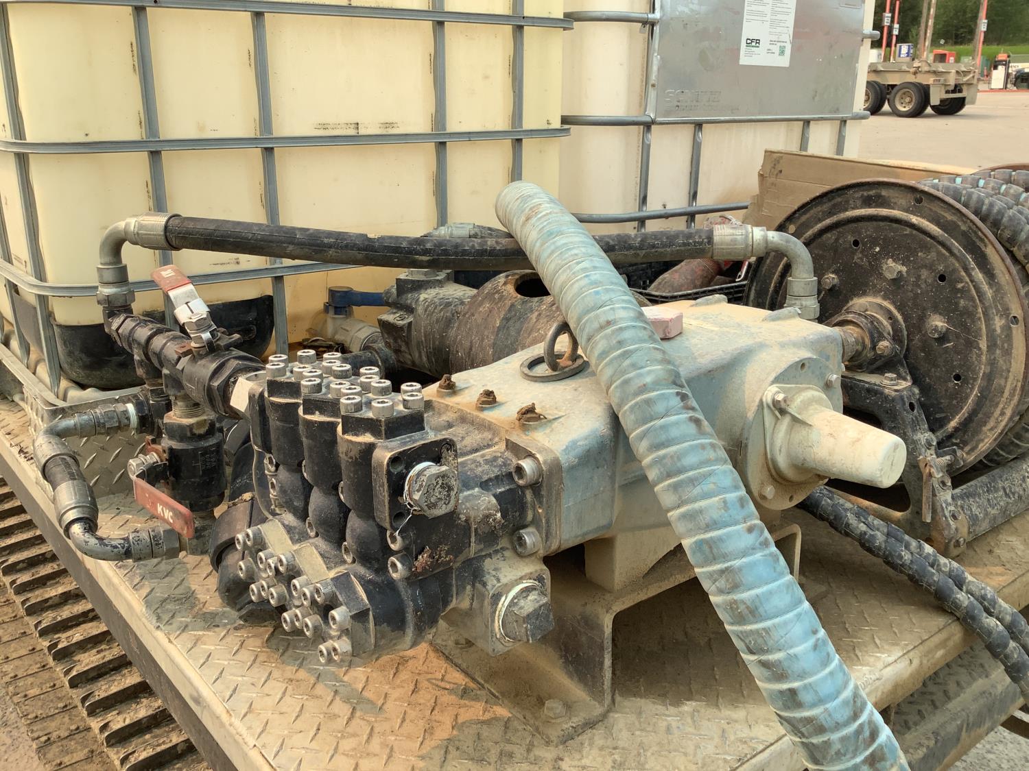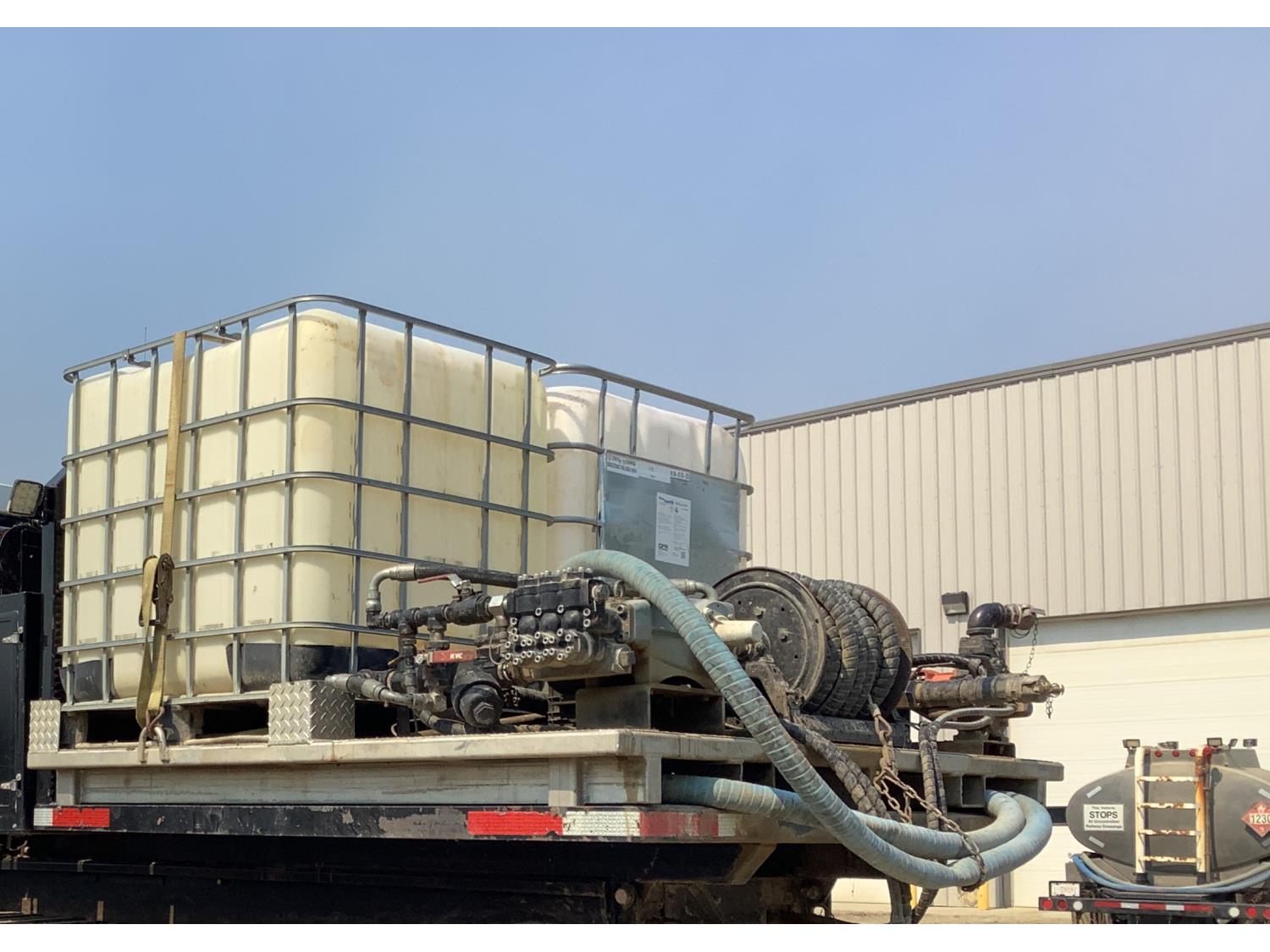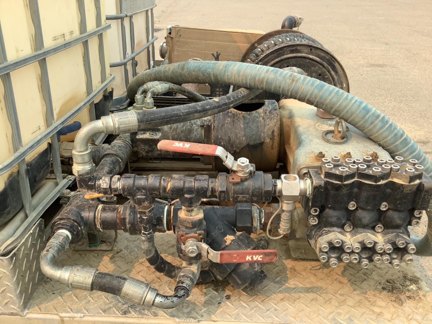 Specs are Max pumping pressure of cat pump 4000PSI, max testing pressure for cat pump 5000 PSI, pumping rate 60 Liter per minute, Hydraulic drive 2 inch roper pump 200 liters per minute, water capacity 2000 liters.
