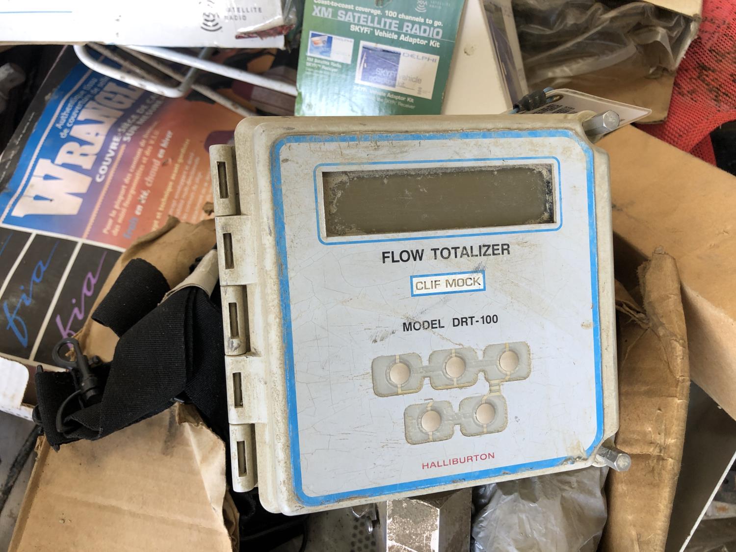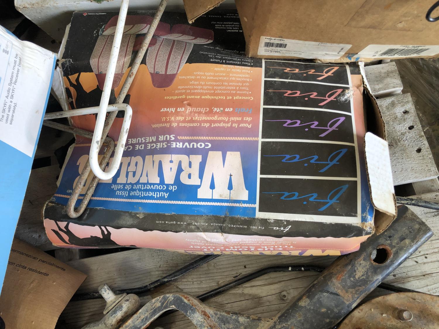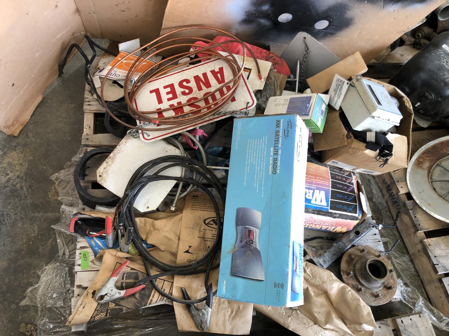 Booster cables, Delphi SKYFi vehicle audio system, Delco XM satellite radio (unused), vehicle conversion kit, 1 inch x 10 ft roller chain (unused), Wrangler seat covers (unused)