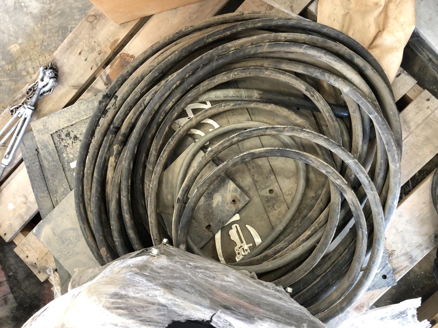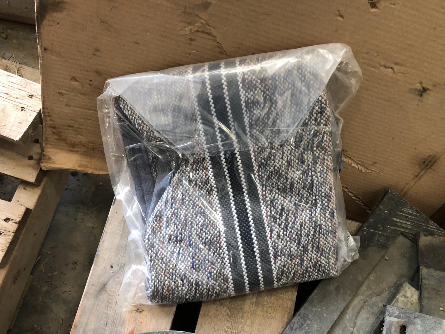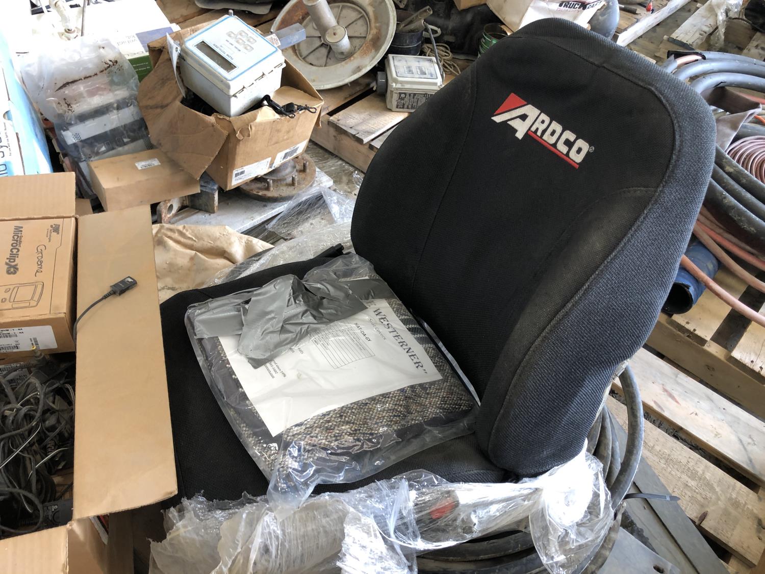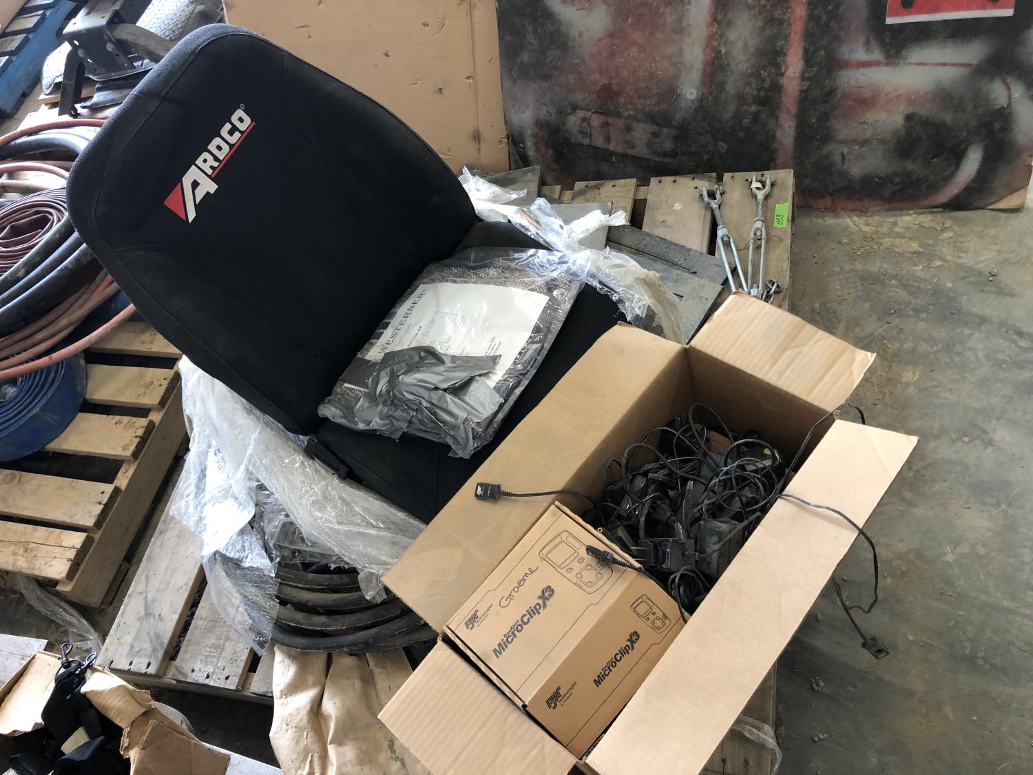 (11) Microclip X3 chargers, (2) 30 inch x 24 inch heavy duty mud flaps, 1/2 inch hydraulic hose, Ardco vehicle seat, seat covers, (2) adjustable links